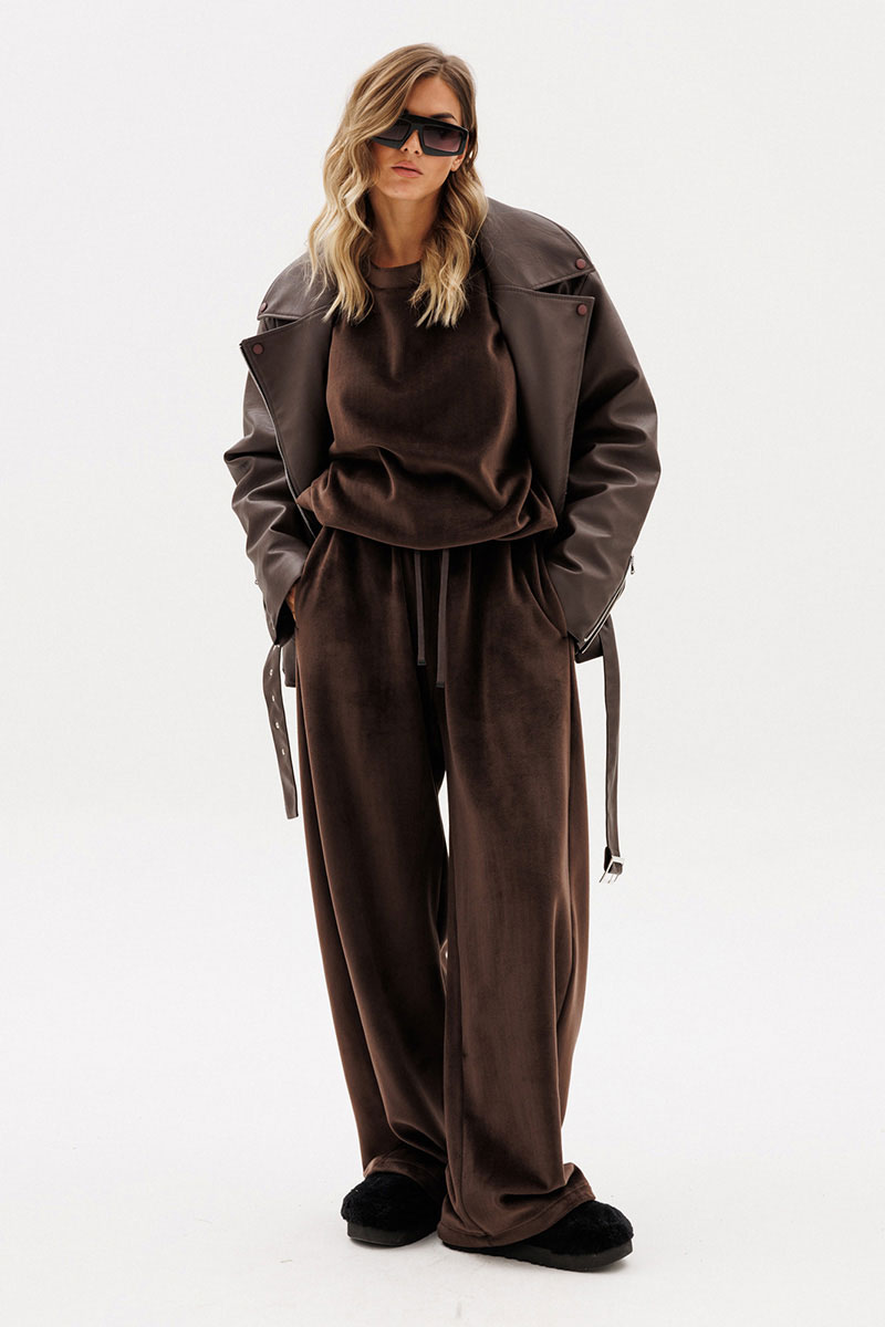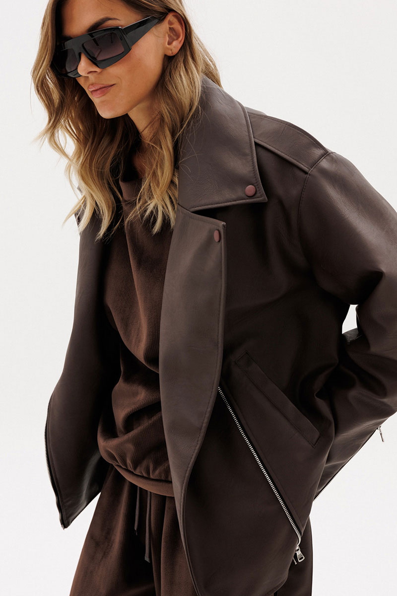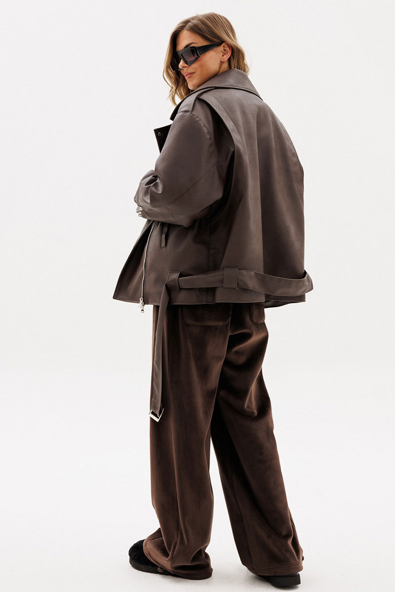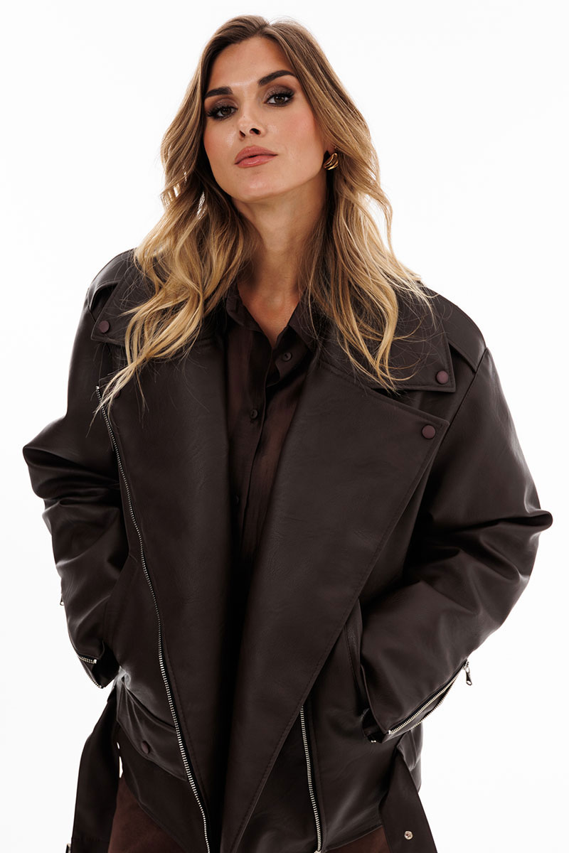 Куртка выпонена из экокожи. Куртка прямого силуэта, покроя "oversize". Спереди прорезные карманы, лацканы, один клапан справа, и смещенная застежка на молнию. На спинке фигурные подрезы от плечевого шва до боковых. Вортник пиджачного типа. Плечевой шов удлинен. Рукав рубашечного покроя, двухшовный. В заднем шве рукава молния с металлическими звеньями. В окаты вставлены погоны, по низу куртки протянут пояс из основной ткани с металлической пряжкой. На концах воротника, лацконов, по погонам и клапану пробивные кнопки. Куртка на утепленной притачной по низу подкладке.