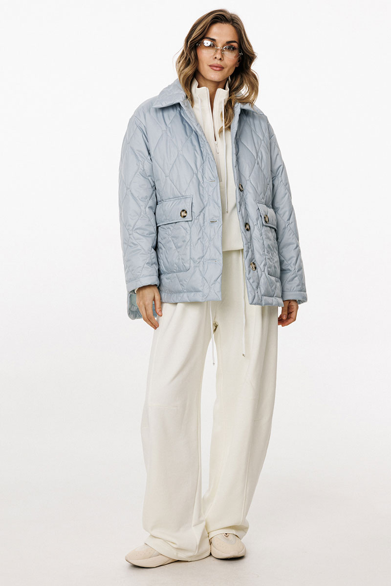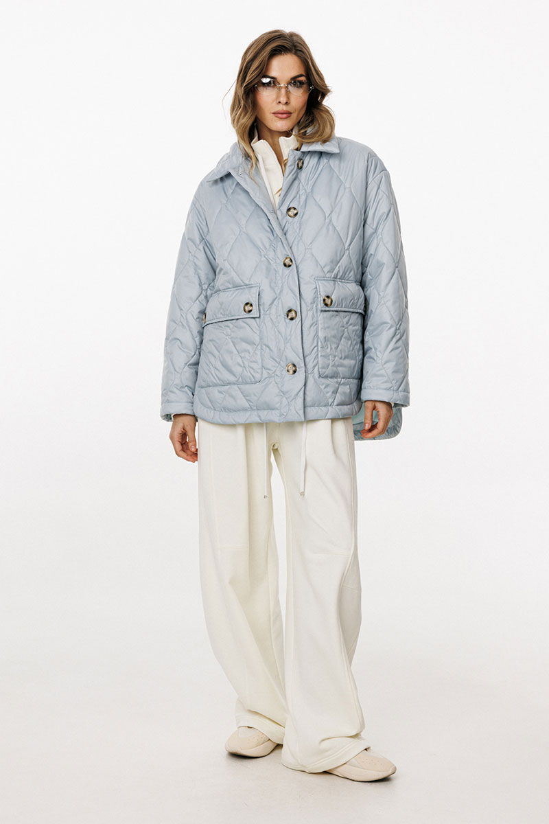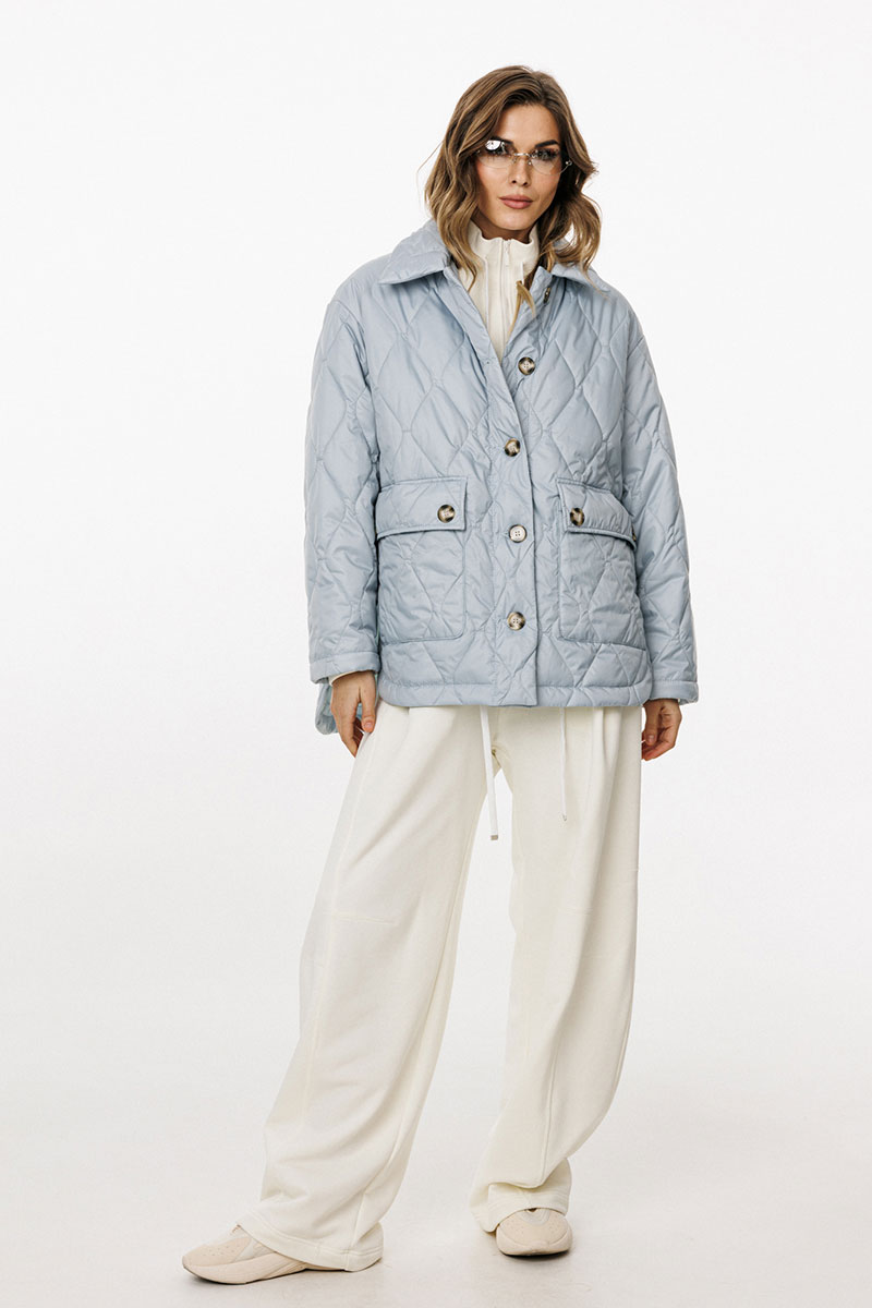 Куртка выполнена из плащевой ткани, простеганной с Isosoft. Куртка прямого силуэта, длиной до линии бедер. Застежка центральная бортовая на пришивные пуговицы. Спереди накладные карманы с клапанами. Спинка цельная. Воротник стояче-отложной. Рукав втачной, двухшовный. Плечевой шов спущен. Пройма углублена. Спинка длиннее переда. В боковых швах фигурные разрезы.