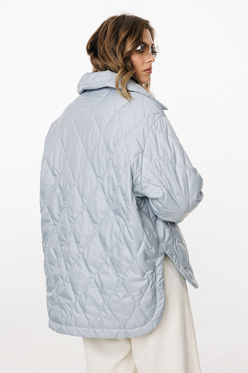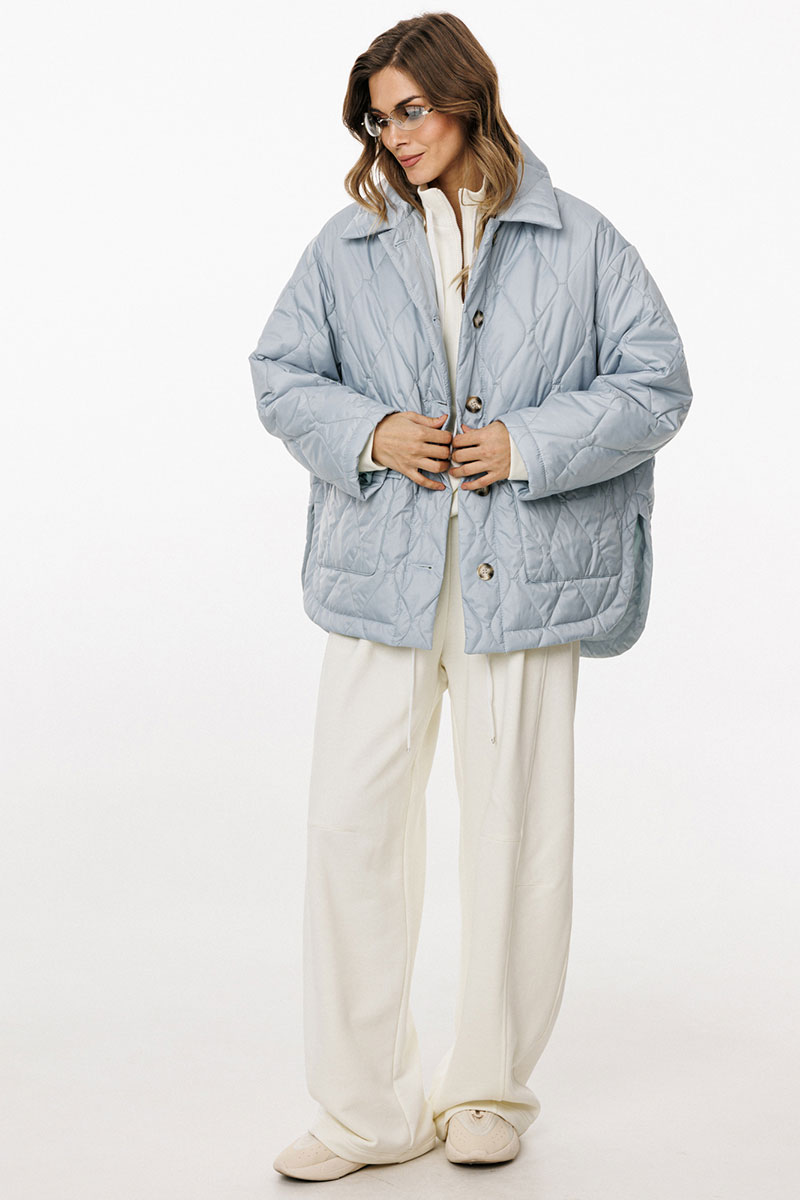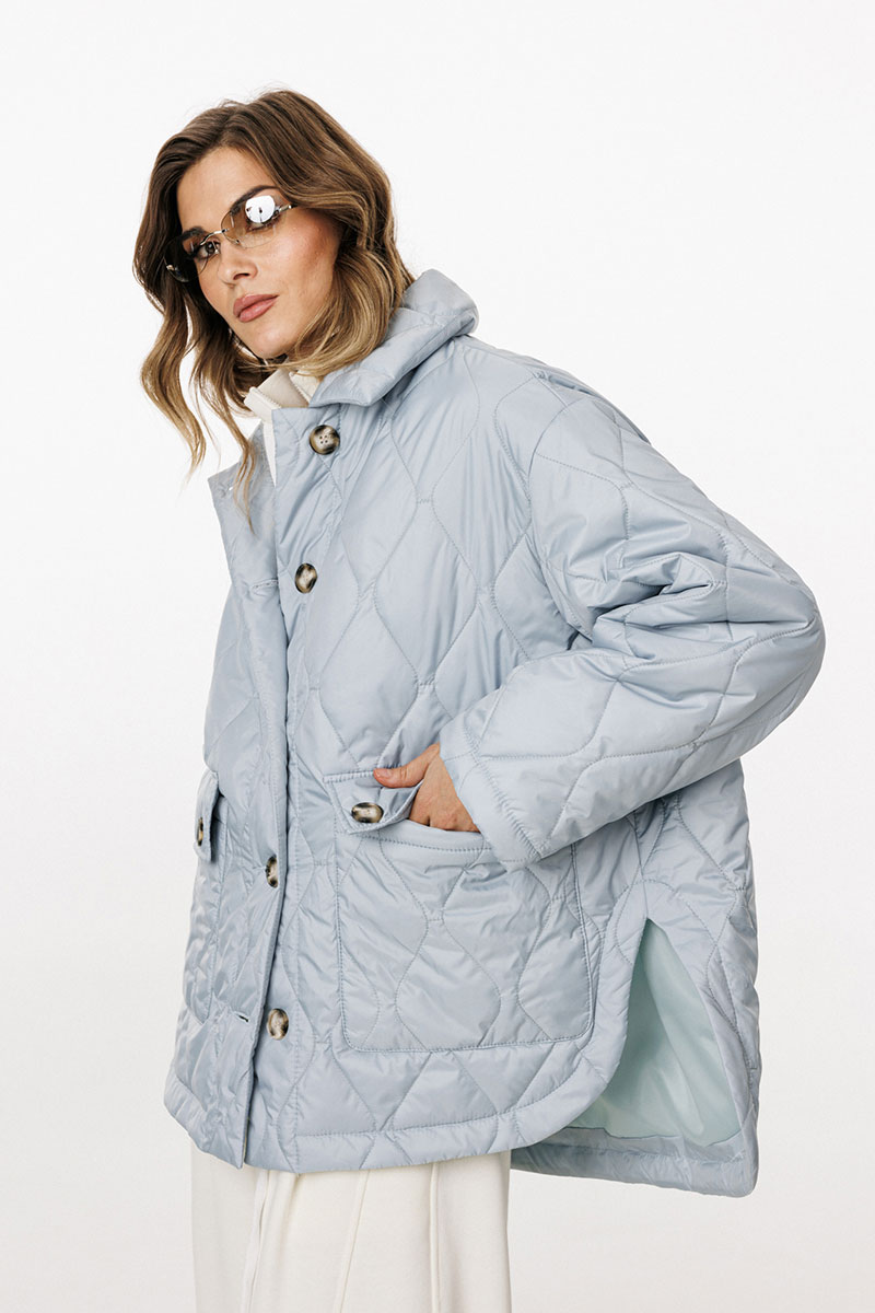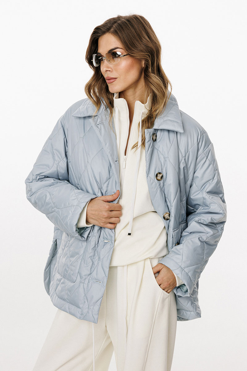 Куртка выполнена из плащевой ткани, простеганной с Isosoft. Куртка прямого силуэта, длиной до линии бедер. Застежка центральная бортовая на пришивные пуговицы. Спереди накладные карманы с клапанами. Спинка цельная. Воротник стояче-отложной. Рукав втачной, двухшовный. Плечевой шов спущен. Пройма углублена. Спинка длиннее переда. В боковых швах фигурные разрезы.