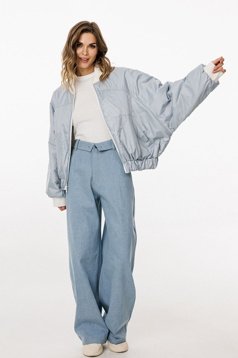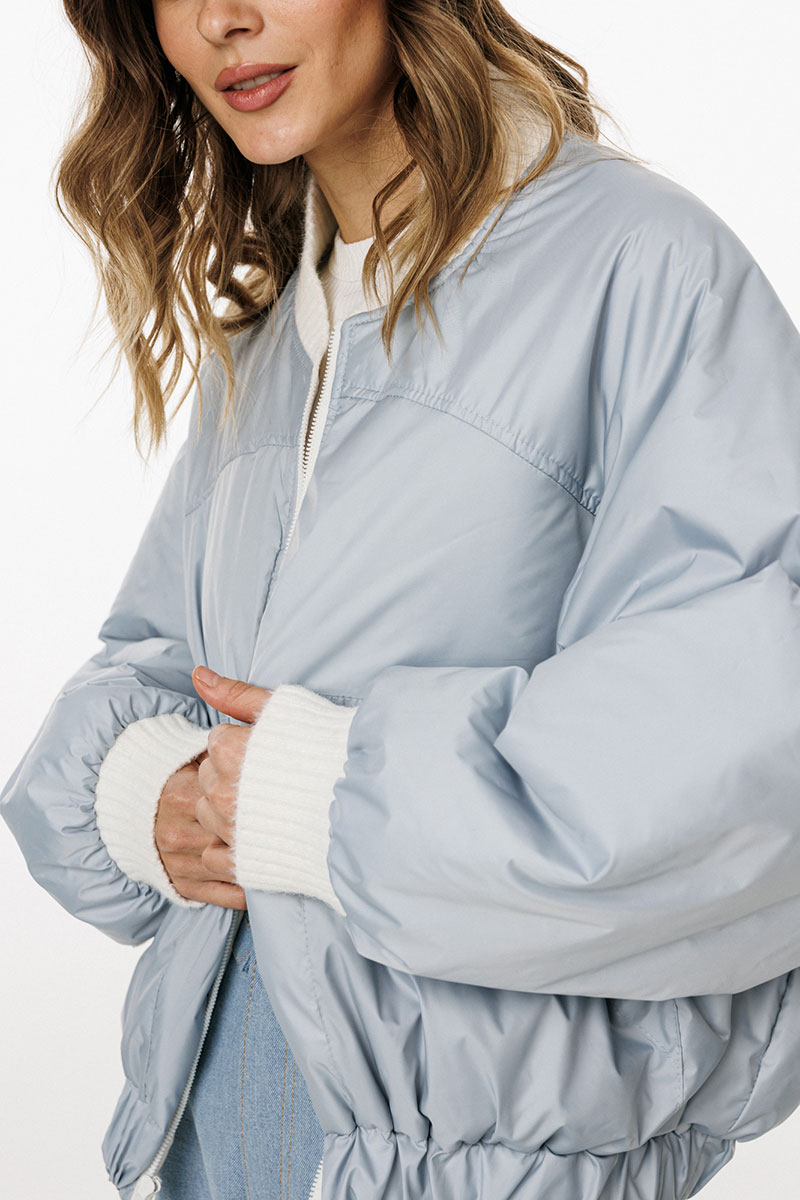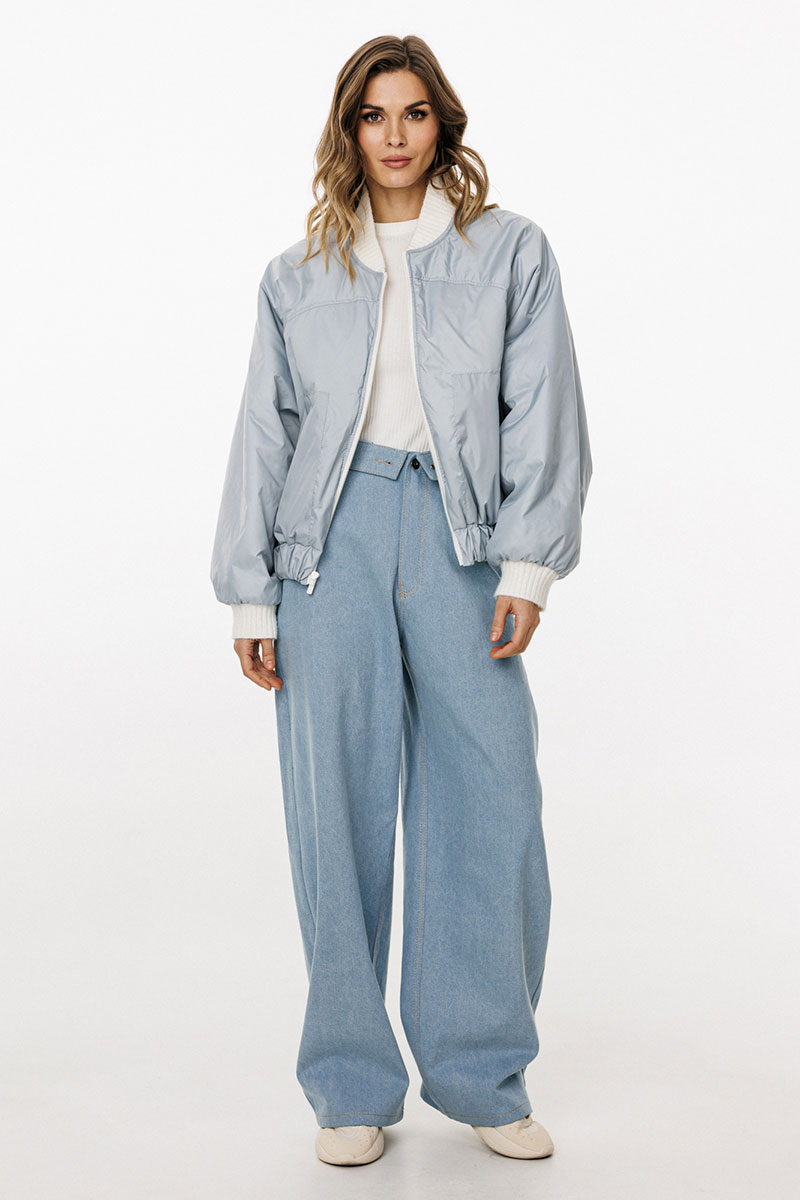 Куртка выполнена из плащевой ткани с утеплителем Isosoft. Куртка О-образного силуэта, длиной выше линии бедер. Куртка двусторонняя. Спереди застежка на молнию и карманы. Рукав покроя кимоно переходящий в кокетки спереди и по спинке. Низ рукава на притачной манжете из трикотажного довяза. Горловина округлой формы с вортником-стойкой из трикотажного довяза. Низ куртки на притачном поясе с эластичной тесьмой внутри. Одна из сторон куртки декорирована на спинке нашивкой из натуральной кожи.