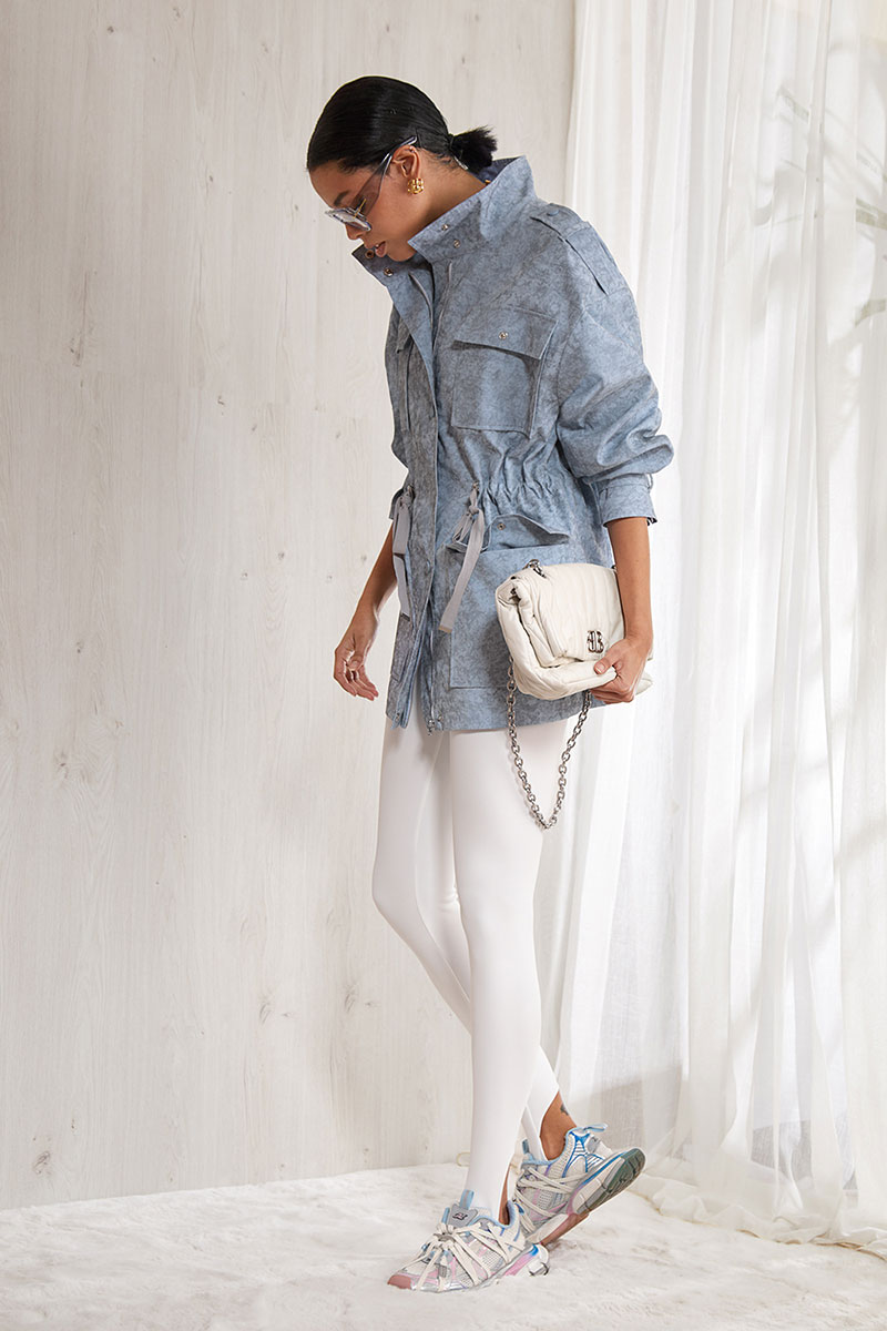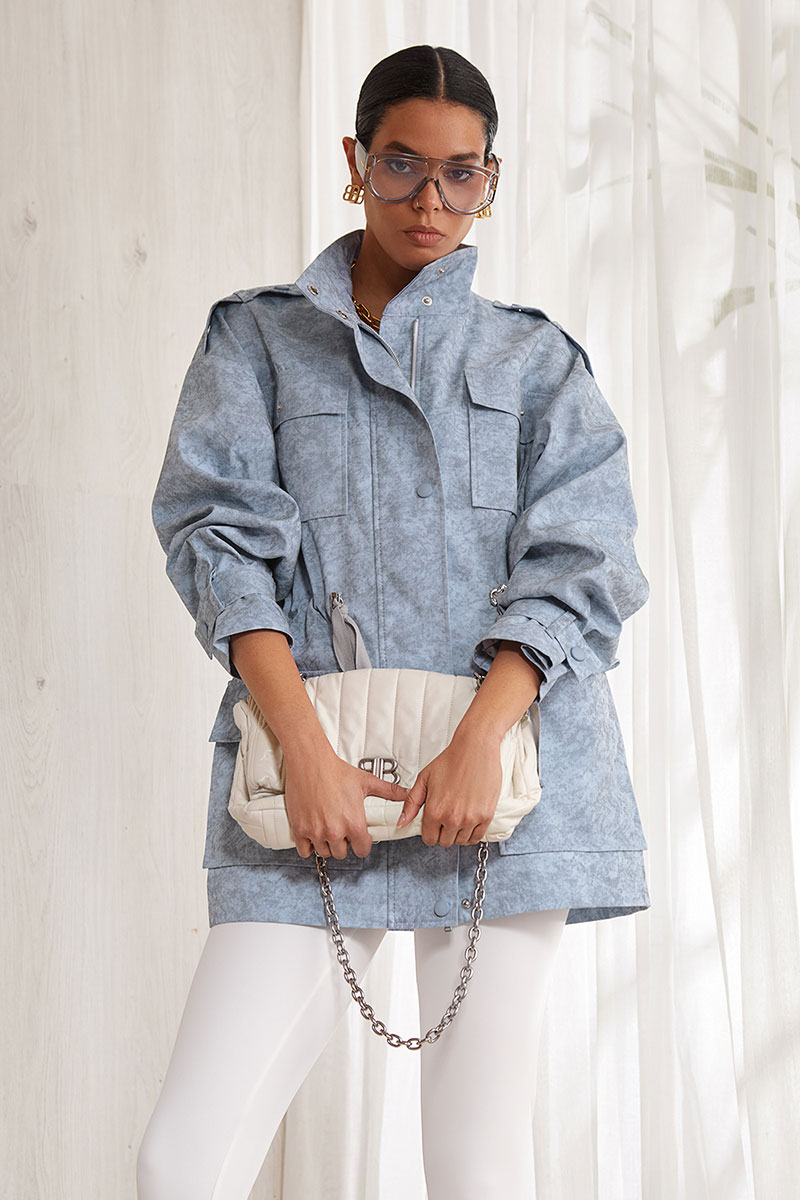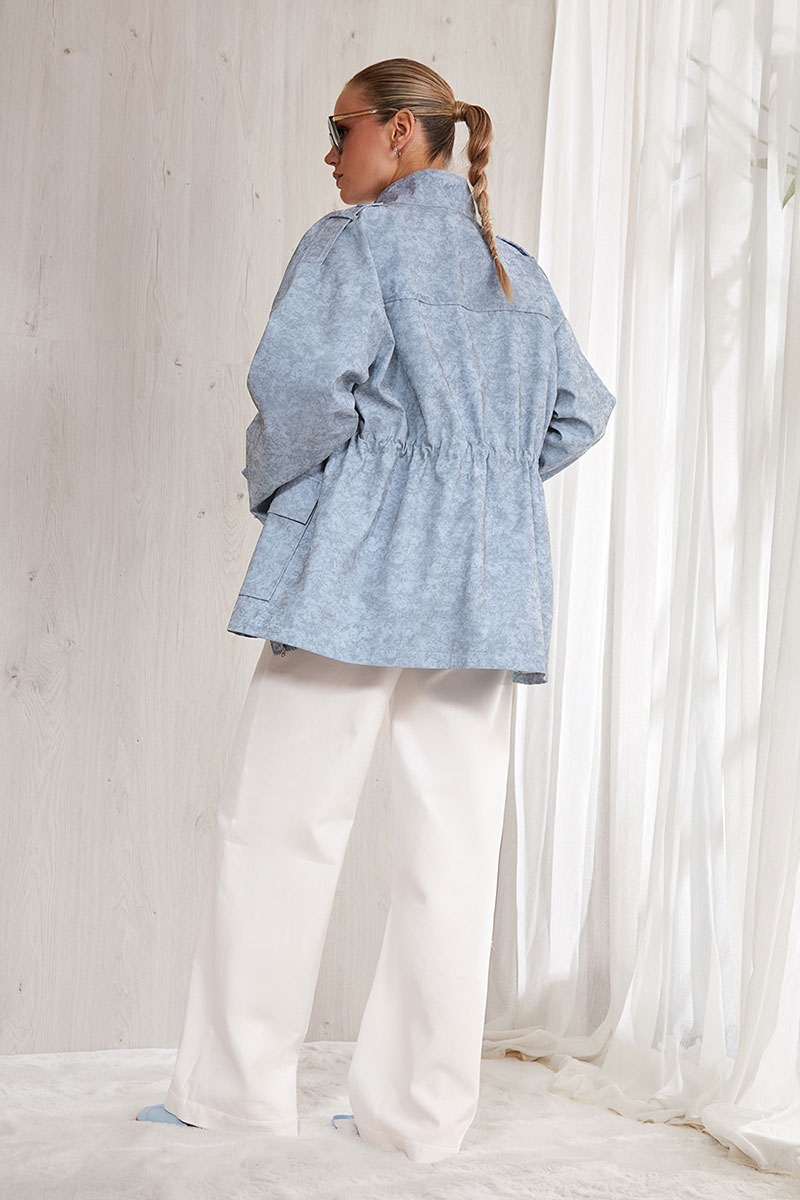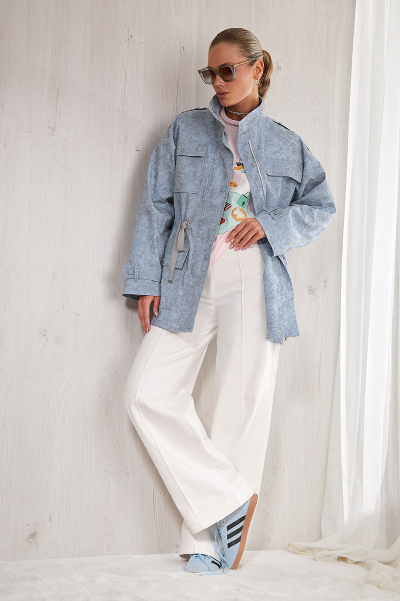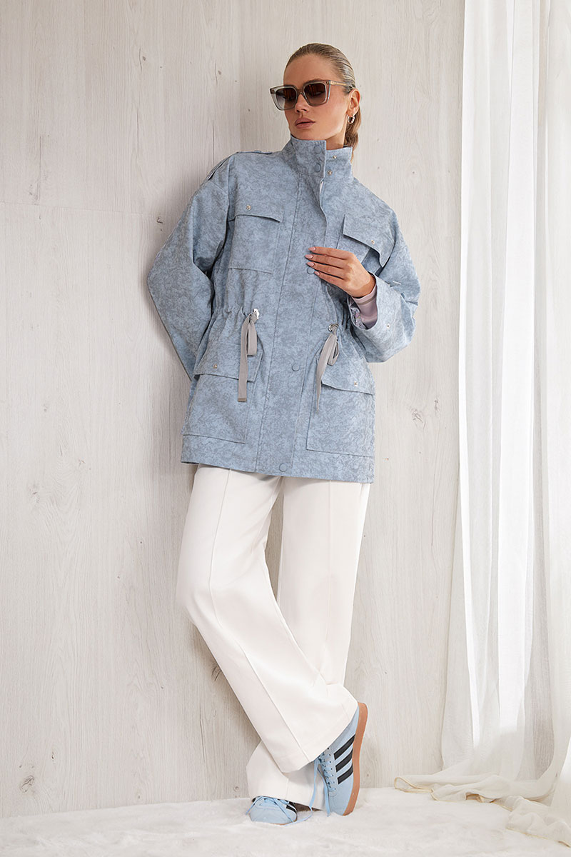 Куртка прямого силуэта, длиной ниже линии бедра. Центральная бортовая застежка на молнию и дополнительно изделие застегивается на кнопки. На полочке накладные карманы с клапанами. Спинка прямая с отрезной кокеткой. По талии выполнена кулиса, в которую вставлена резинка, для регулировки изделия по фигуре и декоративные шнурки. Спущенная линия плеча. Длинный прямой рукав с декоративными патами. По линии плеча вставлена декоративная пата. Воротник - высокая стойка.