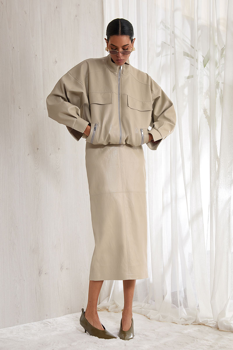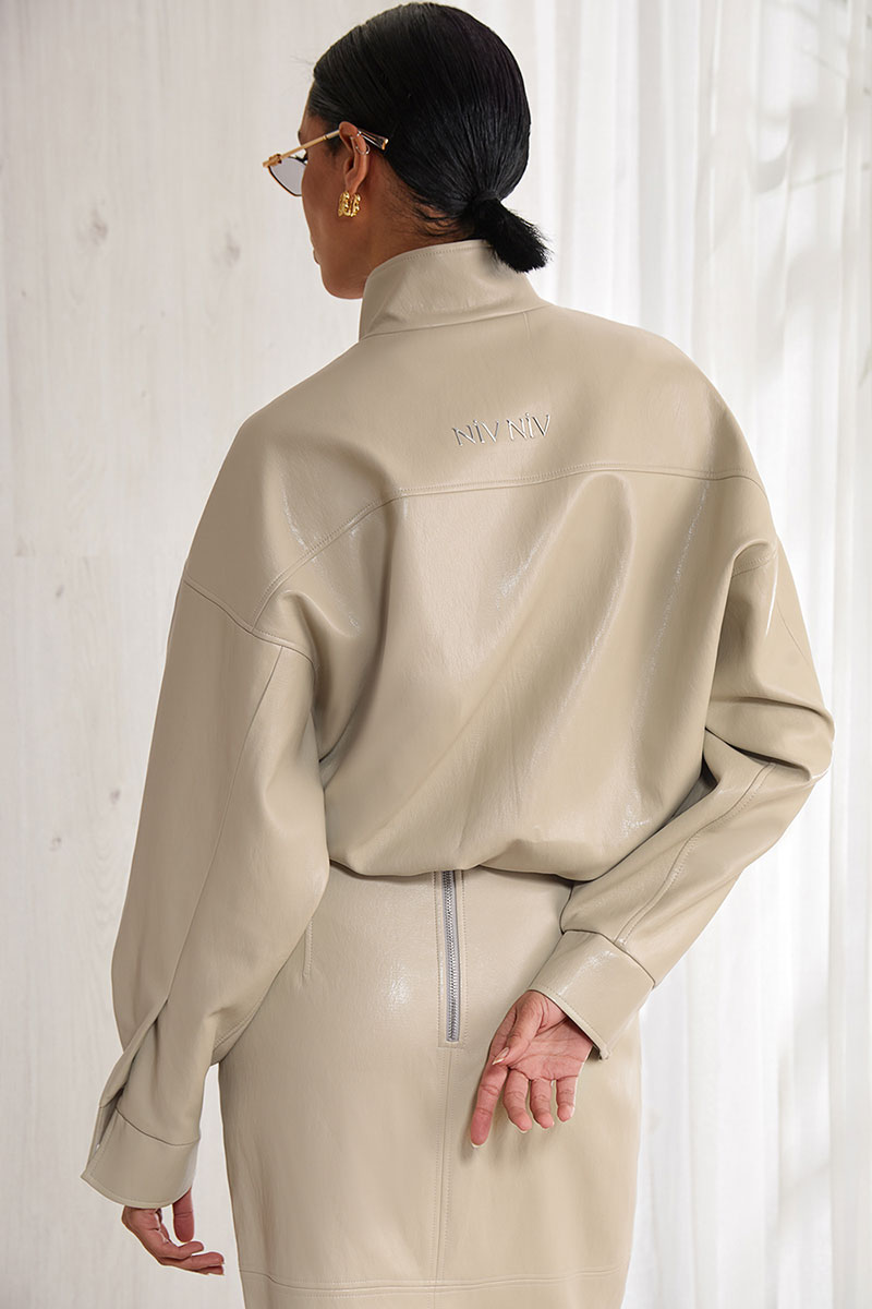 Мег стильная, объемная, укороченная куртка в стиле Casual, выполнена из мягкой экокожи, прямого силуэта, на вискозной авторской подкладке. Изделие на молнии. По переду прорезные карманы с листочками и декоративными молниями, горизонтальная фигурная кокетка, в которую вставлены декоративные клапаны. По плечу фигурные кокетки, переходящие на спинку. Спинка с фигурной кокеткой. Низ изделия на резинке. Рукав спущенный, рубашечный, длинный. Низ рукава на манжете. Воротник-стойка. На спинке лого.