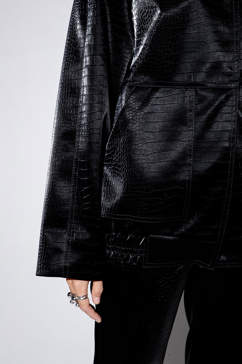 Куртка-бомбер из фактурной экокожи кожи с анималистичным рисунком. Детали: прямой силуэт, воротник-стойка, пояс переда и спинки на резинке, застежка на потайные металлические кнопки, рукава длинные с высокими обтачками по низу, которые при необходимости можно подвернуть; большие накладные карманы по переду, спинка со средним швом, куртка на подкладке.