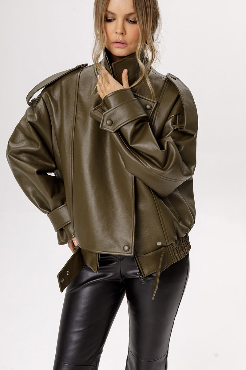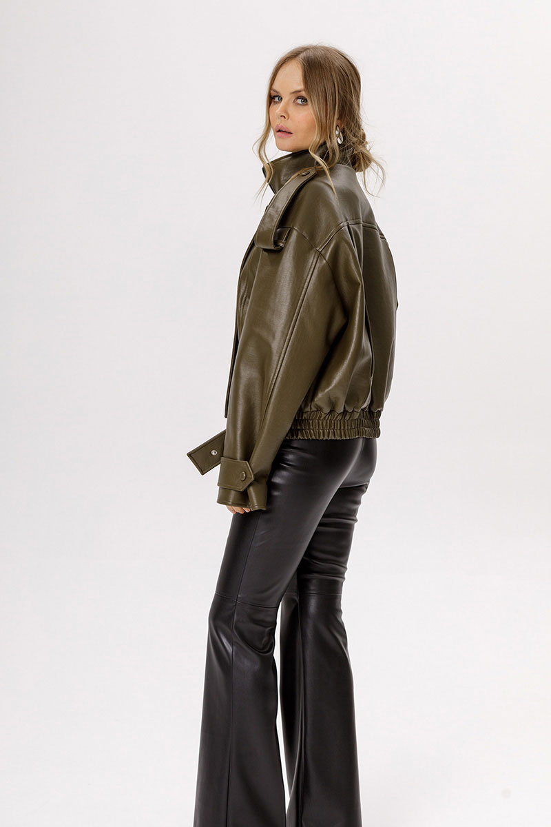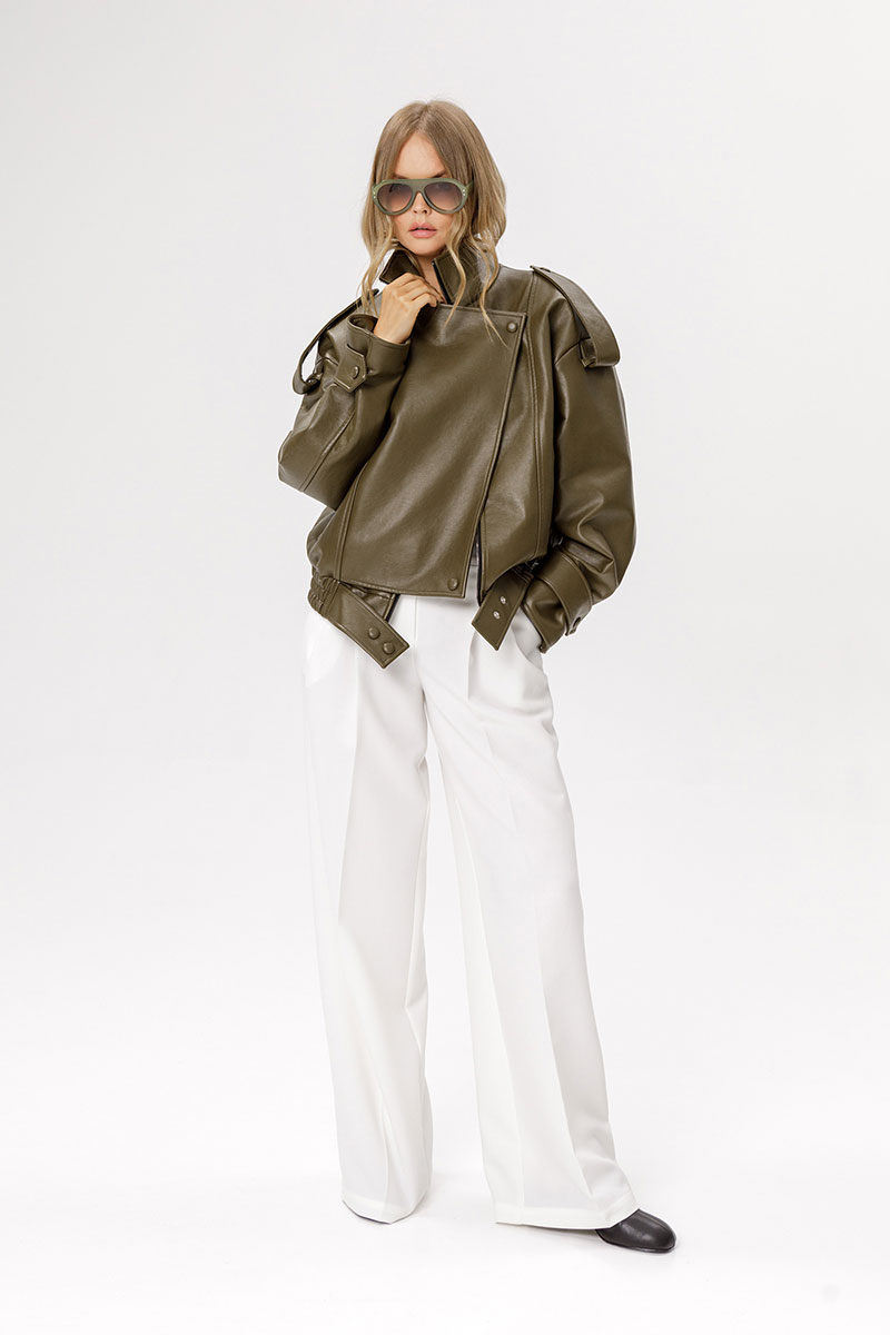 Детали: прямой силуэт, воротник-стойка, спущенная линия плеч, пояс переда и спинки на резинке, застежка на молнию и кнопки, рукава длинные с патами по низу, функциональные карманы, спинка с двумя глубокими складками, куртка на подкладке.