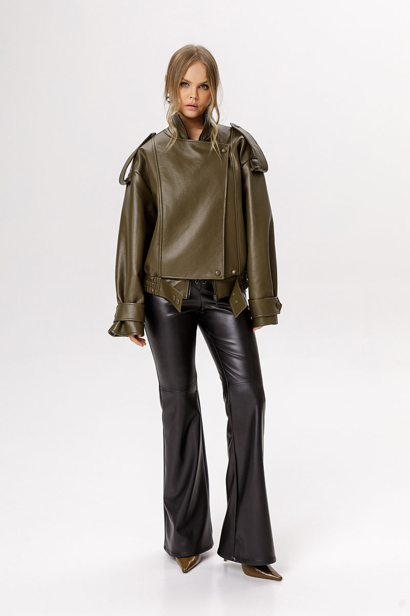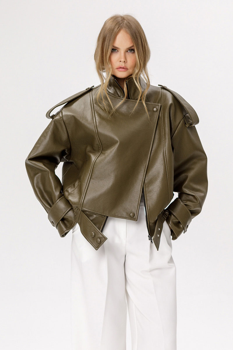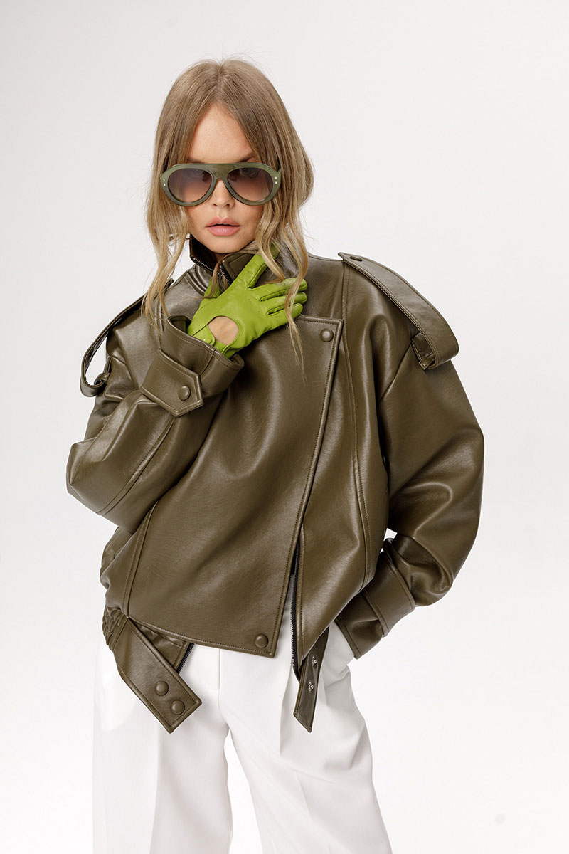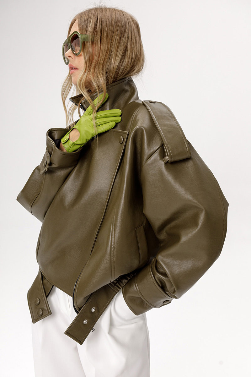 Детали: прямой силуэт, воротник-стойка, спущенная линия плеч, пояс переда и спинки на резинке, застежка на молнию и кнопки, рукава длинные с патами по низу, функциональные карманы, спинка с двумя глубокими складками, куртка на подкладке.