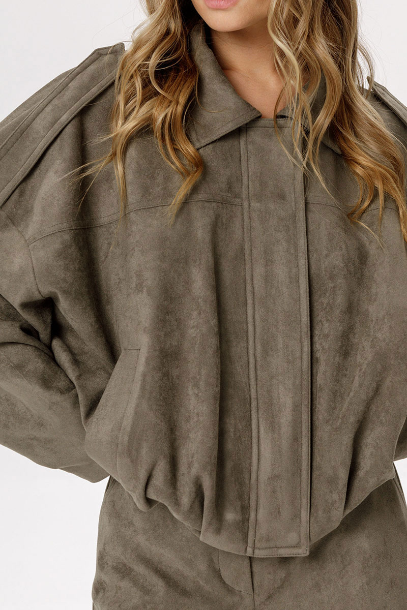 Оверсайз бомбер из замши со спущенными плечами и складками по низу.