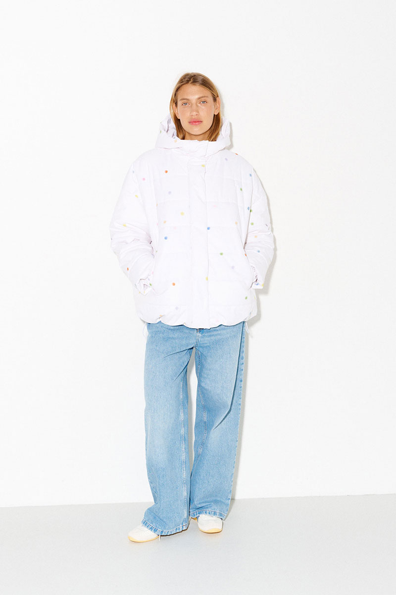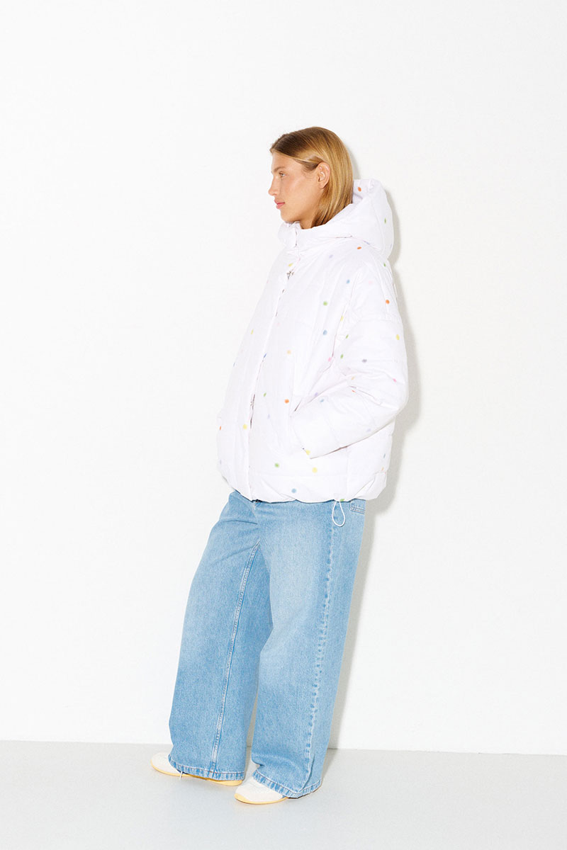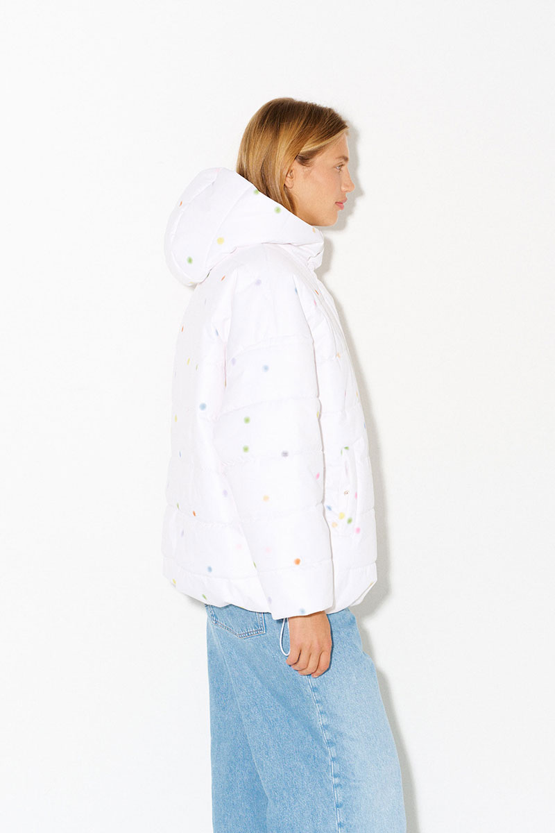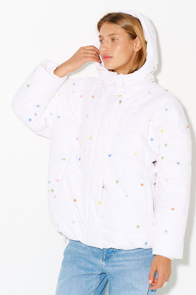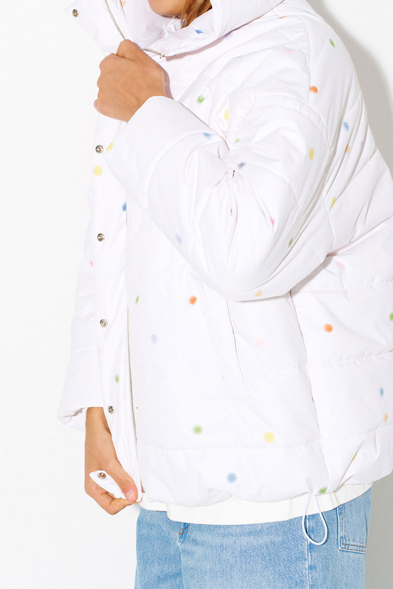Зимняя куртка с авторским принтом в цветной горох на белом фоне. Легкая, но при этом отлично сохраняет тепло благодаря бельгийскому утеплителю isosoft плотностью 280 г/м3 (до -25 °C).