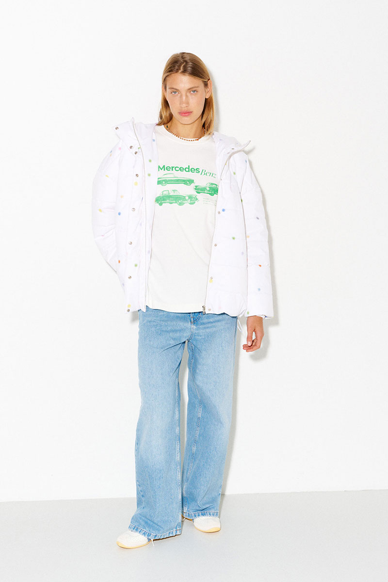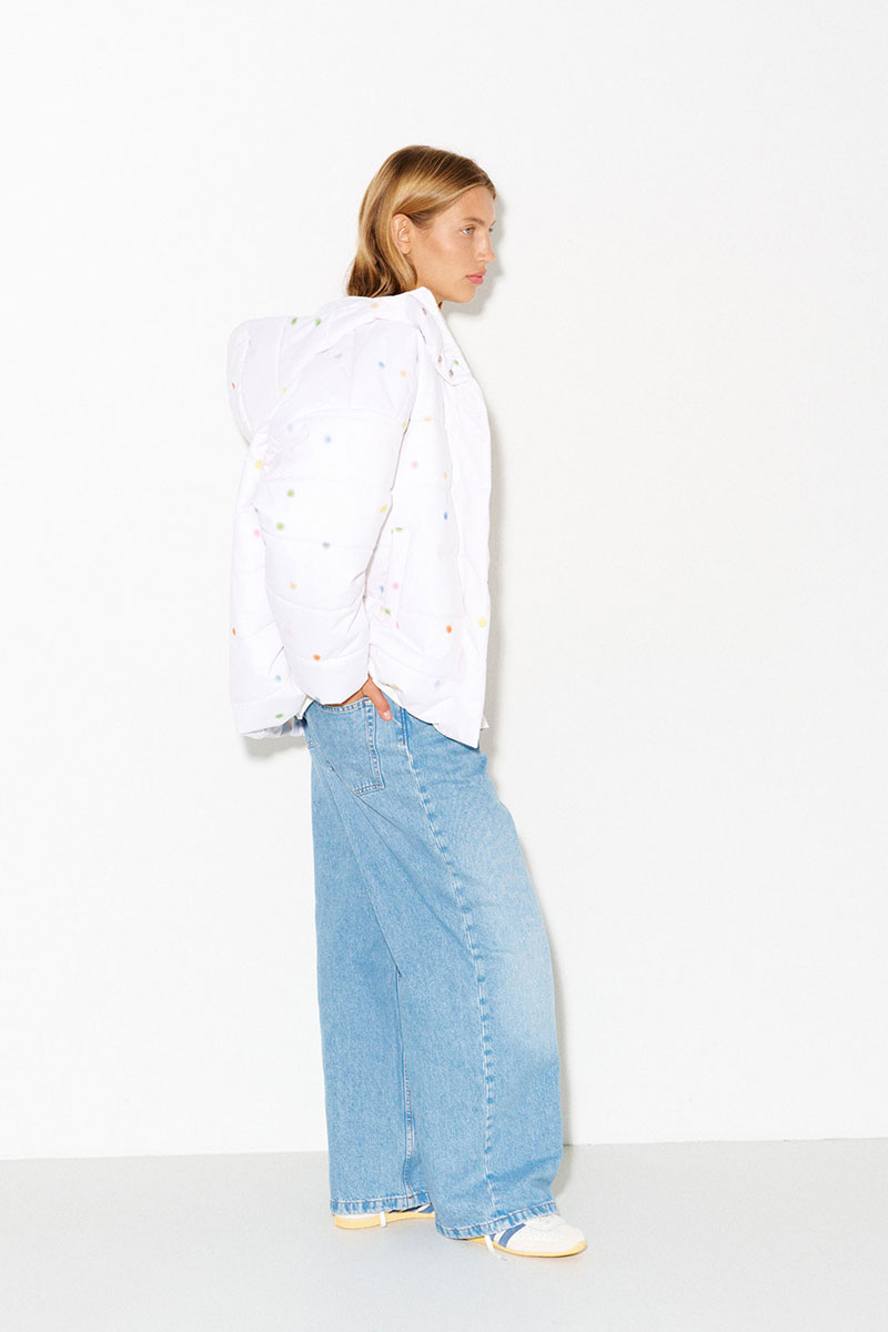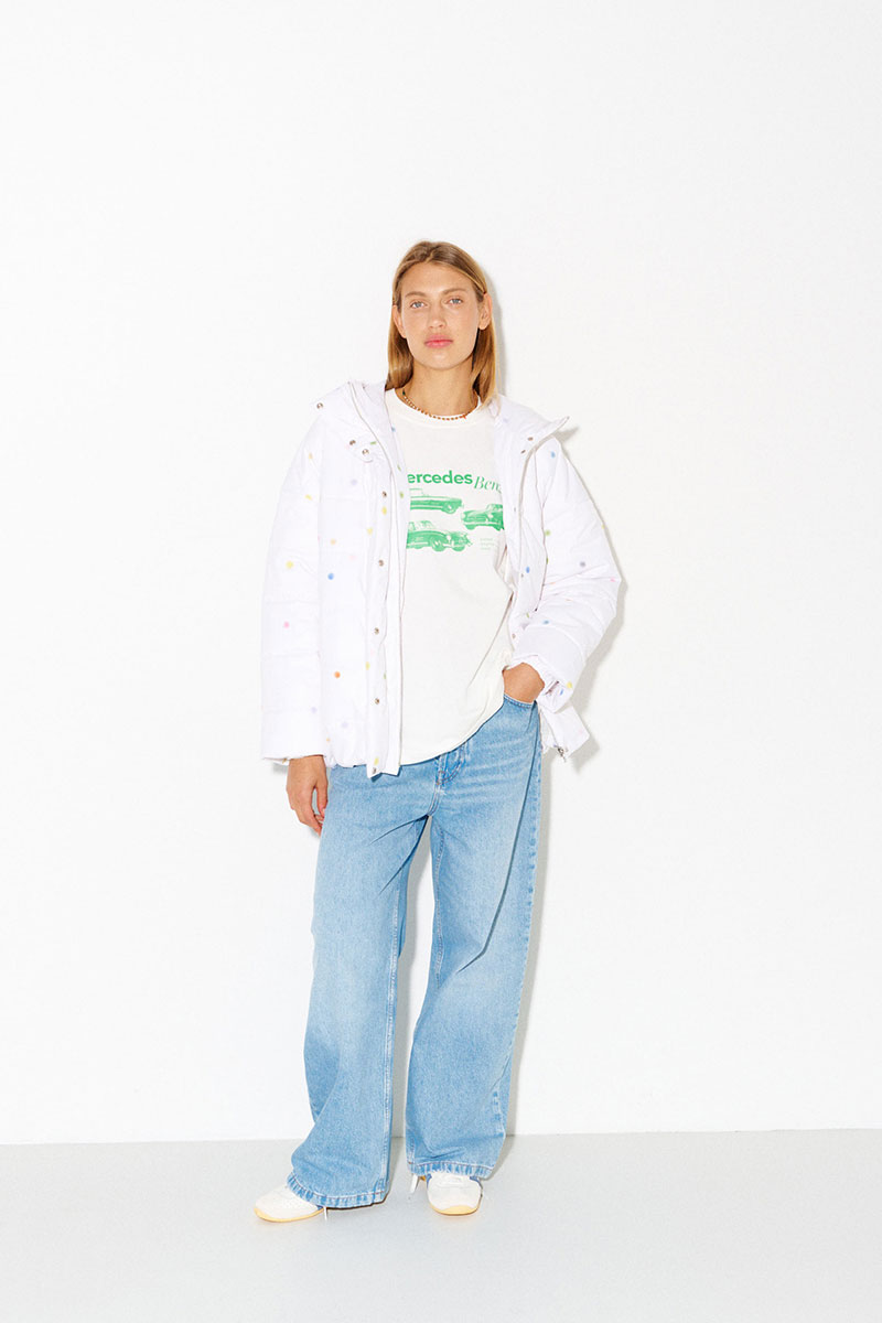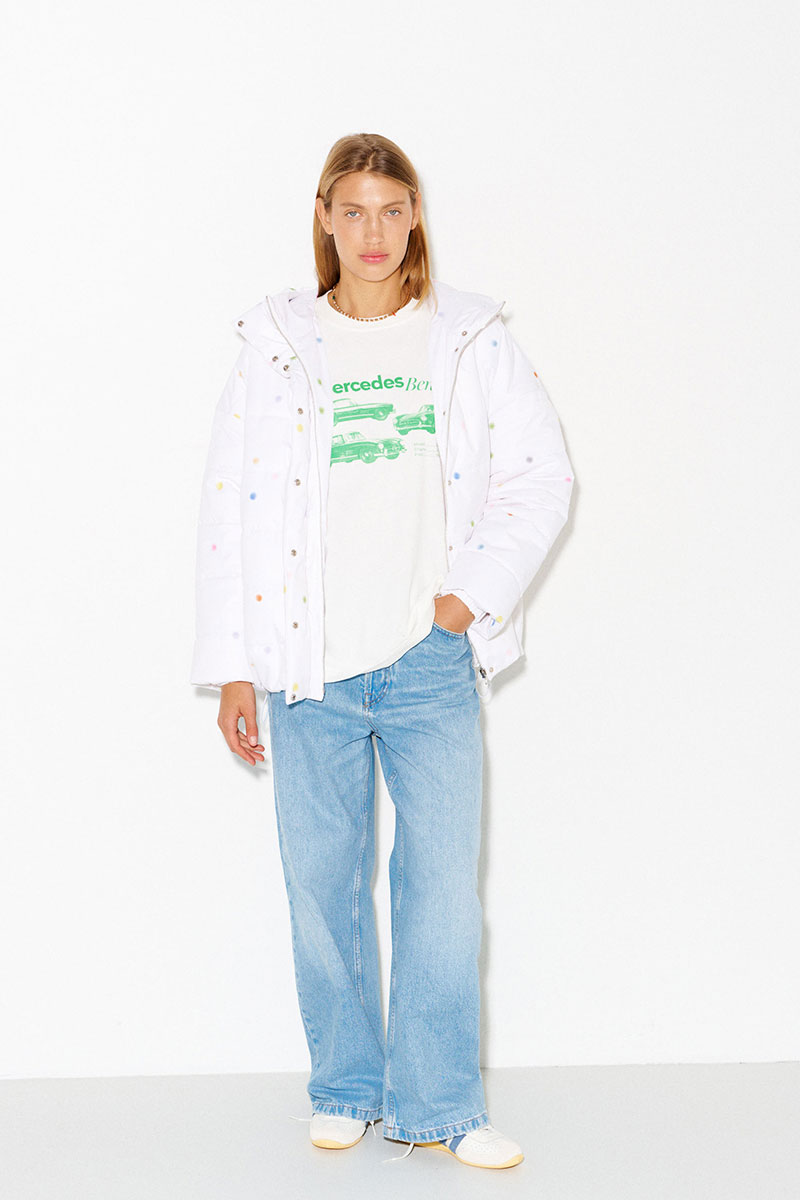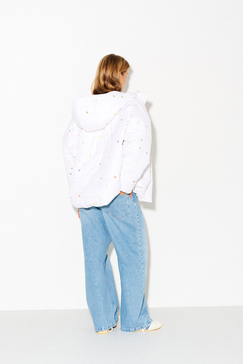 Зимняя куртка с авторским принтом в цветной горох на белом фоне. Легкая, но при этом отлично сохраняет тепло благодаря бельгийскому утеплителю isosoft плотностью 280 г/м3 (до -25 °C).