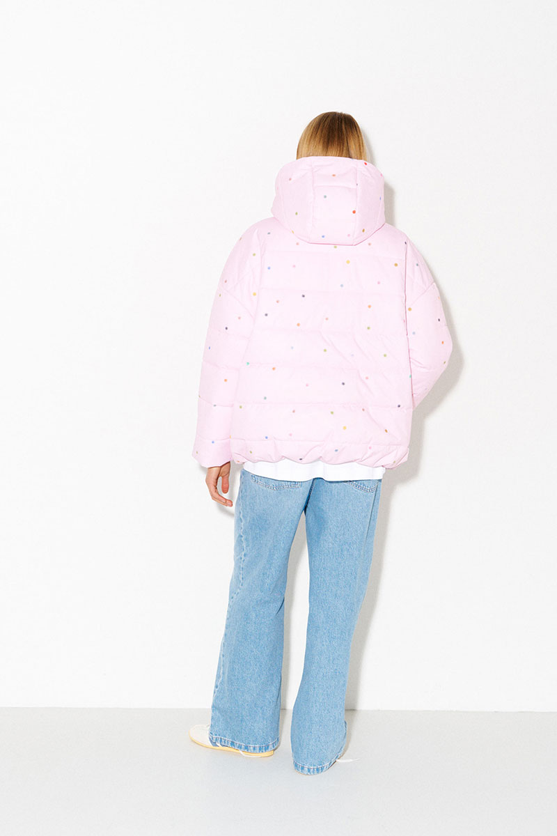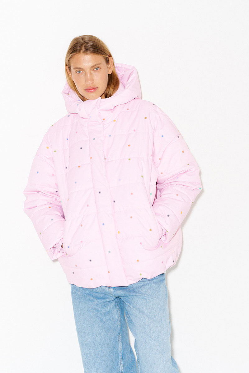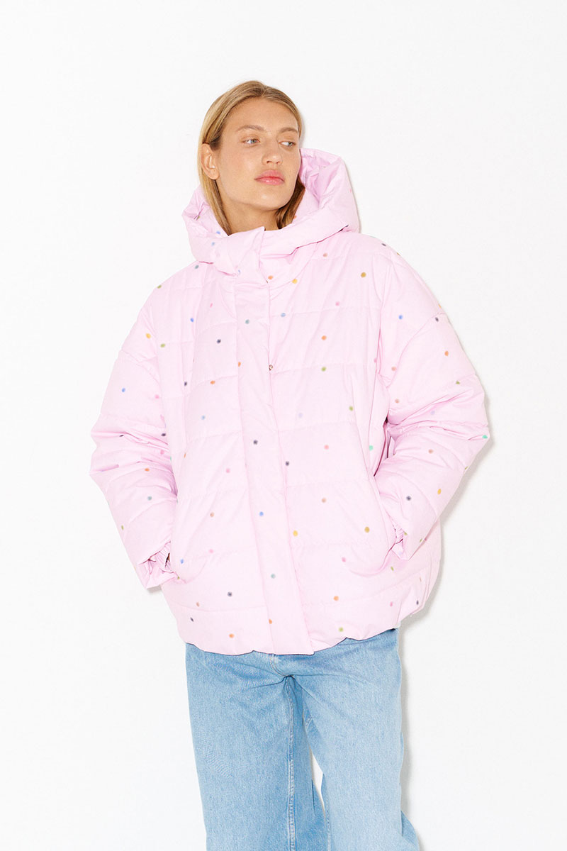 Зимняя куртка с авторским принтом в цветной горох на розовом фоне. Легкая, но при этом отлично сохраняет тепло благодаря бельгийскому утеплителю isosoft плотностью 280 г/м3 (до -25 °C).