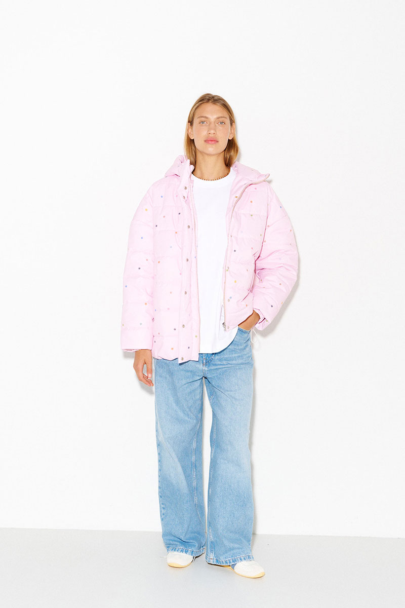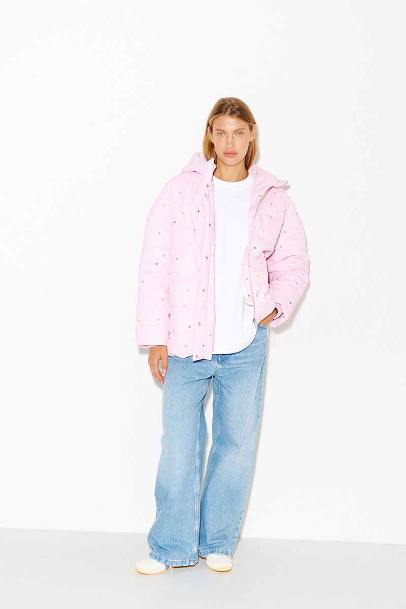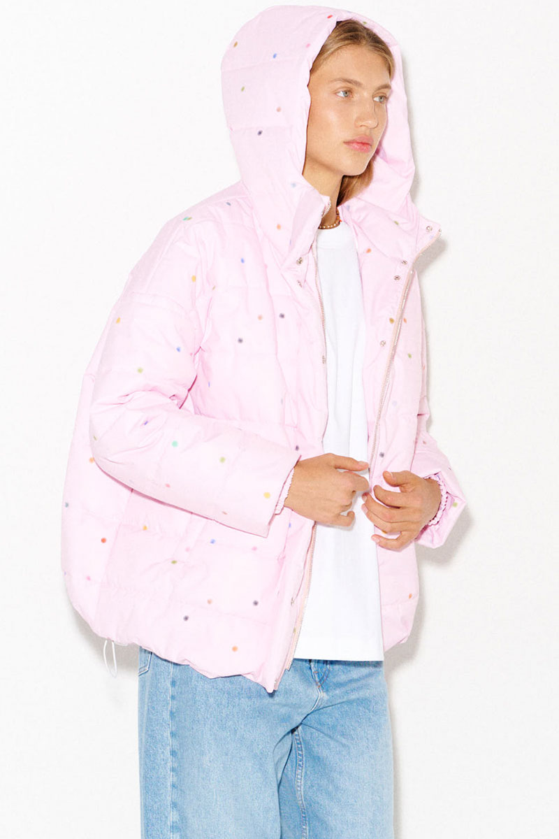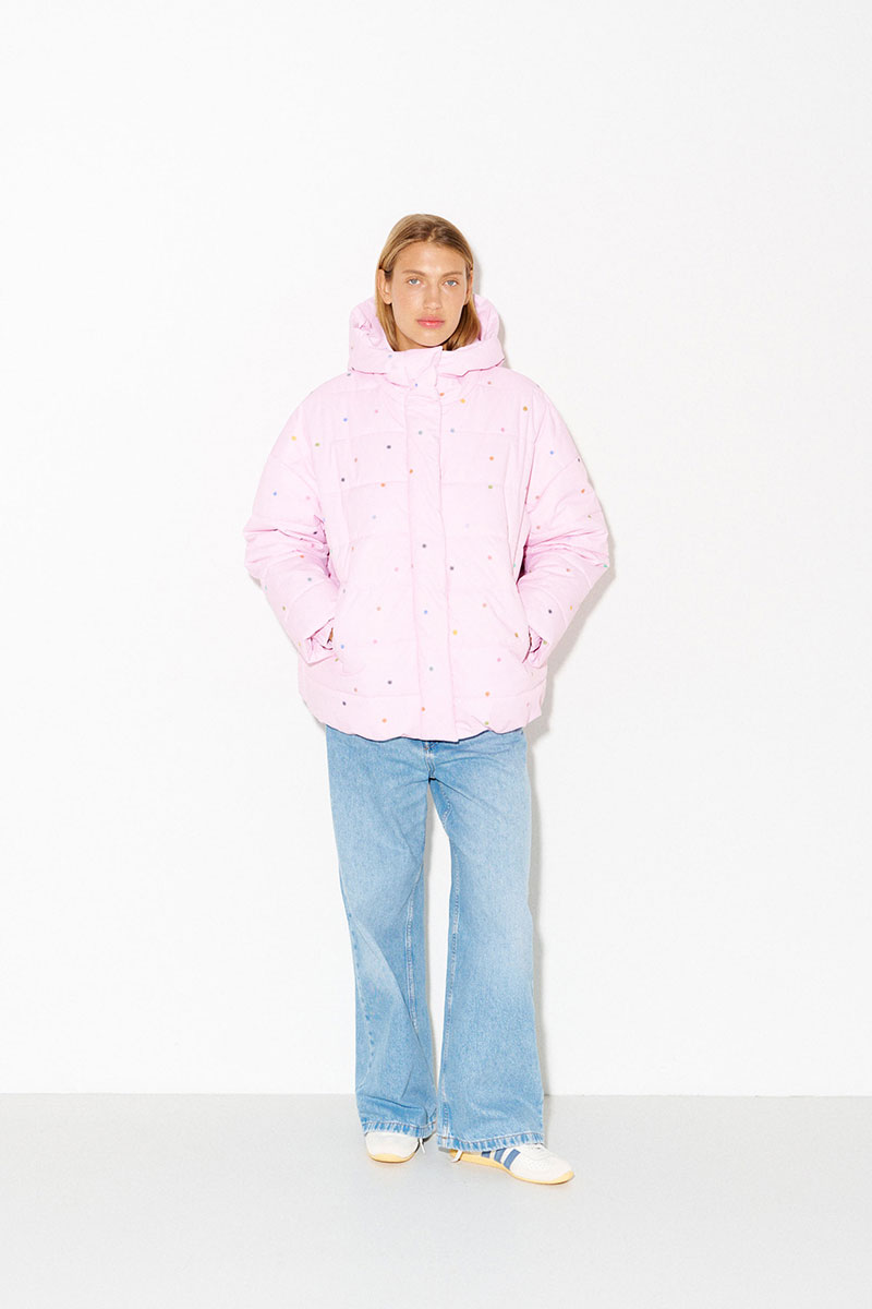 Зимняя куртка с авторским принтом в цветной горох на розовом фоне. Легкая, но при этом отлично сохраняет тепло благодаря бельгийскому утеплителю isosoft плотностью 280 г/м3 (до -25 °C).