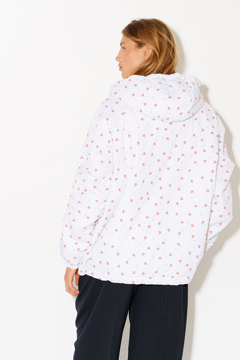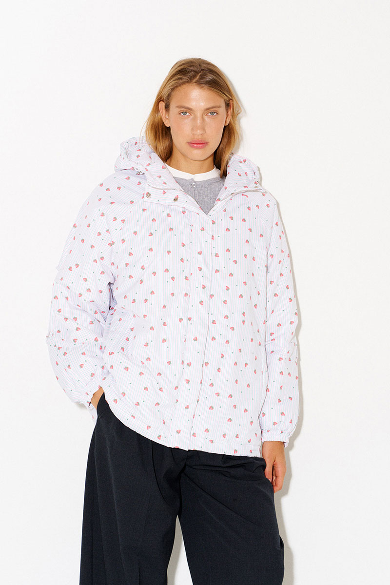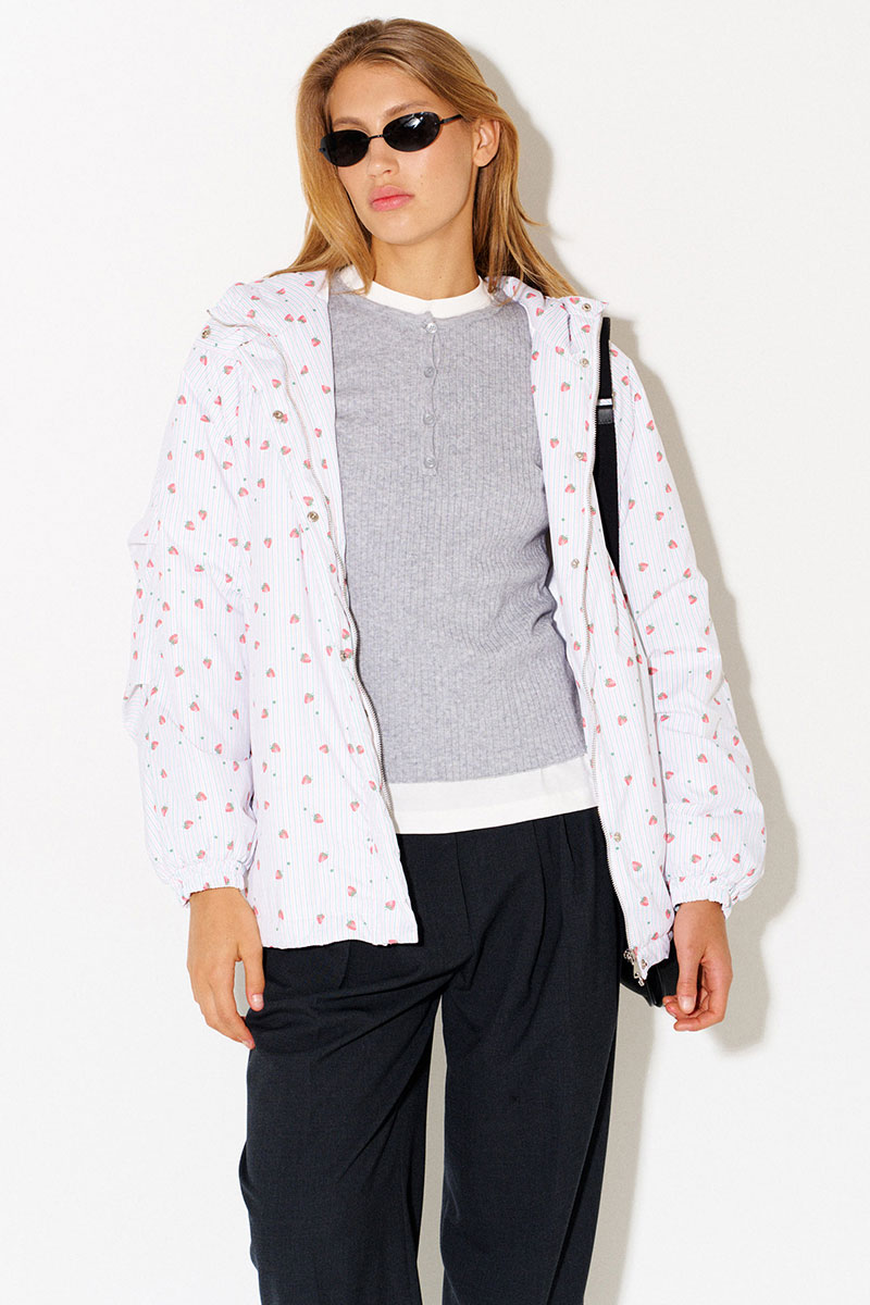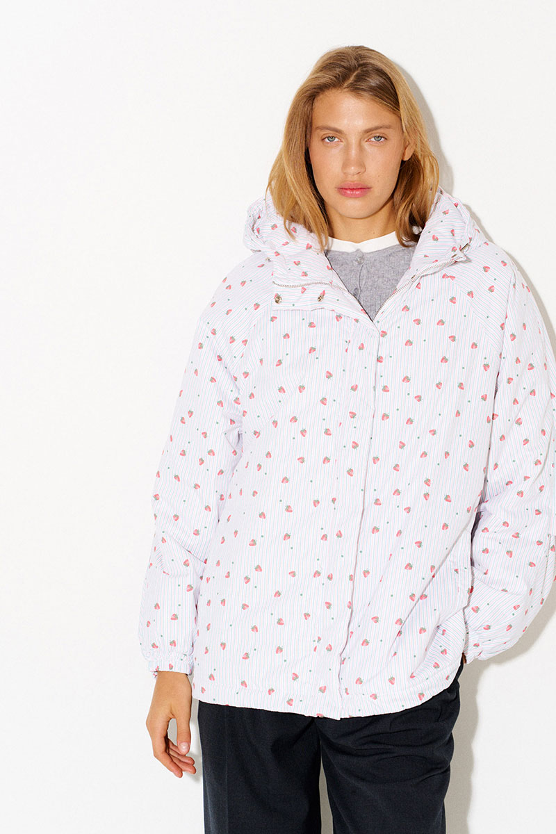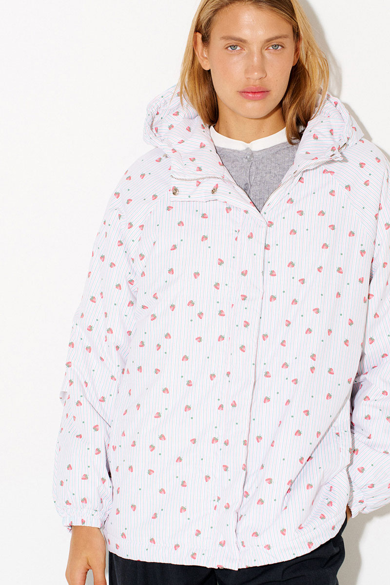 Демисезонная куртка в тонкую полоску с нашим авторским принтом в клубники. Легкая, но при этом теплая благодаря бельгийскому утеплителю isosoft плотностью 120 г/м3 (до -5–10 °C).