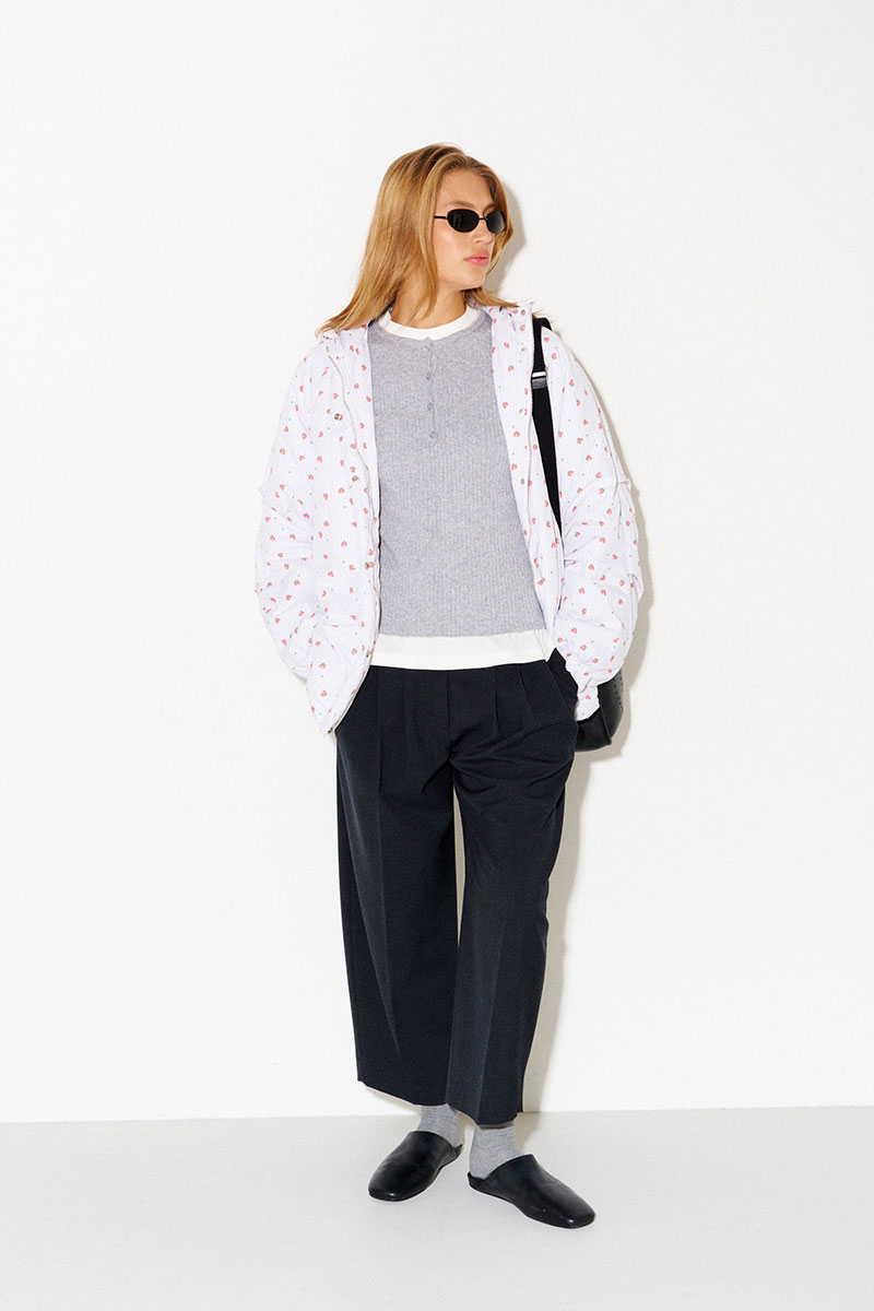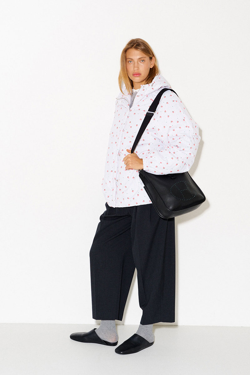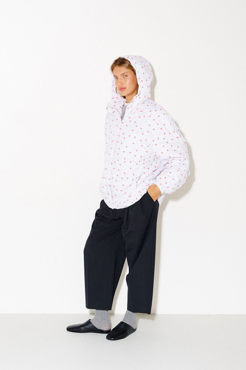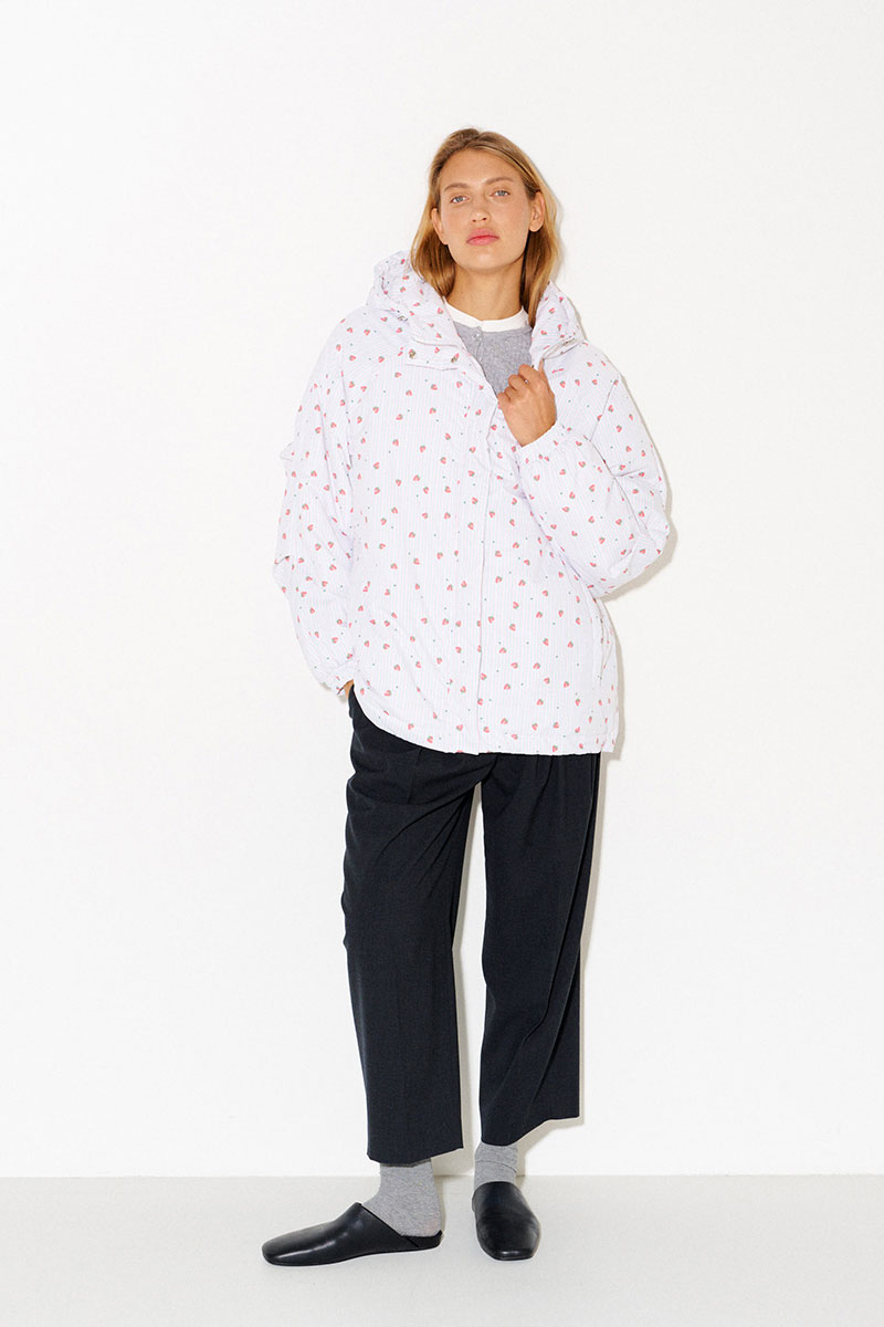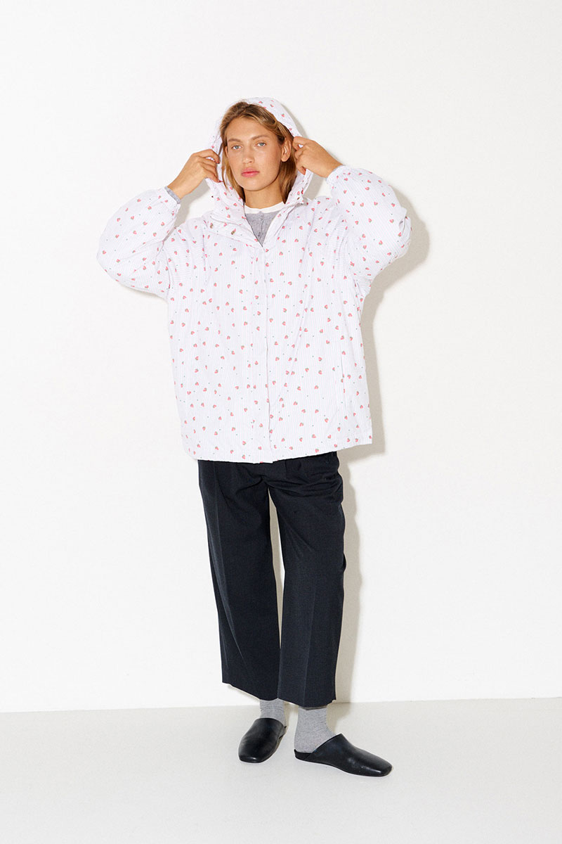 Демисезонная куртка в тонкую полоску с нашим авторским принтом в клубники. Легкая, но при этом теплая благодаря бельгийскому утеплителю isosoft плотностью 120 г/м3 (до -5–10 °C).