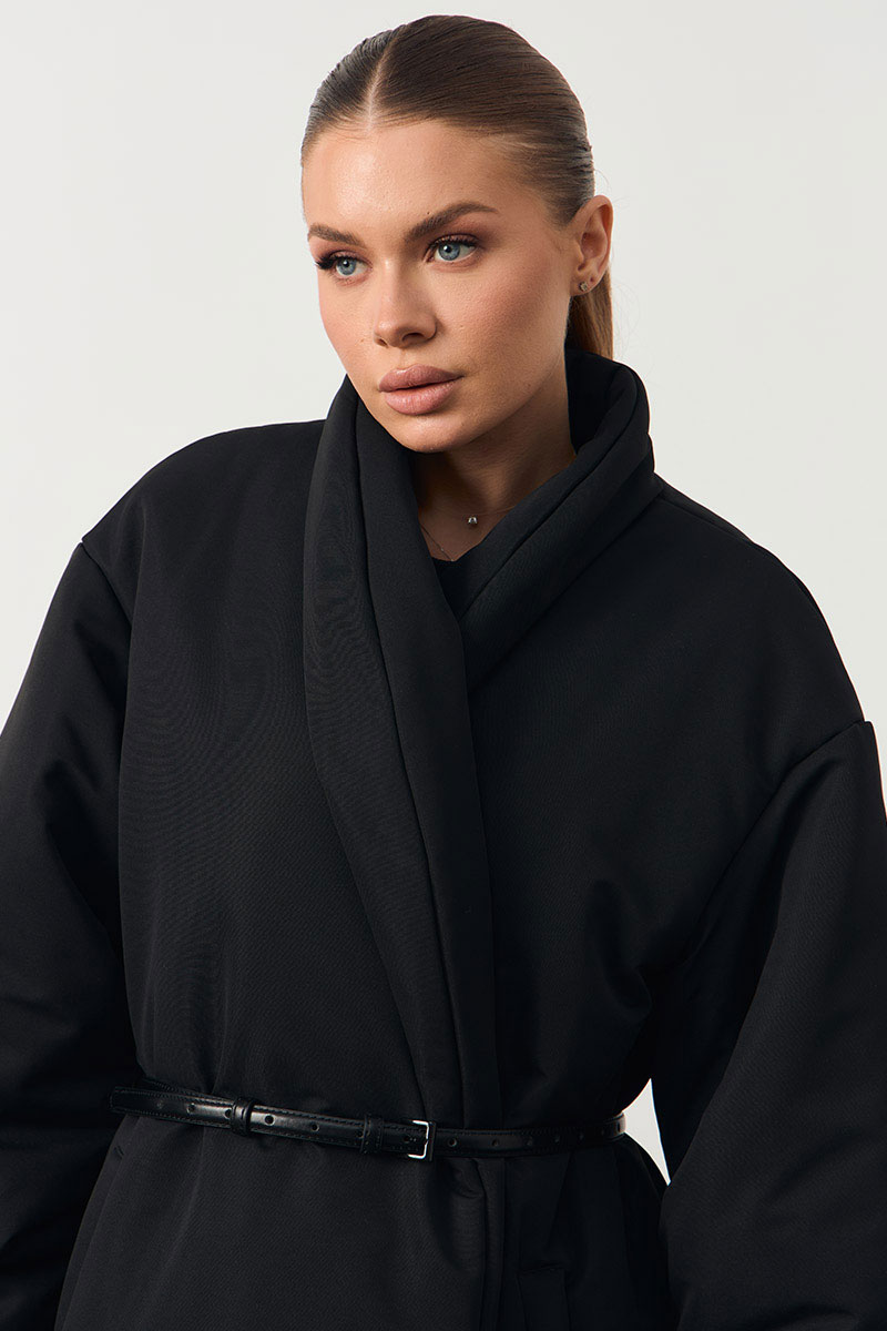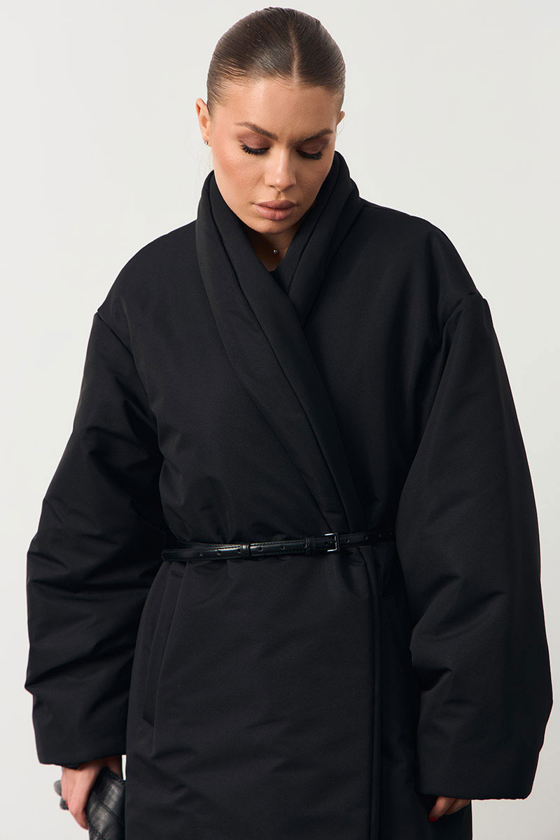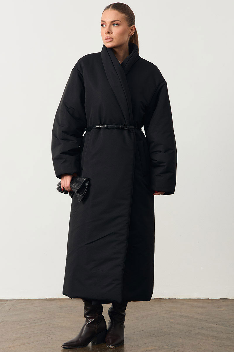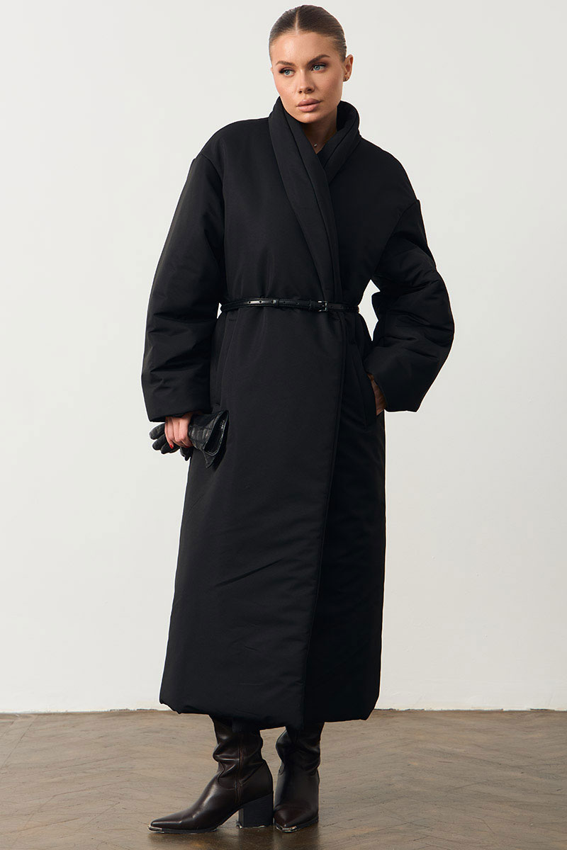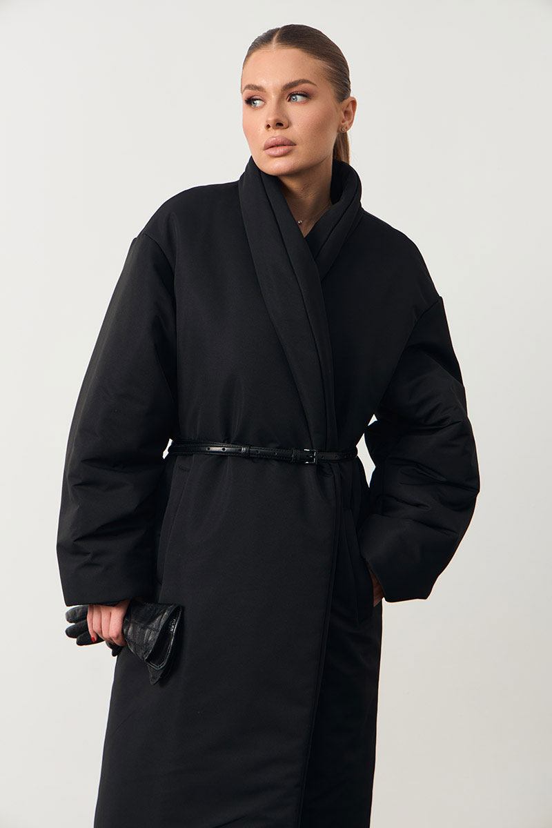 Пальто из плащёвой ткани с водоотталкивающей пропиткой. Пальто двубортное, с застежкой на кнопки. Рукав спущенный. Пальто на синтепоне. В комплекте съемный пояс.