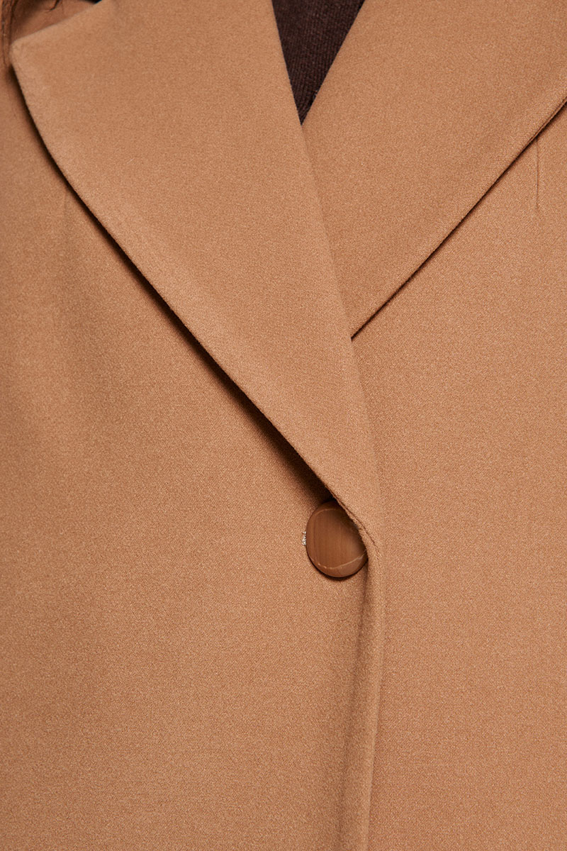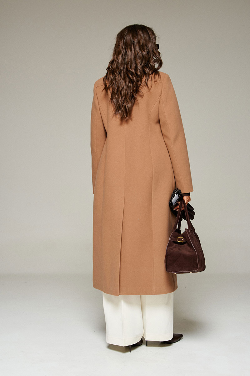 Пальто выполнено из шерстяной ткани, которая обеспечивает теплоизоляцию и защиту от ветра и влаги, подходит для межсезонья и теплой зимы. Двубортное, на подкладке.  Изделие рассчитано на температурный режим от +10 до -5 градусов. Модель прямого силуэта, базового кроя; предназначена для повседневного использования.