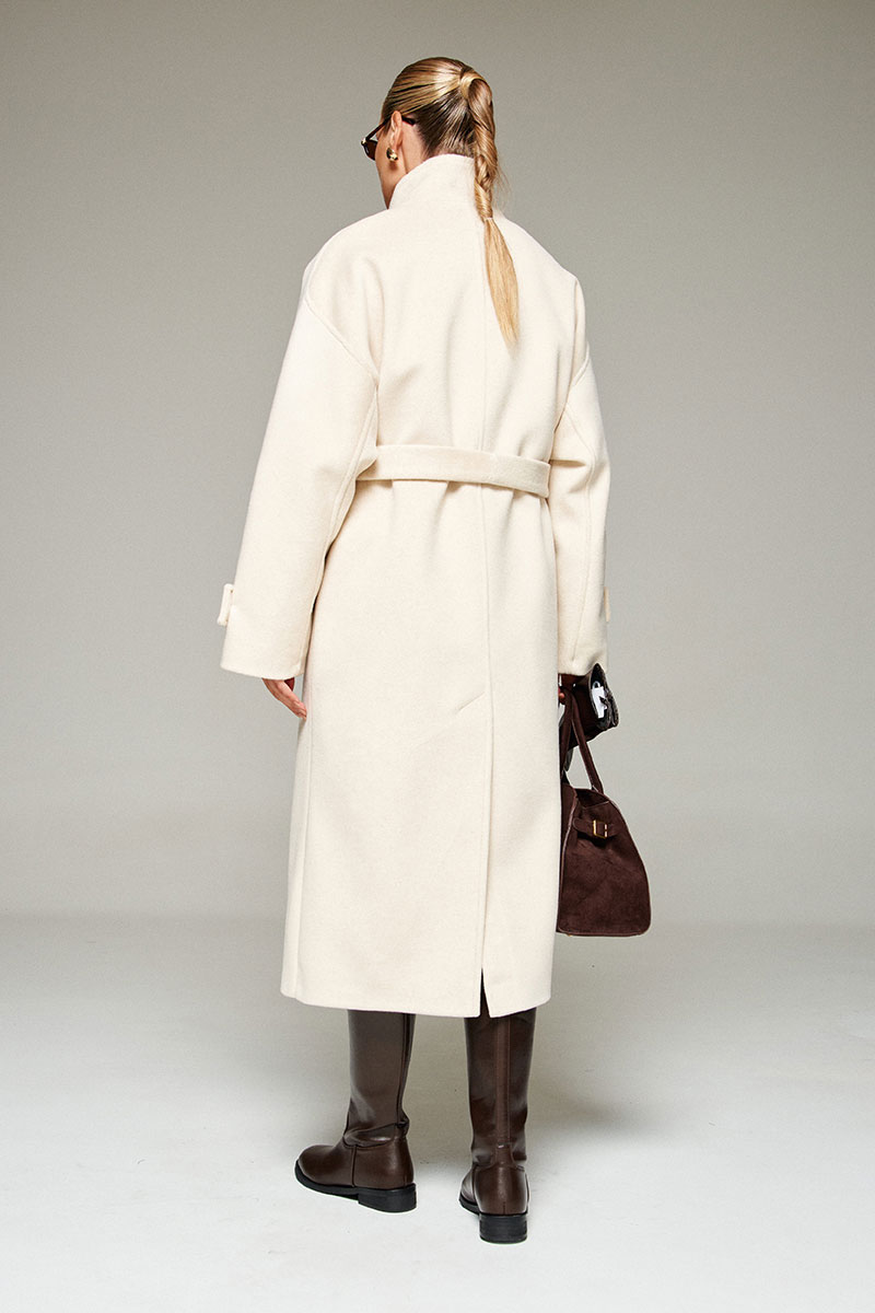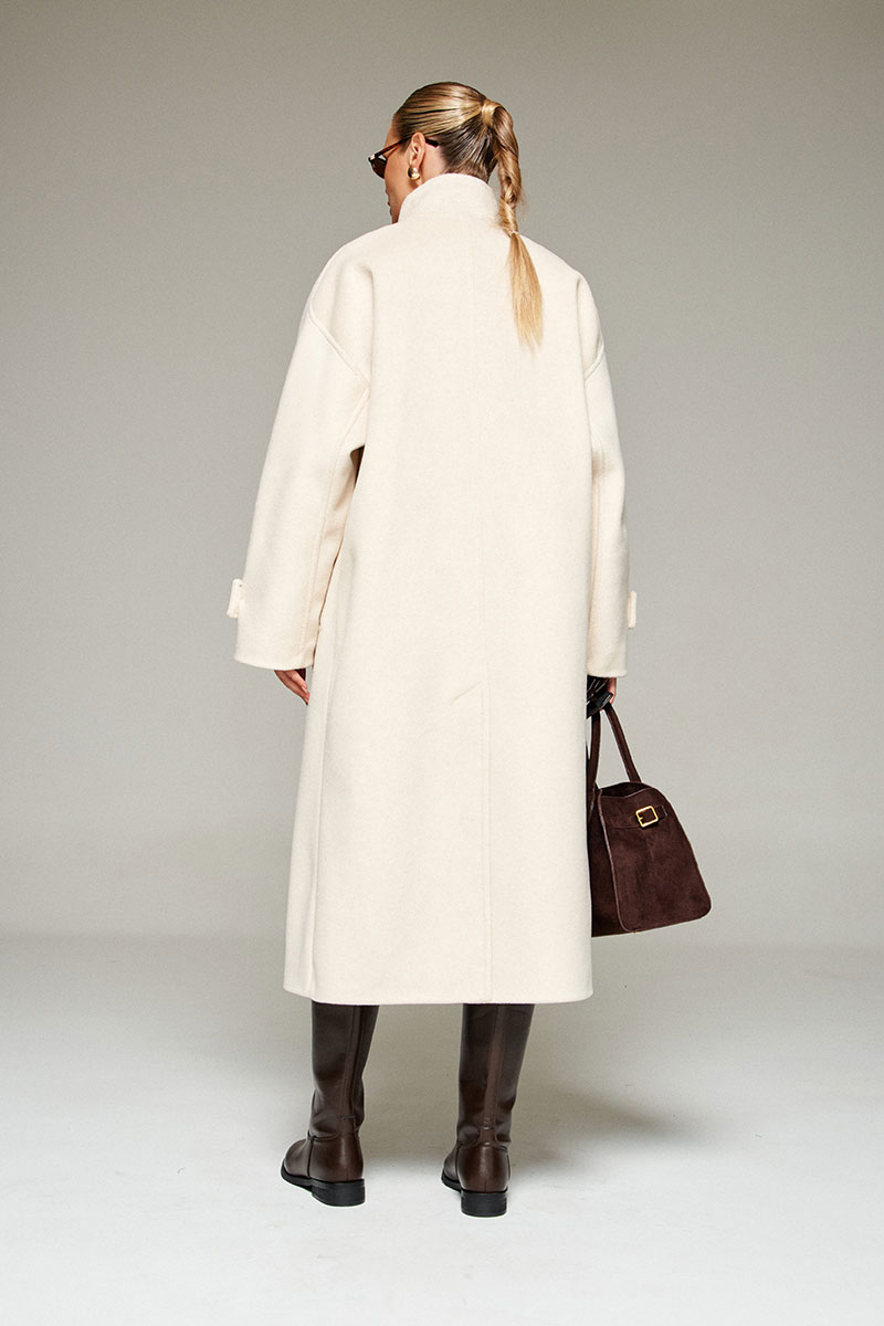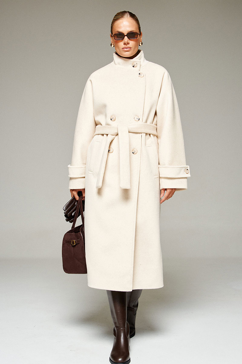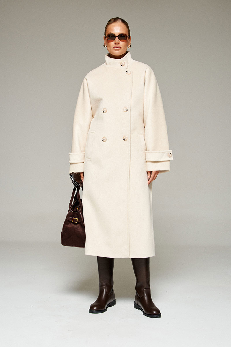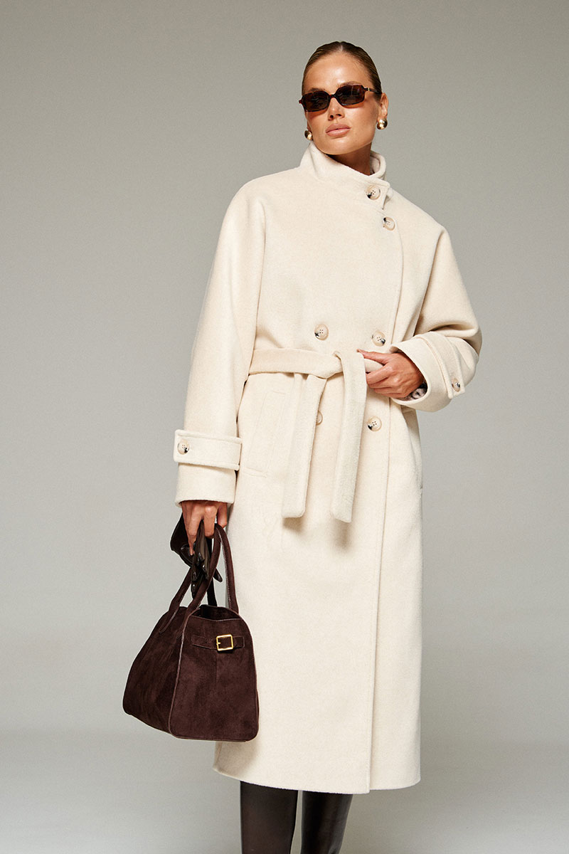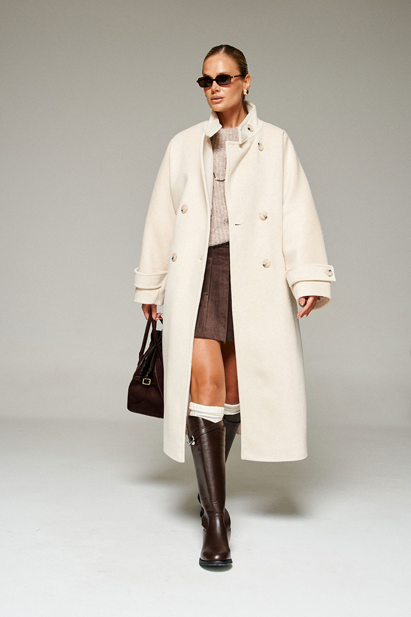 Пальто выполнено из шерстяной ткани, которая обеспечивает теплоизоляцию и защиту от ветра и влаги, подходит для межсезонья и теплой зимы. Двубортное, на подкладке.  Изделие рассчитано на температурный режим от +10 до -5 градусов. Модель прямого силуэта актуального покроя «летучая мышь»; предназначена для повседневного использования.