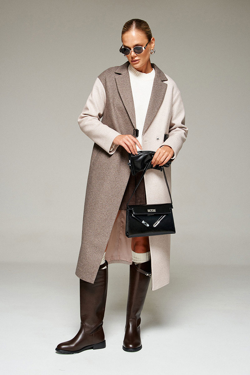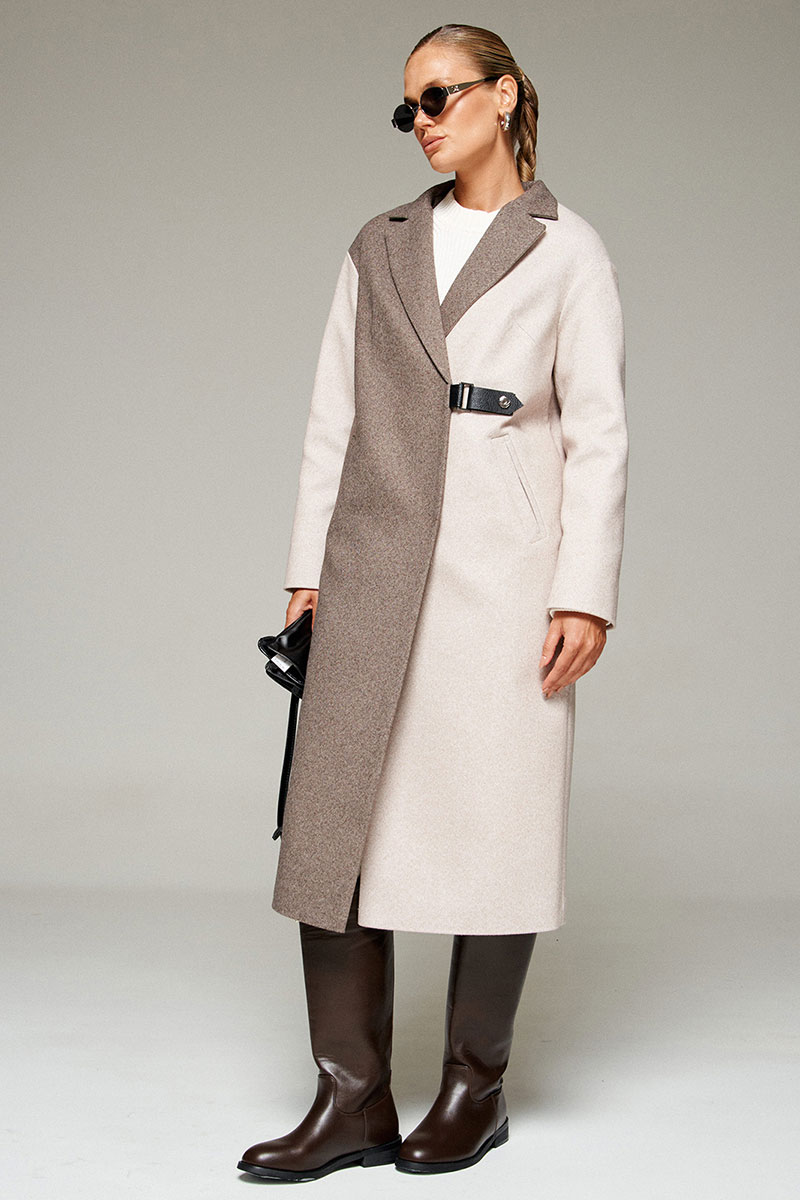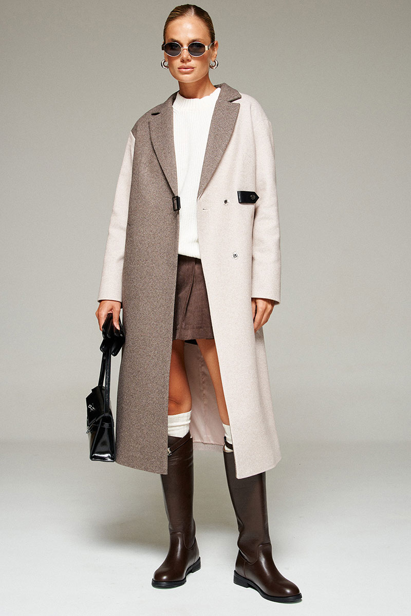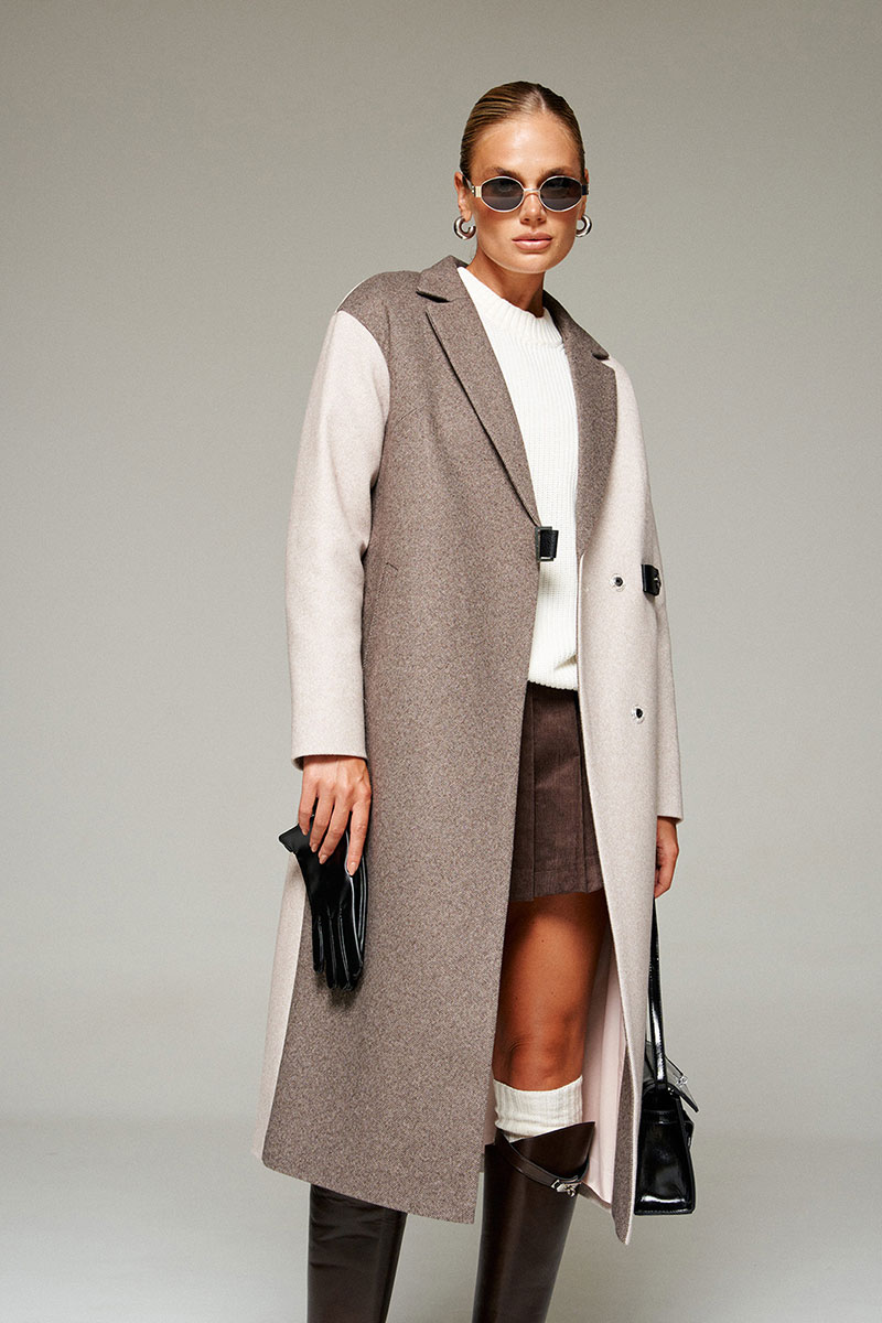 Пальто в актуальном сочетании меланжевых оттенков выполнено из шерстяной ткани, которая обеспечивает теплоизоляцию и защиту от ветра и влаги, подходит для межсезонья и теплой зимы. Двубортное, на подкладке.  Изделие рассчитано на температурный режим от +10 до -5 градусов. Модель прямого силуэта с удлиненной линией плеча, предназначена для повседневного использования.