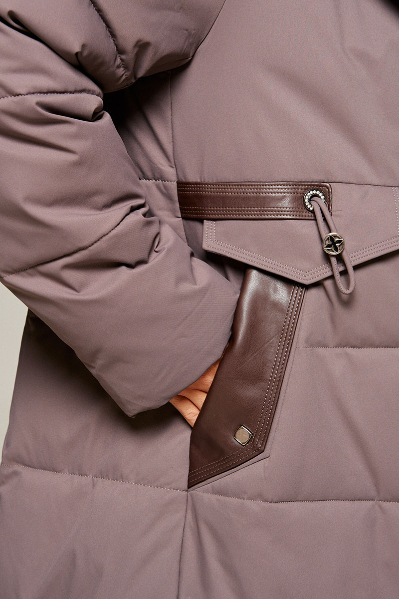 Капюшон с застежкой спереди умеренного объема. Внутренняя часть капюшона выполнена из искусственного меха, который выполняет декоративную и защитную функции, создавая дополнительное тепло и защиту от ветра и холода.
