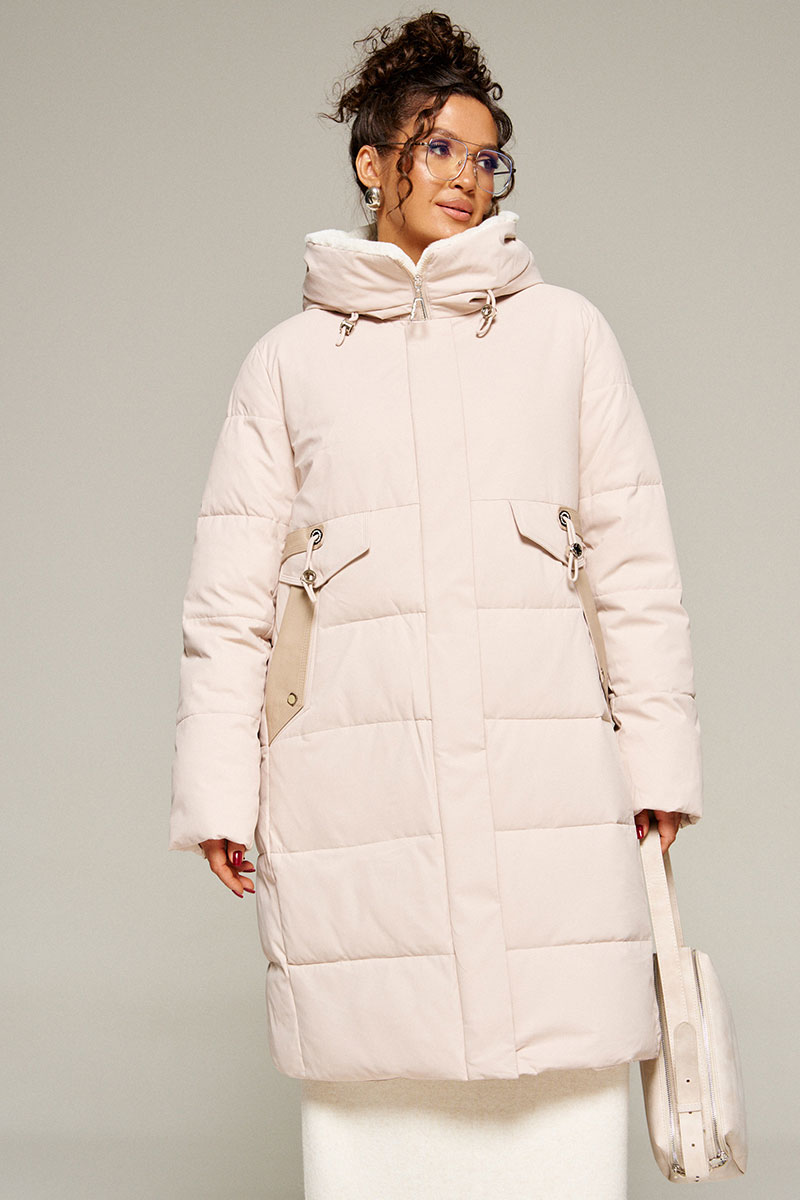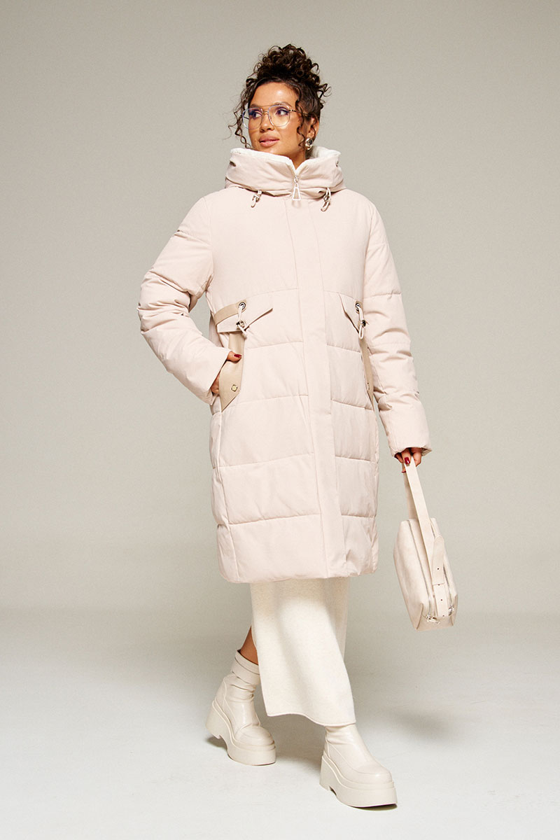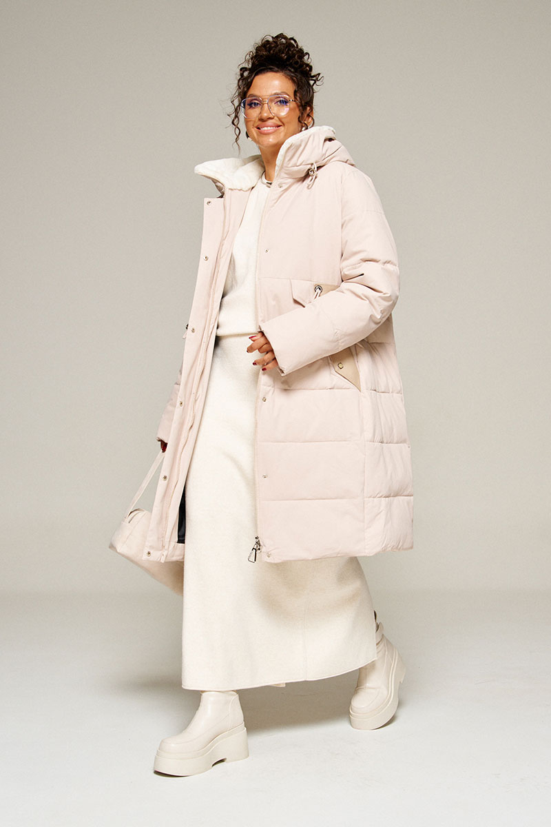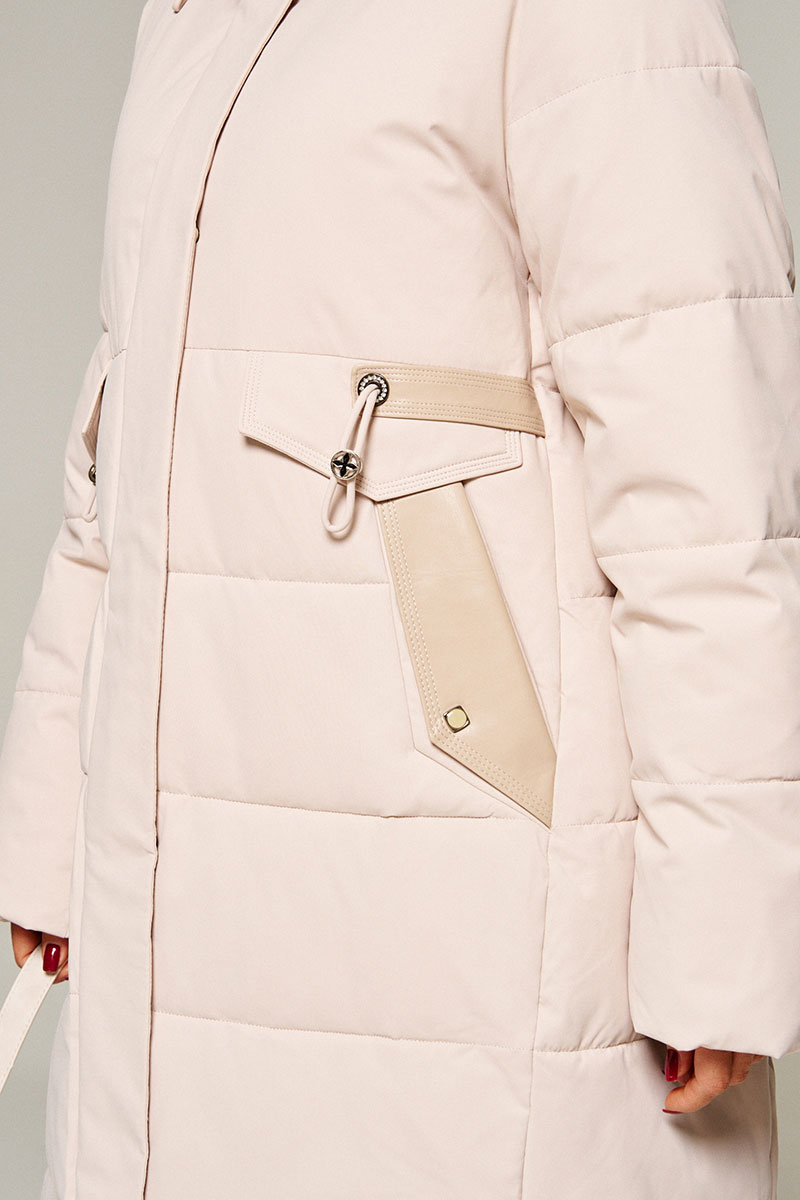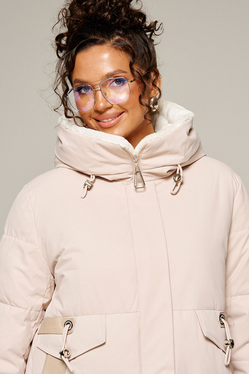 Капюшон с застежкой спереди умеренного объема. Внутренняя часть капюшона выполнена из искусственного меха, который выполняет декоративную и защитную функции, создавая дополнительное тепло и защиту от ветра и холода.