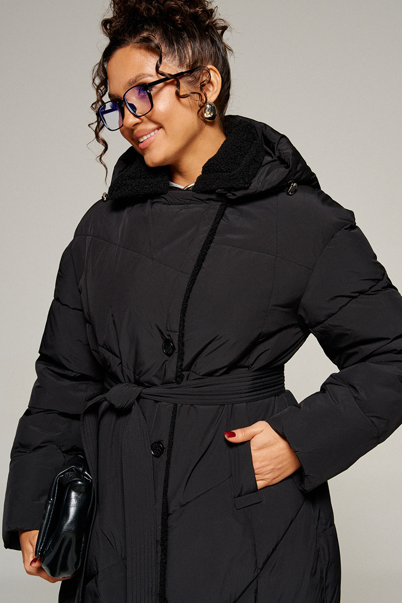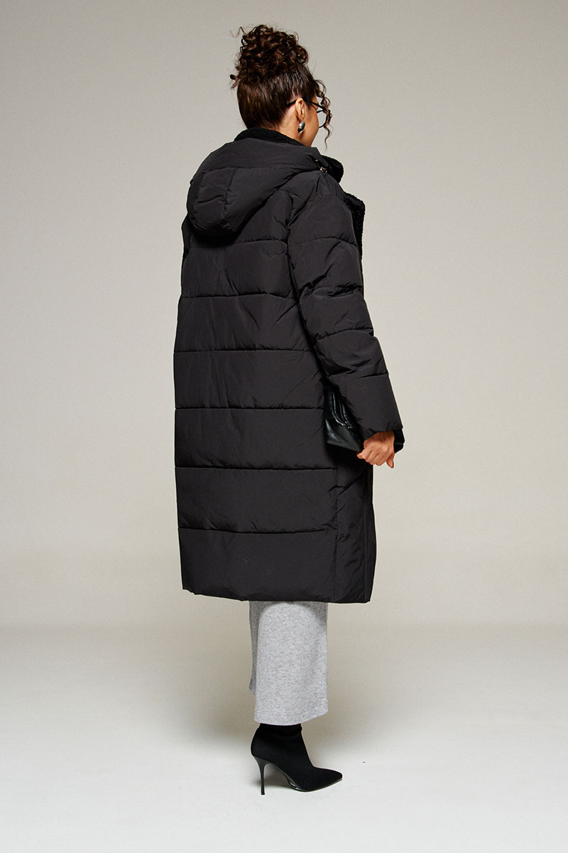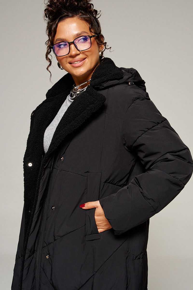 Воротник пиджачного типа с возможностью застегивания до верха. Внутренняя часть воротника, борта и лацканы обработаны искусственным мехом «овчина».