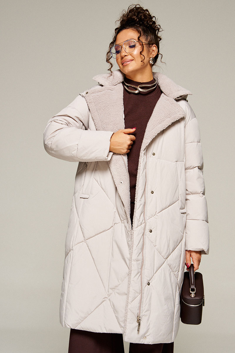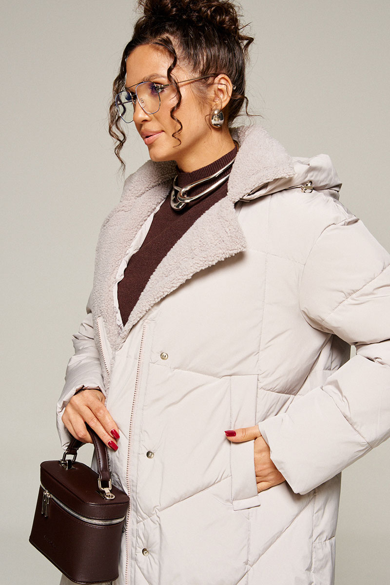 Воротник пиджачного типа с возможностью застегивания до верха. Внутренняя часть воротника, борта и лацканы обработаны искусственным мехом «овчина».