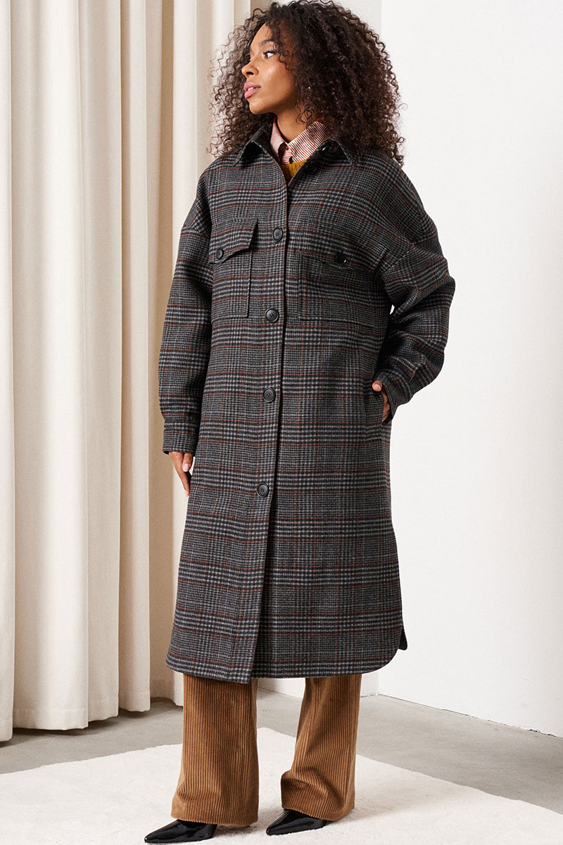 Пальто-рубашка свободного силуэта. Втачной рукав на спущенном плечевом шве. Застежка центральная по планке на пуговицы. Пальто с настрочными карманами по переду и прорезными карманами с листочками. Спинка с кокеткой. Пальто с утеплителем на подкладке.