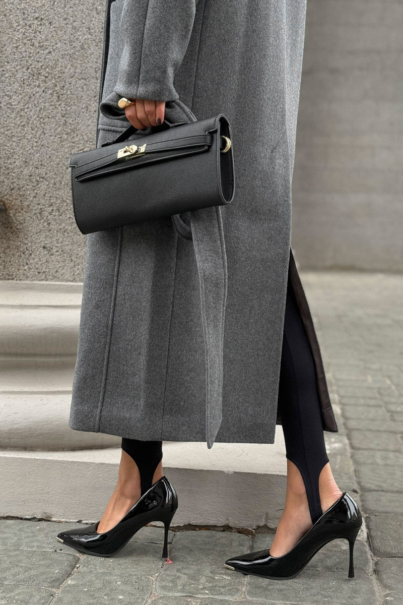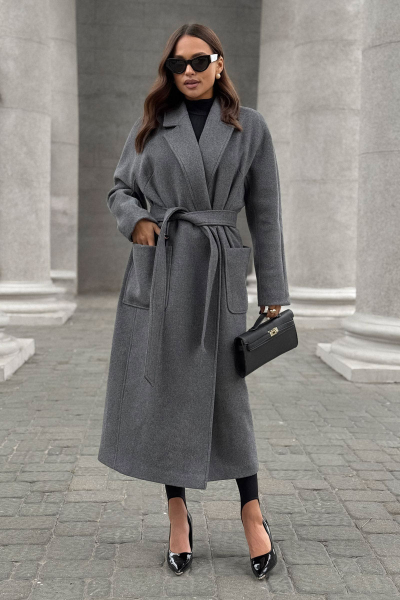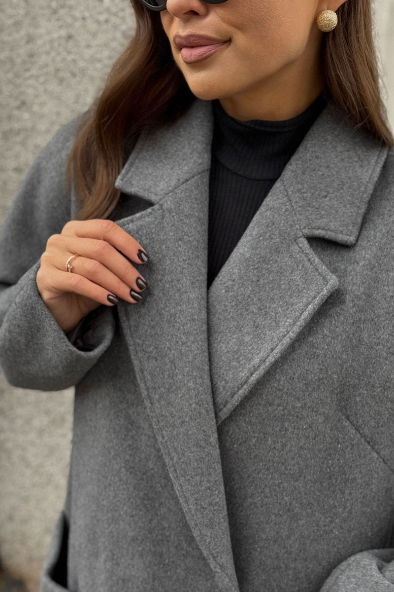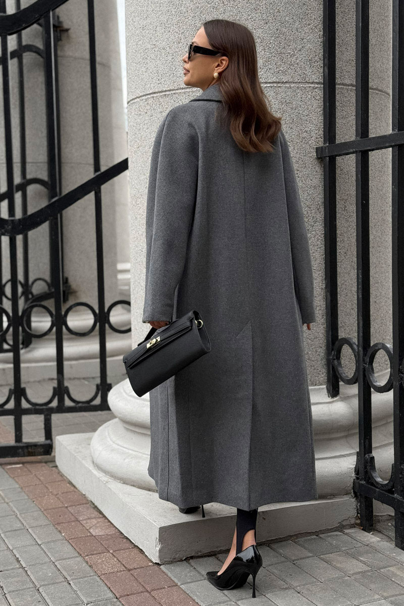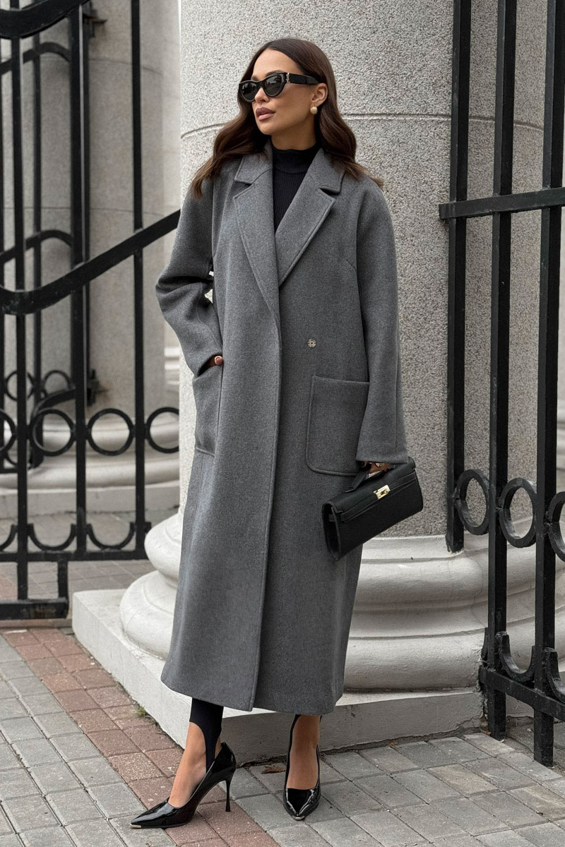 Пальто женское двубортное, выполнено из пальтовой ткани великолепного качества. Рукав спущенный, воротник стойка-отложной с отворотами лацканов. По переду накладные карманы.