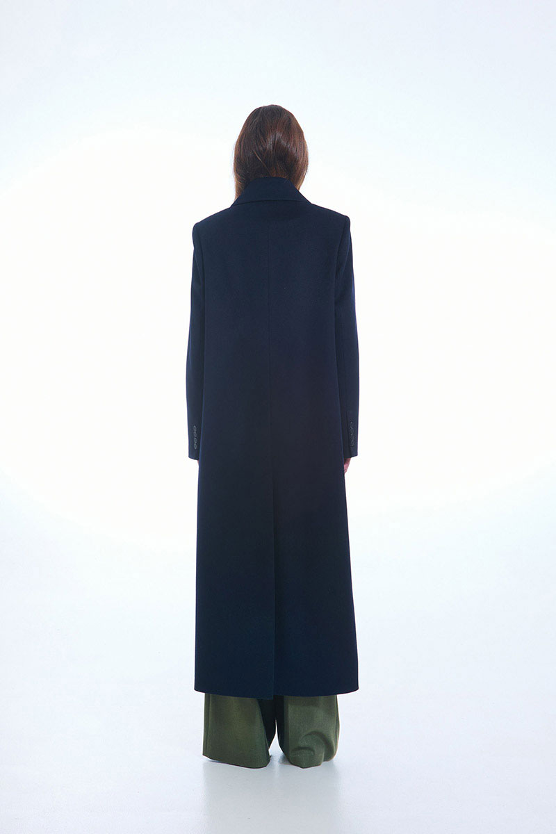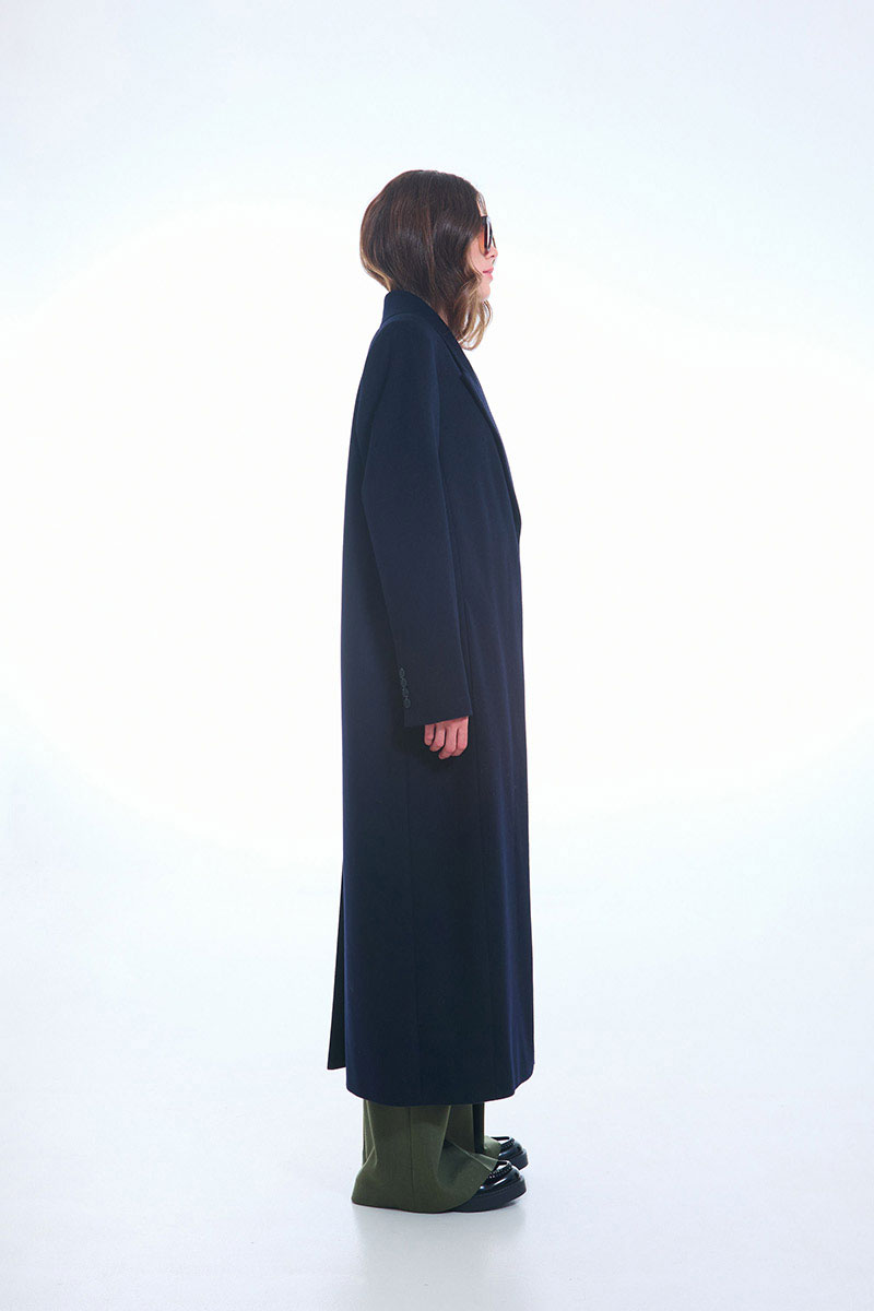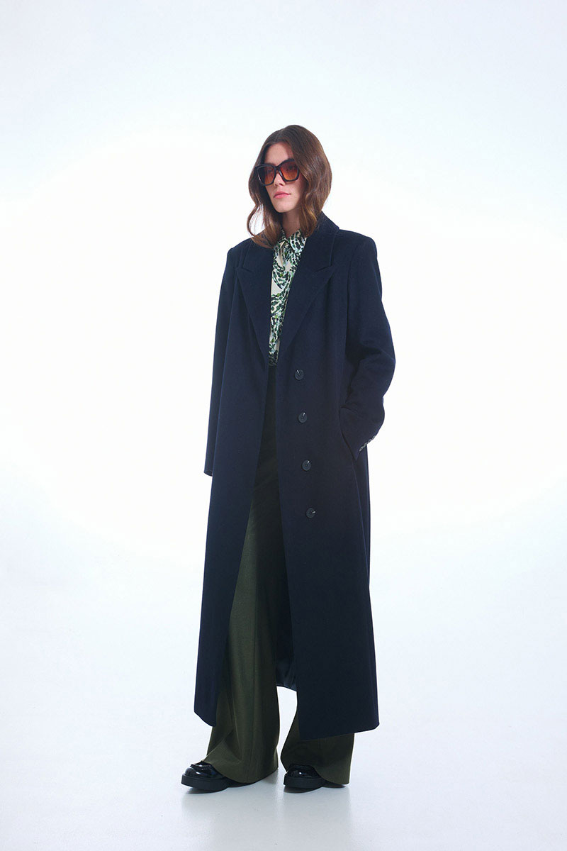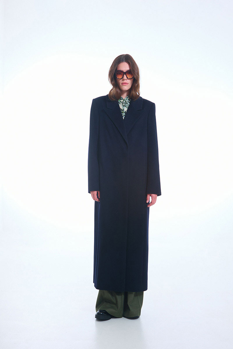Пальто женское демисезонное, прямого силуэта однобортное, длина «миди», на подкладке. На переде карманы в рельефе, застежка потайная на петли и пуговицы. В нижней части среднего шва спинки шлица. Рукава двухшовные длинные, в локтевом шве отлетная шлица на 4 пуговицы и не пробивные петли. Воротник и лацкана отложные.
