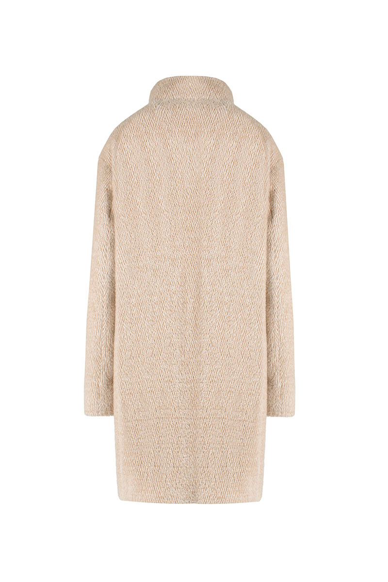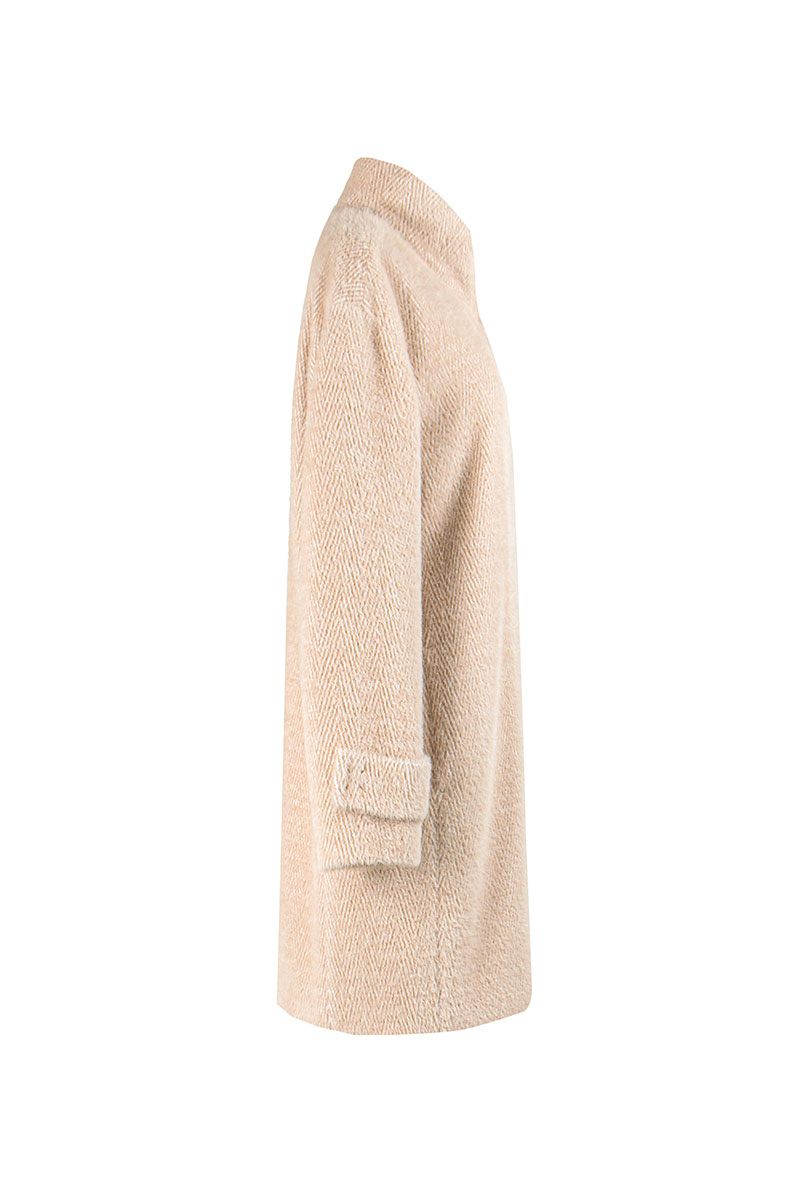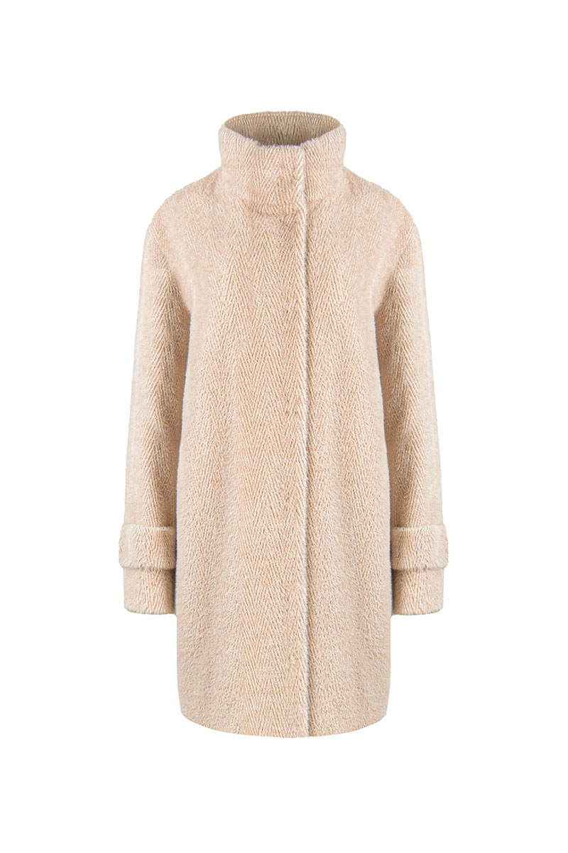 Пальто женское демисезонное, однобортное, прямого силуэта длиной до середины колена, на подкладке. Застежка на потайные кнопки. Перед с карманами в рельефных швах. Рукав длинный, в нижней части пата с потайной кнопкой. Воротник стойка с потайной кнопкой.