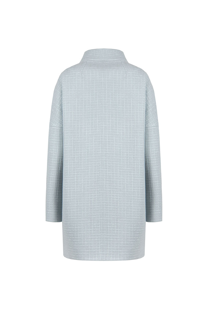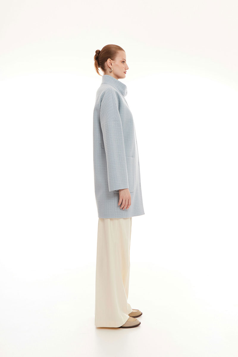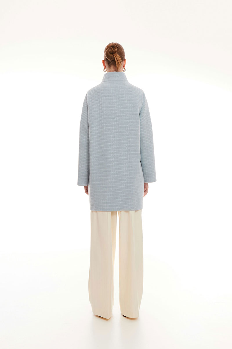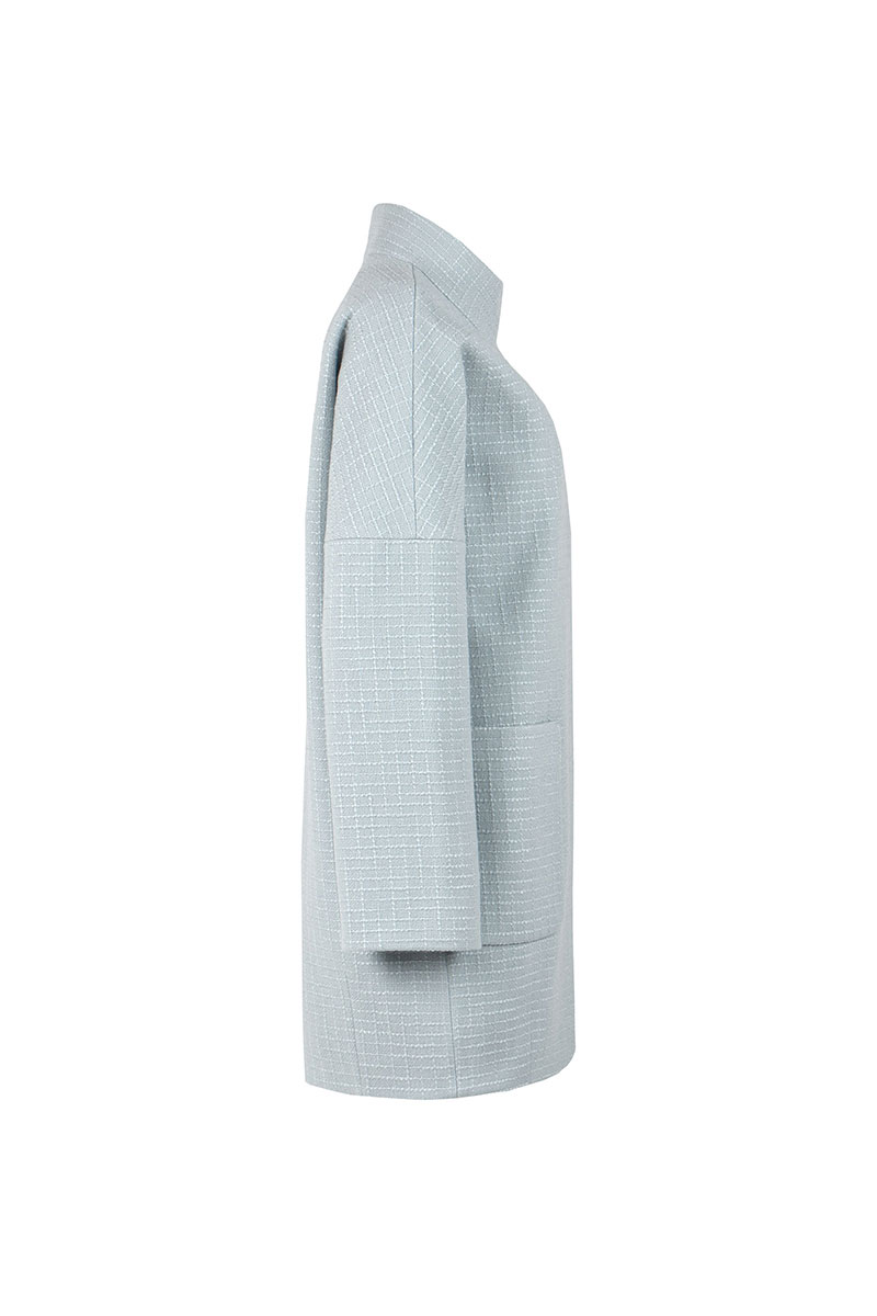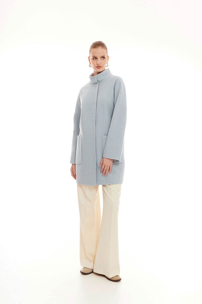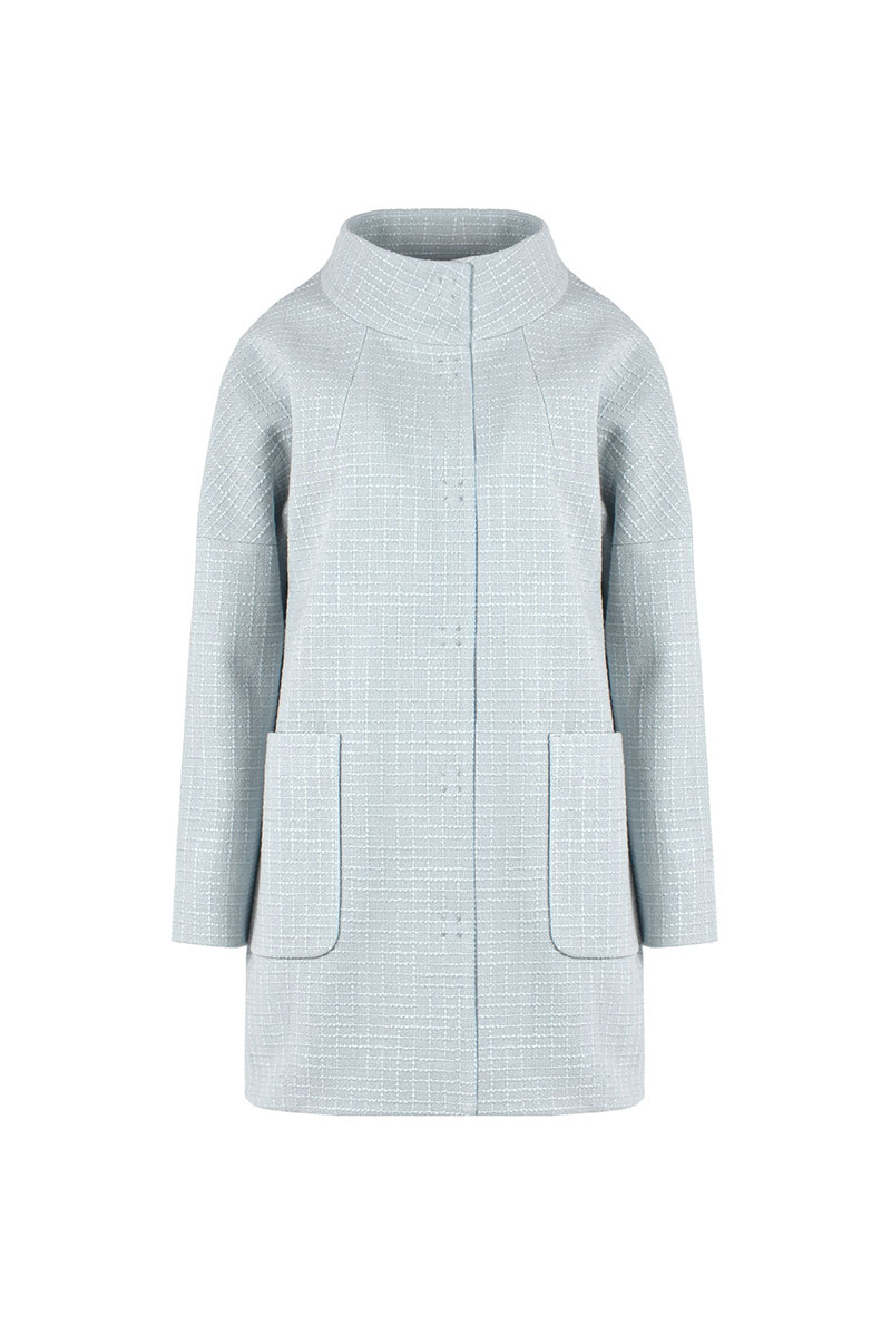 Пальто женское демисезонное на подкладке, длиной до середины бедра, с накладными карманами, застежкой по борту и воротнику на пришивные кнопки. Рукав втачной со спущенный плечом. Воротник - стойка.