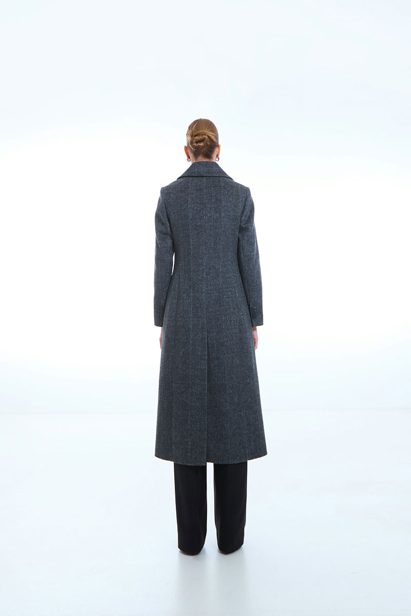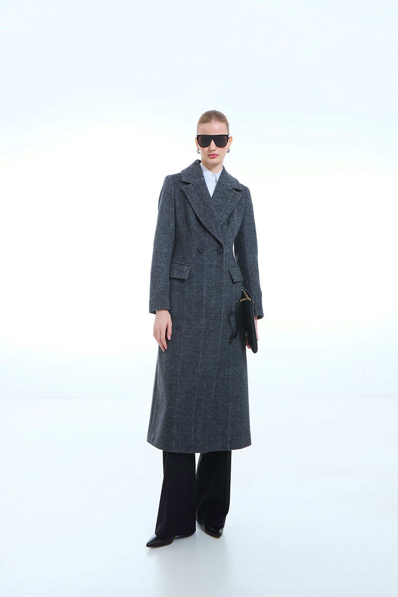 Пальто женское демисезонное, длина «миди». На переде карманы в рамку с клапаном. Застежка двубортная на 1 рабочую сквозную и 2 потайные пуговицы. Рукава втачные двухшовные со шлицей на 4 пуговицы и непрорезные петли. В нижней части среднего шва спинки отлетная шлица. Воротник и лацканы отложные.