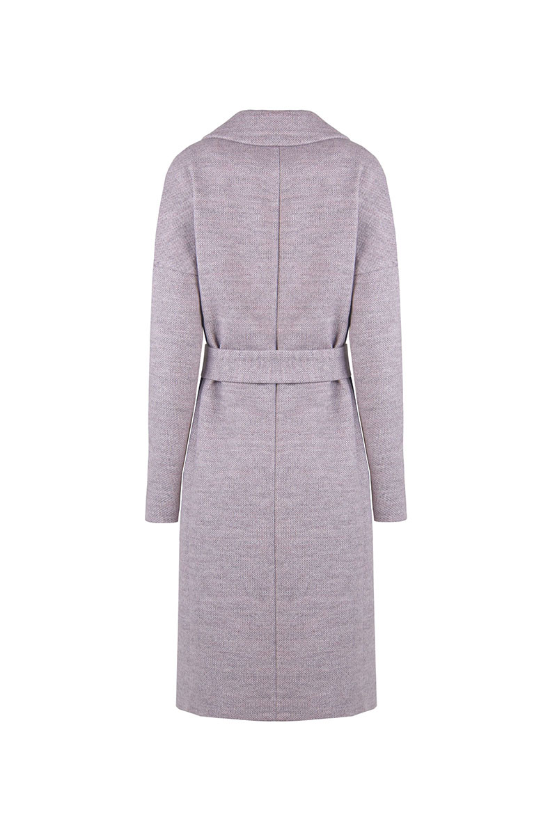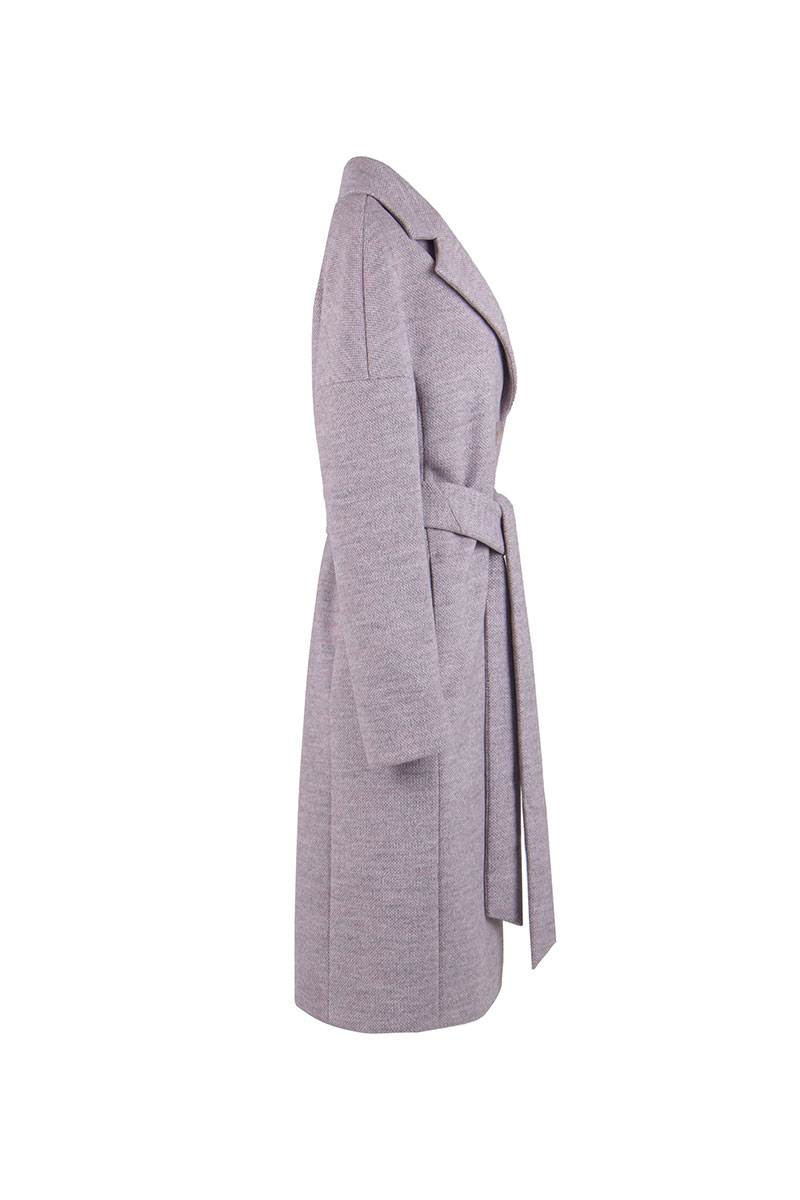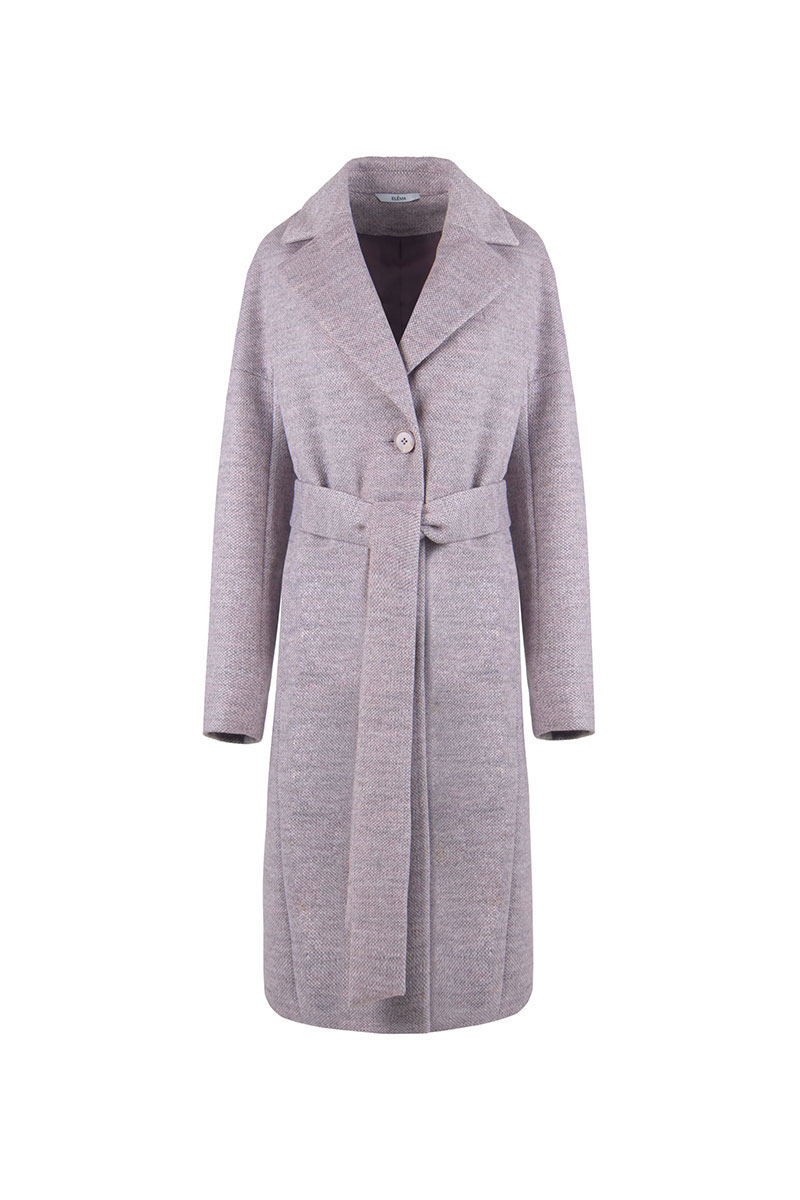 Пальто женское прямого силуэта, длиной ниже колен, однобортное, на подкладке. Карманы – в швах рельефов. Застежка на 3 петли и пуговицы Рукава длинные двухшовные. Воротник и лацкана отложные. В комплекте пояс.