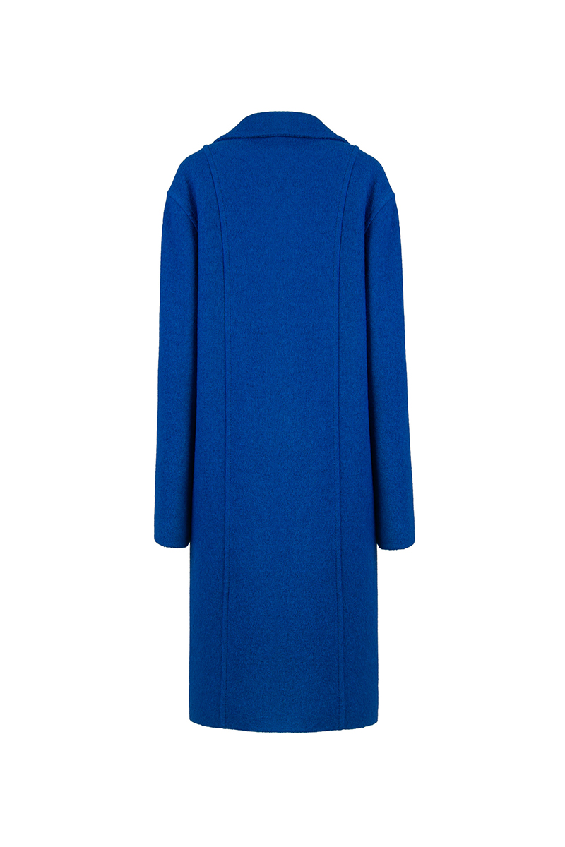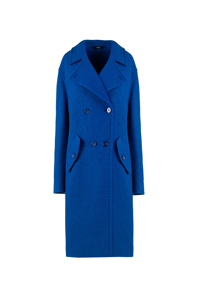 Пальто женское демисезонное, двубортное со скошеной линией борта, прямого силуэта длиной - уровень колена. Застежка на петли и пуговицы. Перед с прорезными карманами листочка с клапаном, застегивающимся на пуговицу. На спинке рельефы. Рукав втачной длинный. Плечо удлиненно, спущенное. Воротник и лацкана отложные. Пальто из полушерстяной пальтовой ткани, на подкладке.