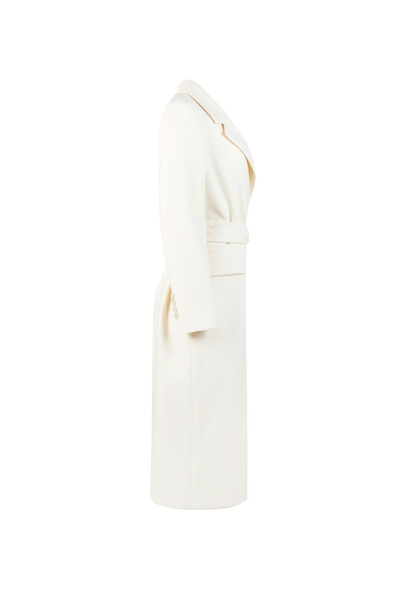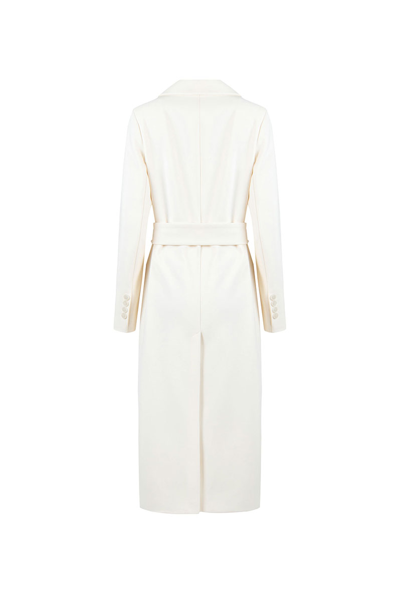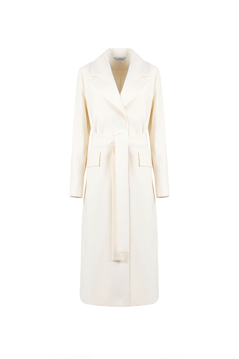 Пальто женское демисезонное, однобортное, прямого силуэта длиной ниже колена. Застежка на пришивные кнопки. Перед с функциональными карманами с клапанами. Спинка со шлицей. Рукав длинный, двухшовный, по низу локтевого шва закрытая шлица на 4 петли и пуговицы. Воротник и лацкана отложные. Пальто на подкладке.