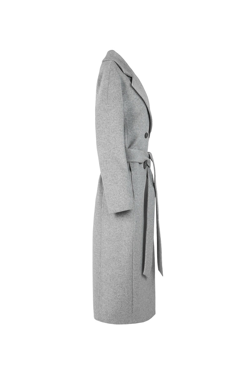 Пальто женское прямого силуэта, на подкладке, длиной ниже колен, двубортное. На спинке шлица, карманы –в швах рельефов. Застежка на 4 петли и пуговицы, дополнительно на 1 потайную петлю и пуговицу. Рукава длинные двухшовные. Воротник и лацкана отложные. В комплекте пояс.