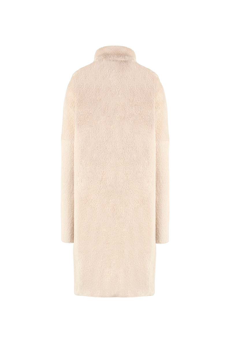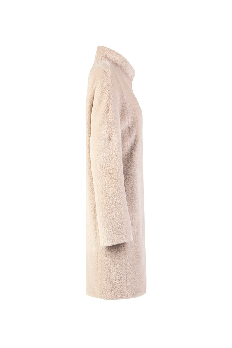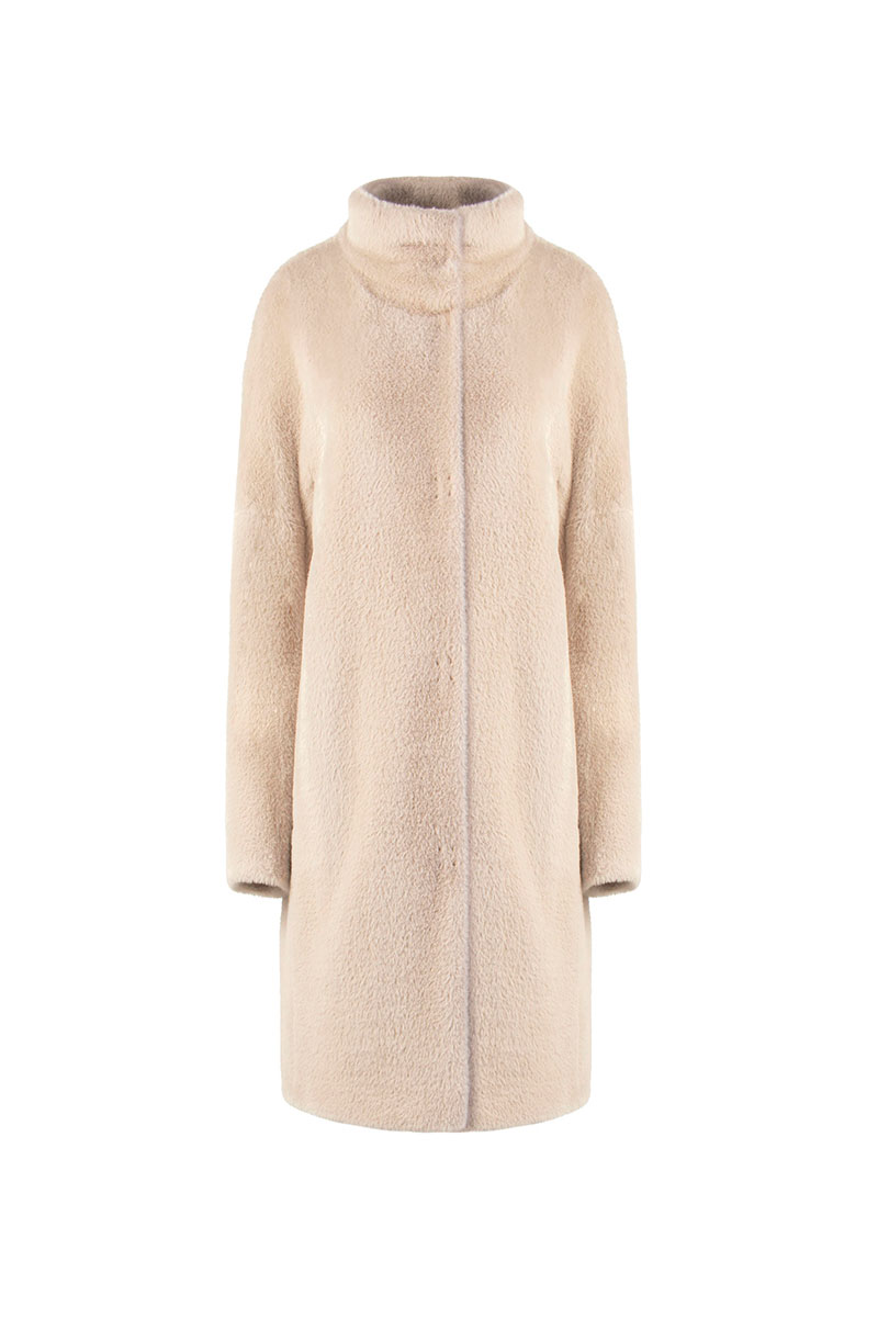 Пальто женское прямого силуэта, длиной до колена, на подкладке. На переде карманы в рельефе. Застежка переда на 5 пришивных кнопок. Воротник стойка. Рукава комбинированные с ластовицей.