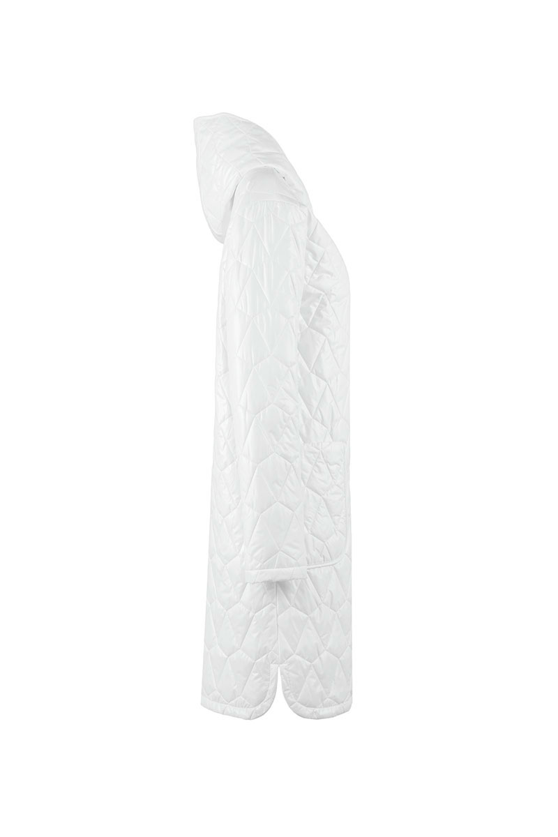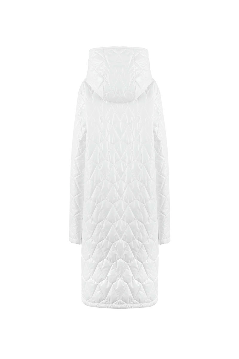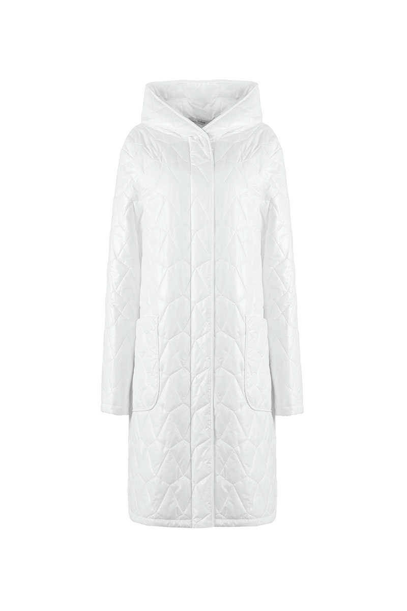 Пальто женское плащевое утепленное, стеганое на утеплителе ISOSFT 120 гр. Прямого силуэта, на подкладке, с капюшоном, длиной до середины колена. Застежка на потайные пробивные кнопки. Перед с накладными карманами. Рукав длинный, одношовный.