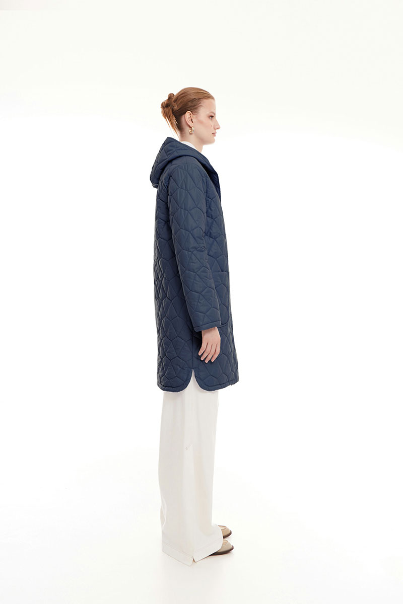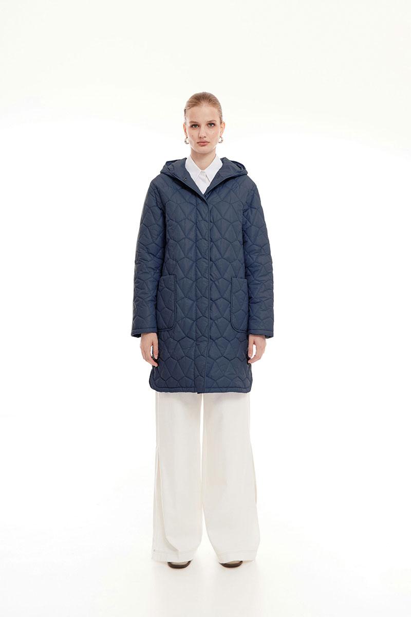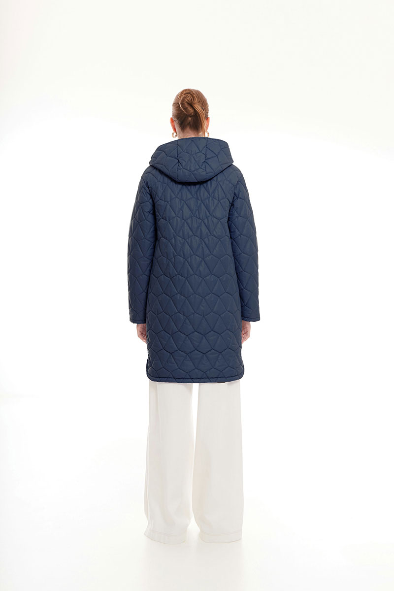 Пальто женское плащевое утепленное, стеганое на утеплителе ISOSFT 120 гр. Прямого силуэта, на подкладке, с капюшоном, длиной до середины колена. Застежка на потайные пробивные кнопки. Перед с накладными карманами. Рукав длинный, одношовный.