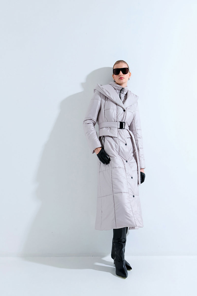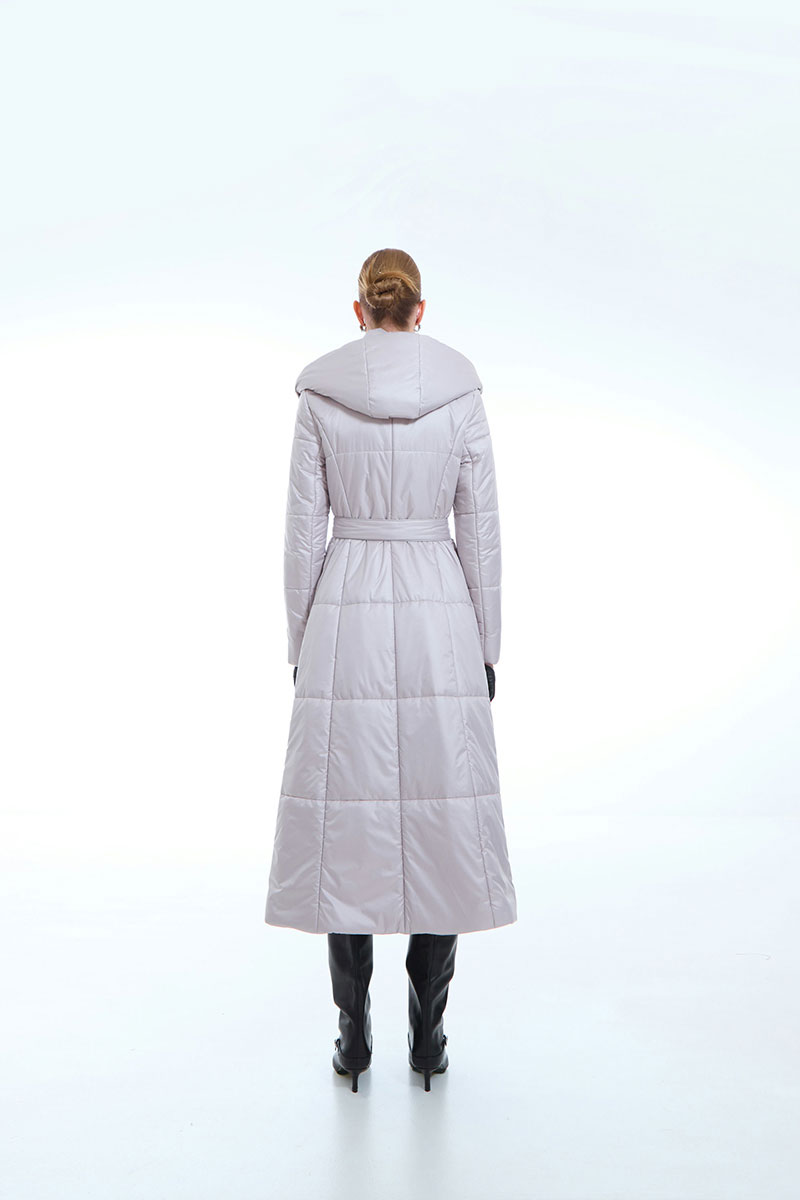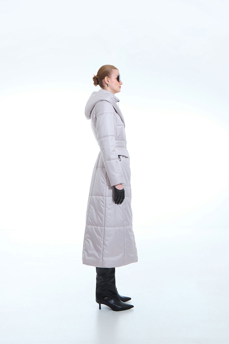 Пальто женское плащевое утепленное, полуприлегающего силуэта, однобортное, длина «миди», на подкладке. Застежка на пробивные кнопки. Перед c карманами-листочка с потайной кнопкой. Рукав длинный, двухшовный. Пальто с капюшоном и «манишкой» с застежкой на молнии, из плащевой ткани, стеганой на утеплителе ISOSOFT 200 гр.