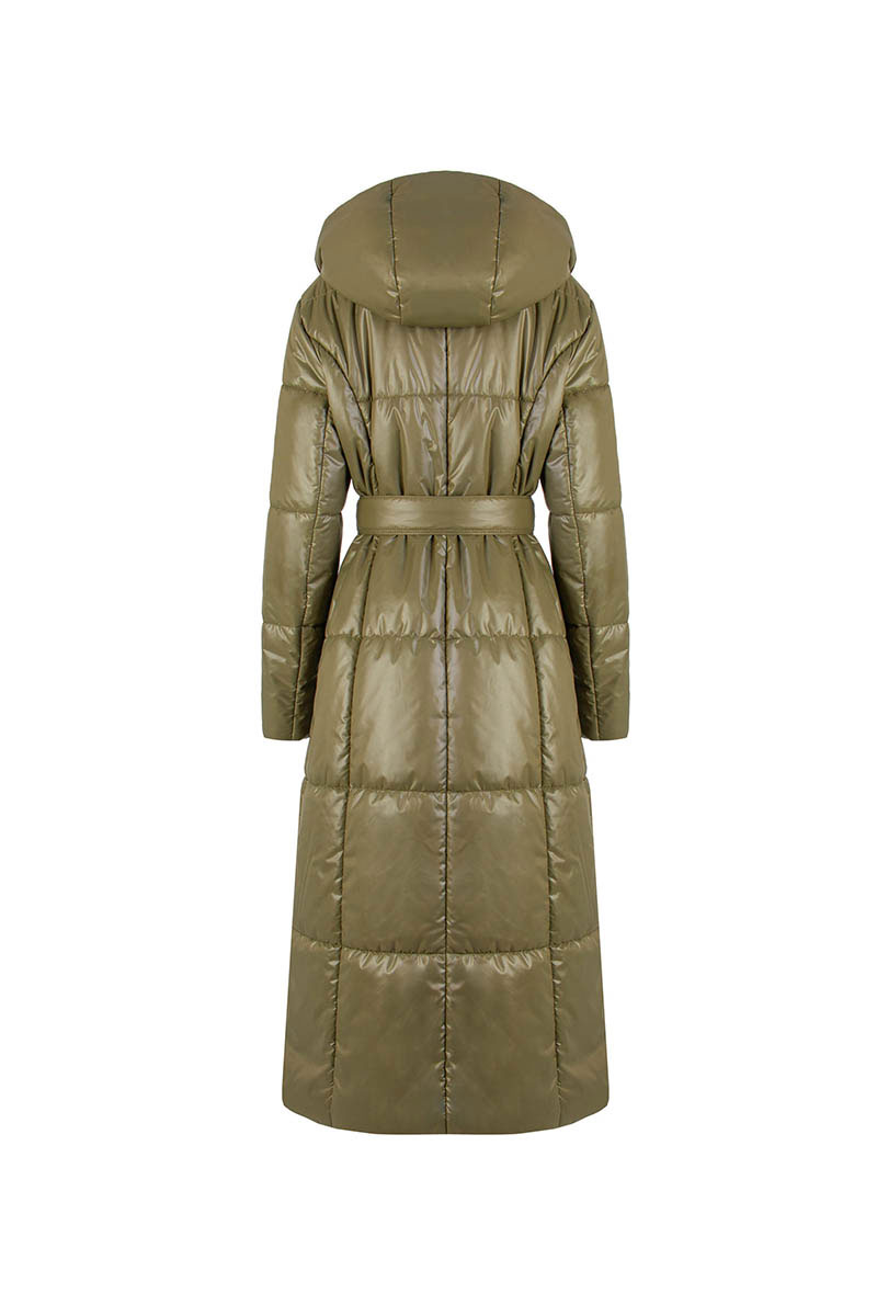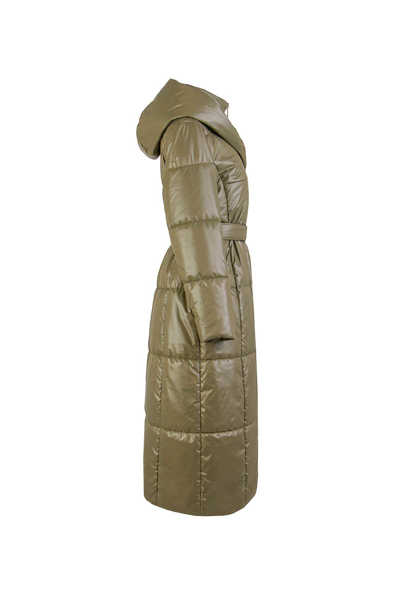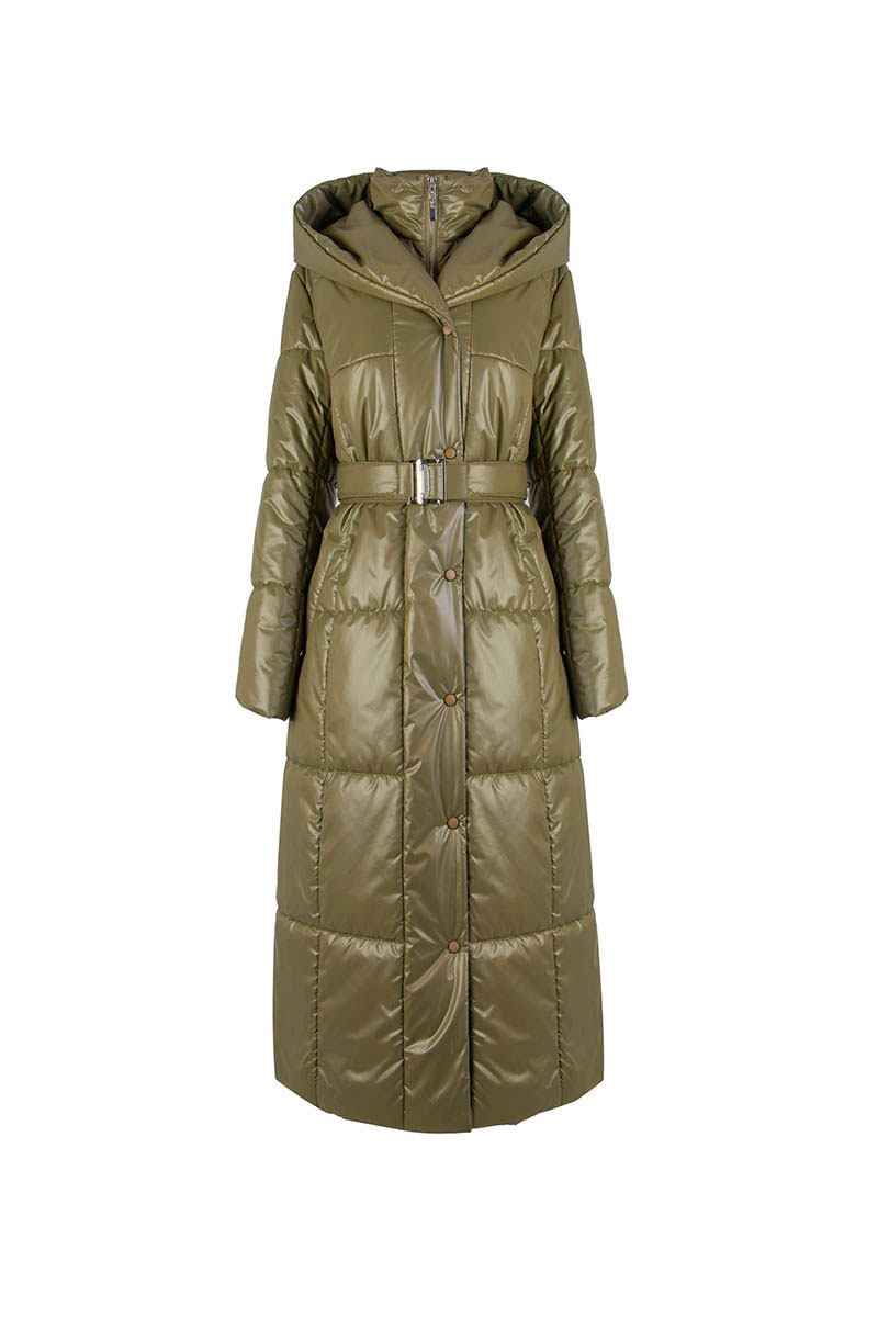 Пальто женское плащевое утепленное, полуприлегающего силуэта, однобортное, длина «миди», на подкладке. Застежка на пробивные кнопки. Перед c карманами-листочка с потайной кнопкой. Рукав длинный, двухшовный. Пальто с капюшоном и «манишкой» с застежкой на молнии, из плащевой ткани, стеганой на утеплителе ISOSOFT 200 гр.