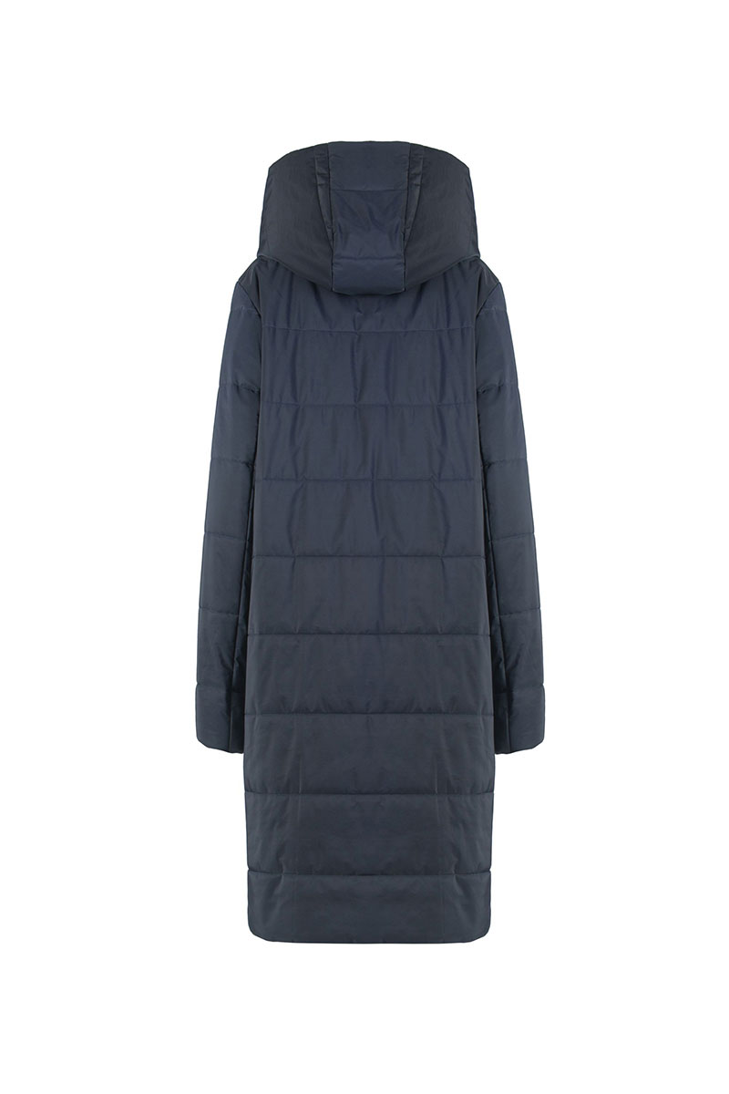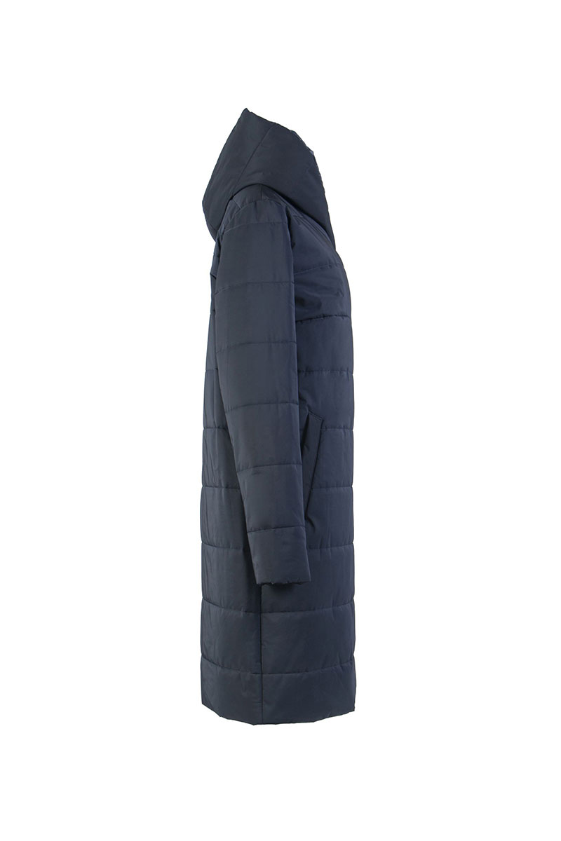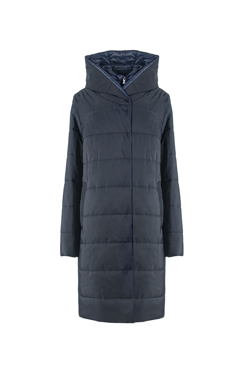 Пальто женское плащевое утепленное прямого силуэта, двубортное, длиной ниже колена, на подкладке. Застежка на пробивные потайные кнопки. Перед c карманами листочка, застегивающимися на потайную кнопку. Рукав длинный, двухшовный. Пальто с капюшоном и «манишкой» с застежкой на молнии, из плащевой ткани, стеганой на утеплителе ISOSOFT 200г.