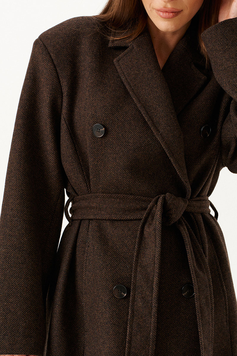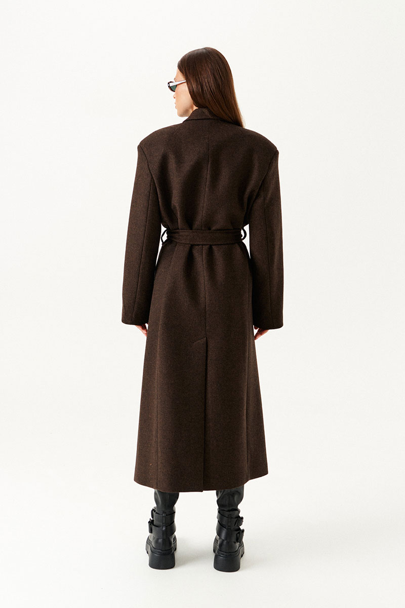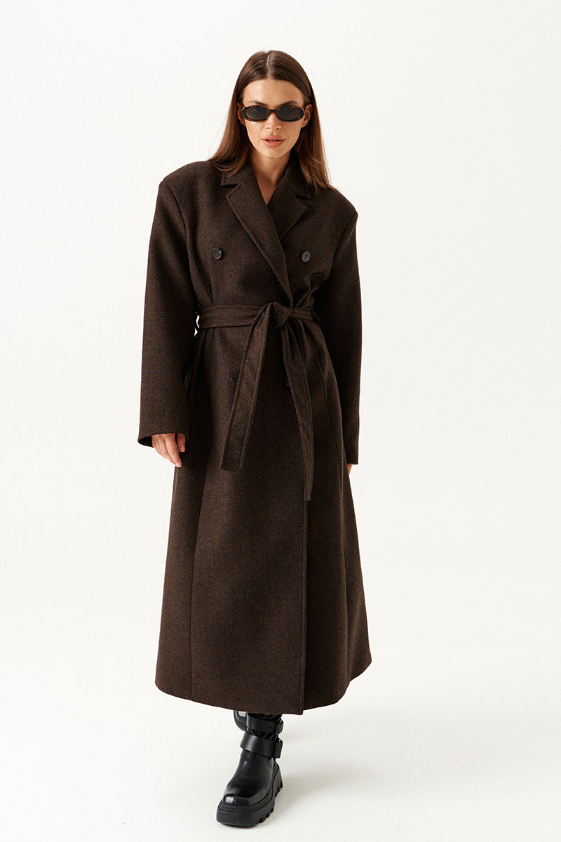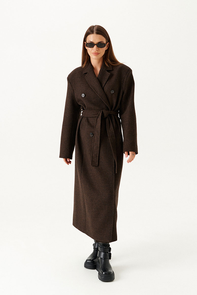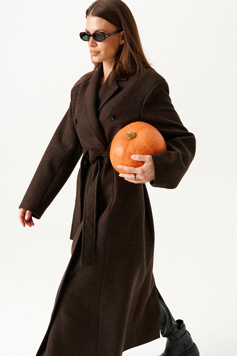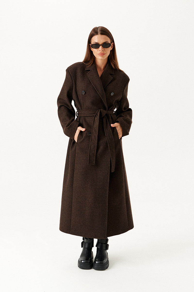Пальто из пальтовой ткани, прямого силуэта, свободное, со спущенной линией плеча, с центральной двубортной застежкой на петли и пуговицы, отложным воротником и лацканами пиджачного типа, на подкладке. Полочки с отрезными бочками и карманами в швах. Спинка со средним швом и шлицей, с отрезными бочками и плечевыми вытачками. Рукав втачной, длинный, двухшовный. В комплекте пояс из основной ткани.