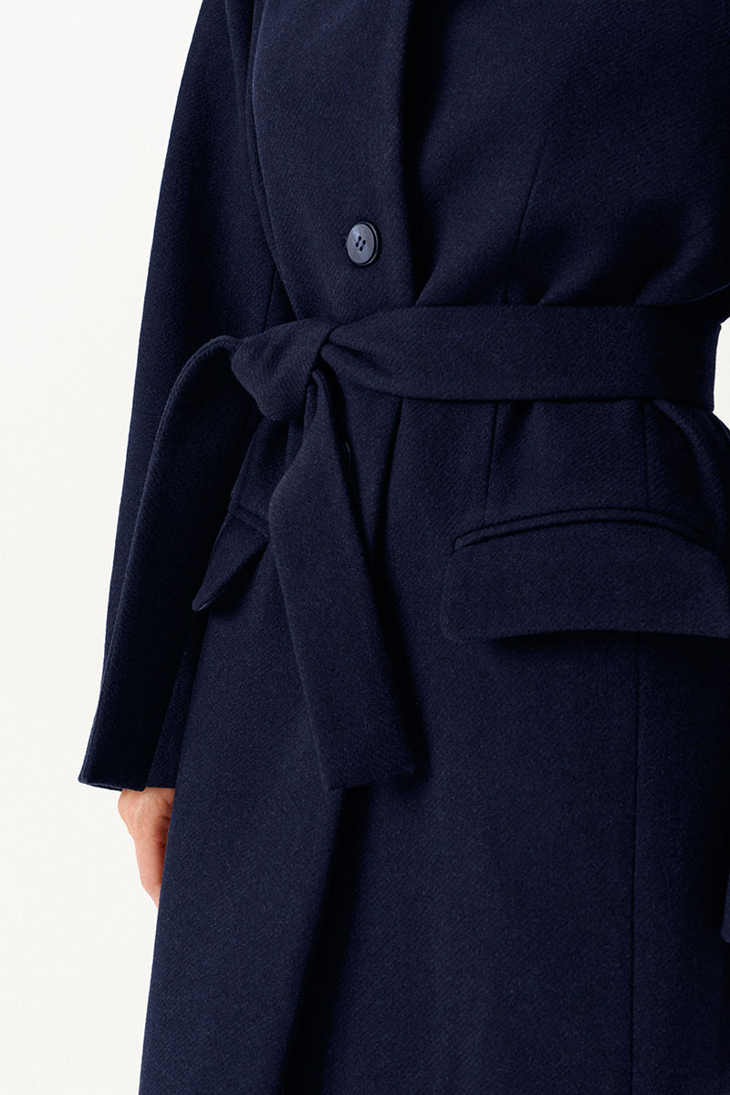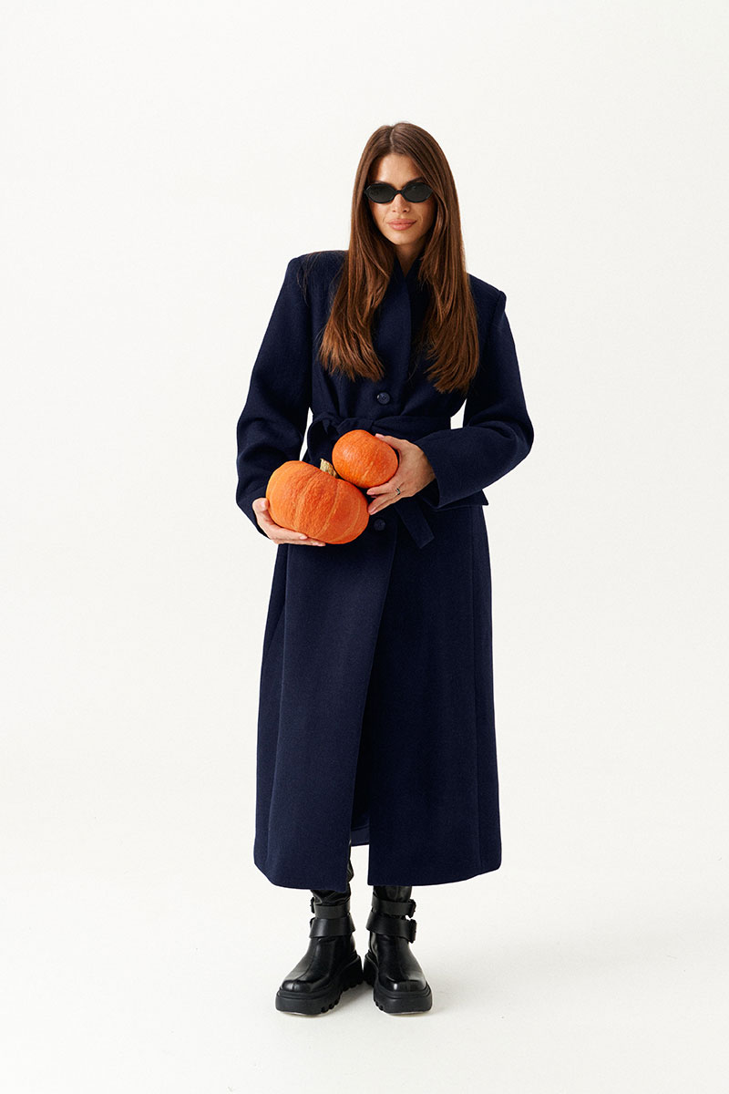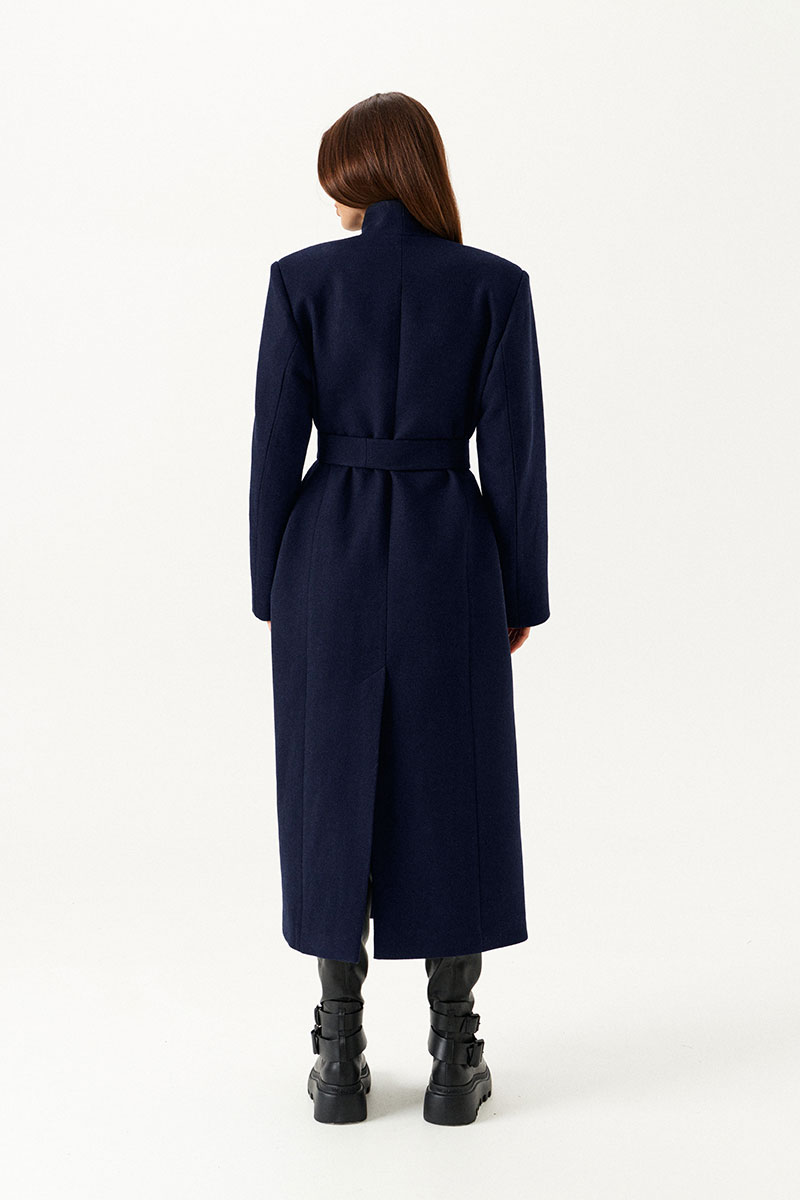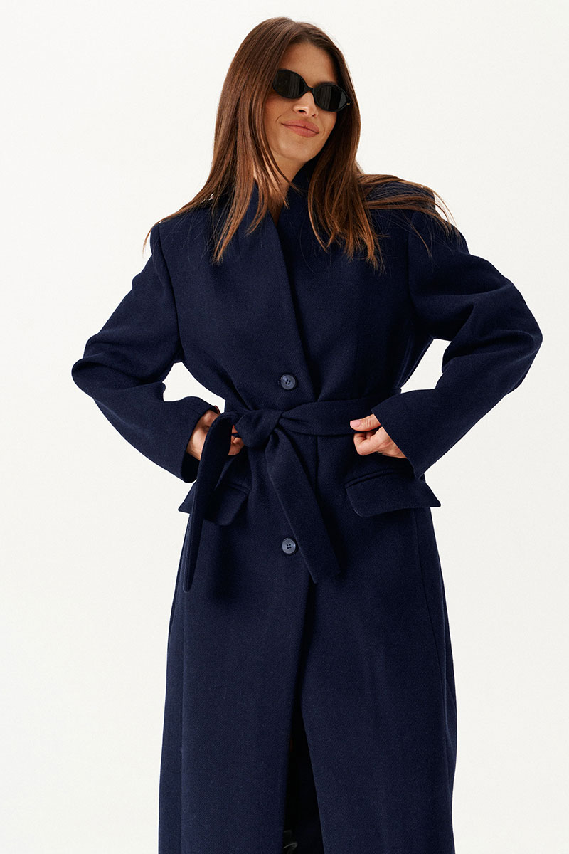 Пальто из пальтовой ткани, прямого силуэта, свободное, с центральной застежкой на петли и пуговицы, на подкладке. Воротник – цельнокроеная стойка. Полочки с отрезными бочками и прорезными карманами с клапаном и двумя обтачками. Спинка с отрезными бочками, со средним швом и шлицей. Рукав втачной, двухшовный, длинный. В комплекте пояс из основной ткани.