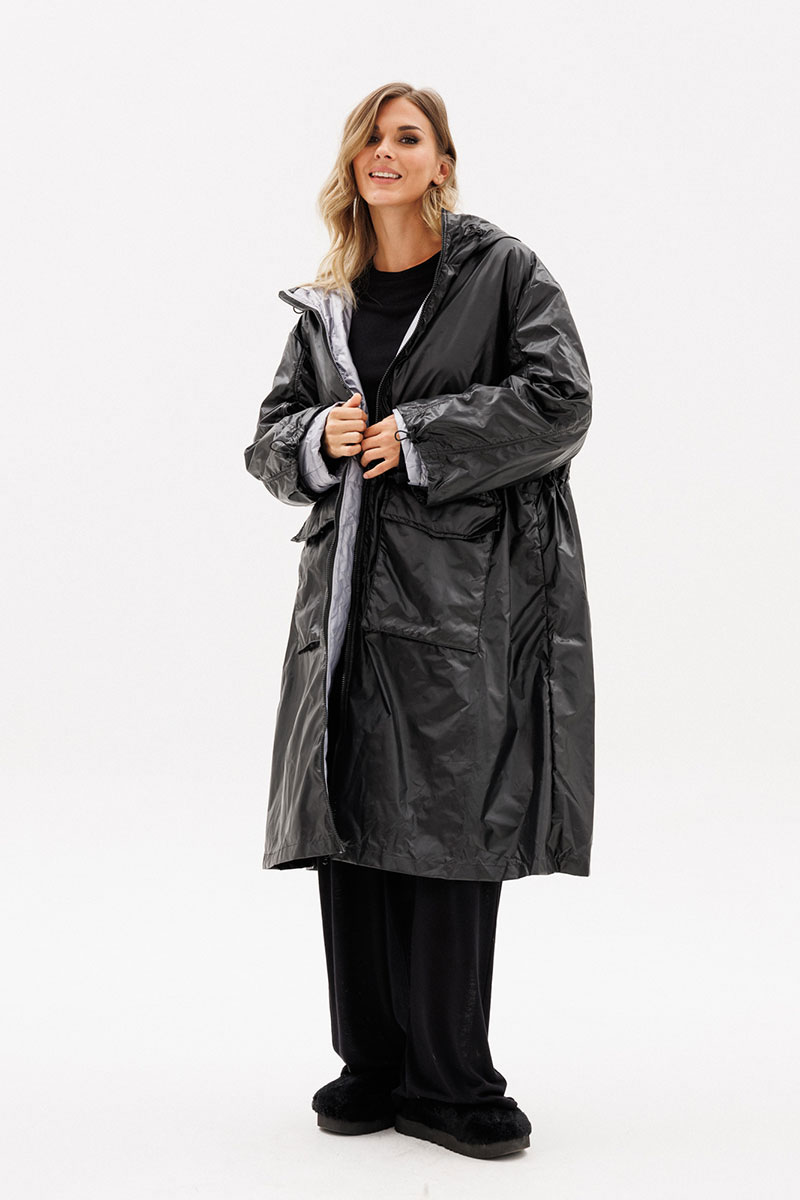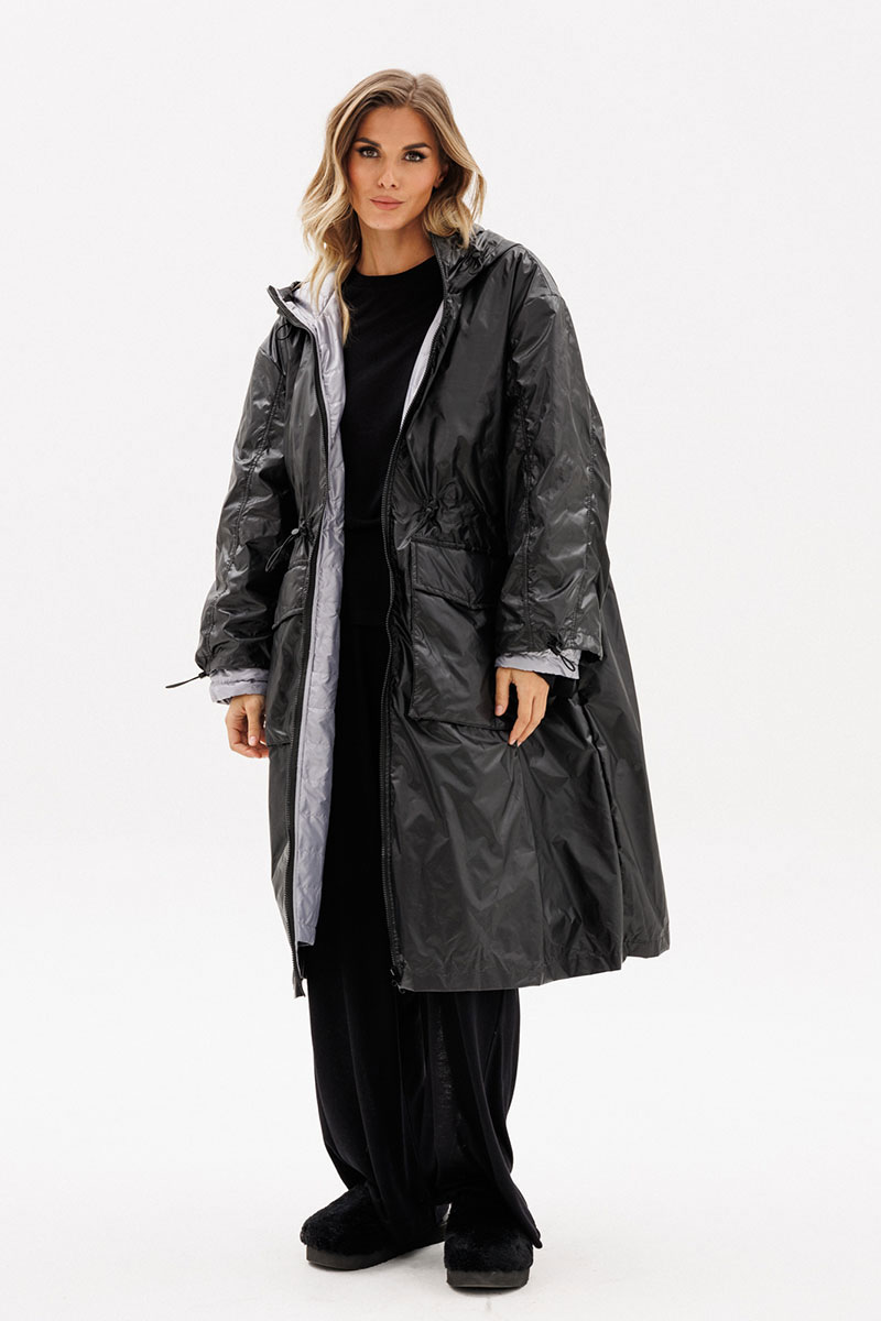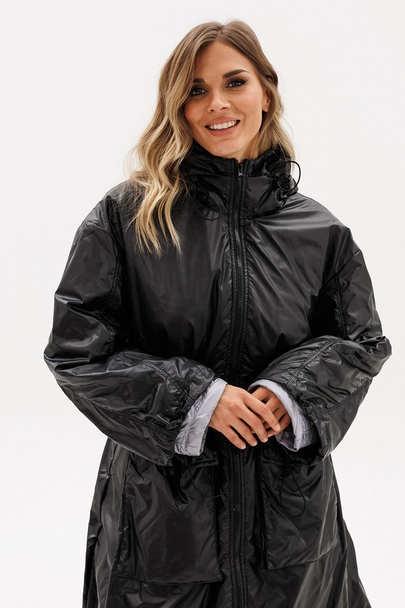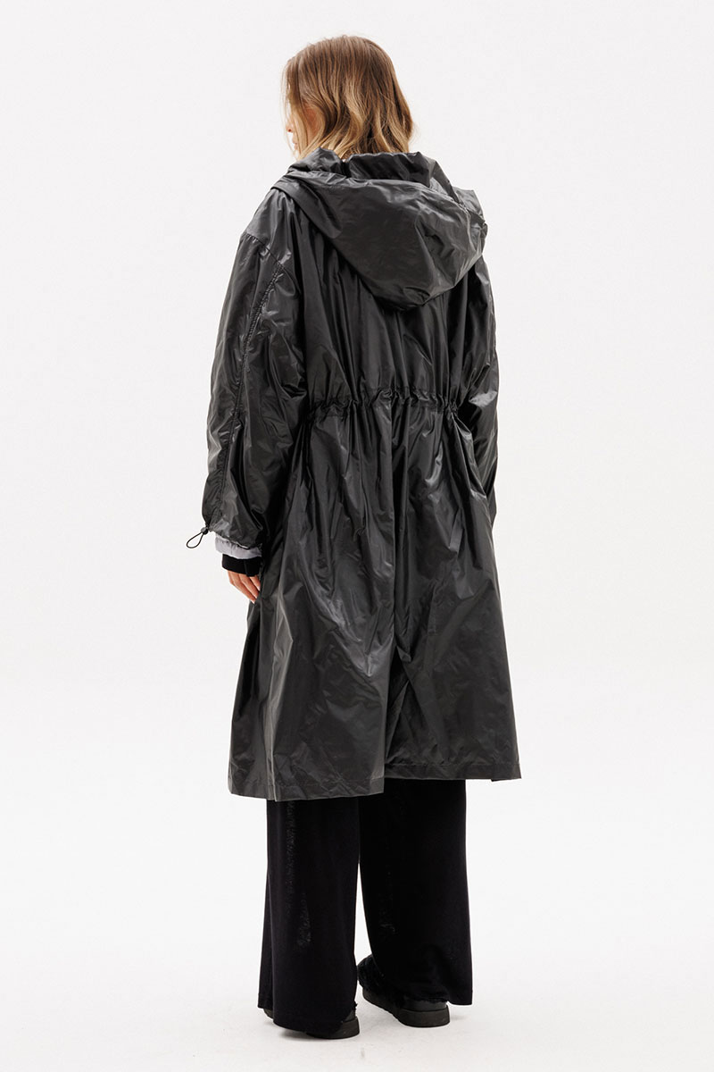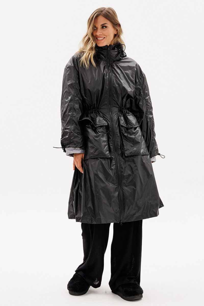 Пальто выполнено из плащевой ткани, утепленное Isosoft. Пальто Х-образного силуэта, длиной ниже линии колена. Спереди накладные карманы с клапанами и центральная застежка на молнию. Спинка цельная. По линии талии кулиса с эластичной тесьмой. Горловина округлой формы с капюшоном. Плечевой шов удлинен. Рукав рубашечного покроя, трехшовный. По низу рукава и краю капюшона эластичная тесьма с фиксаторами. Пальто на отлетной по низу подкладке из основной ткани стеганой с утеплителем.