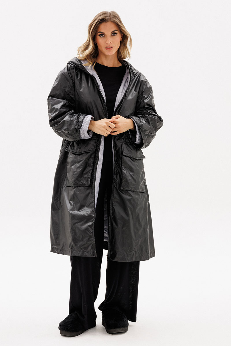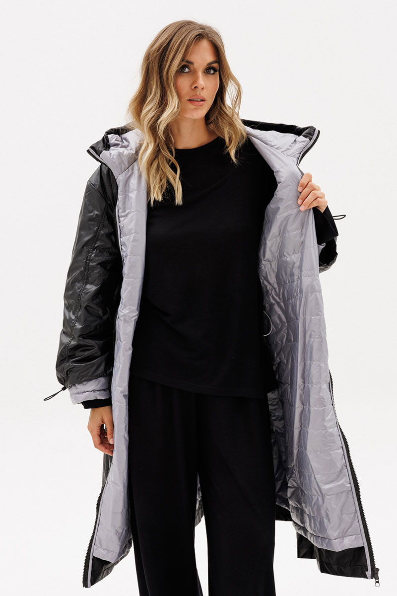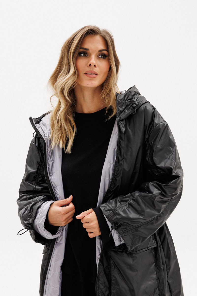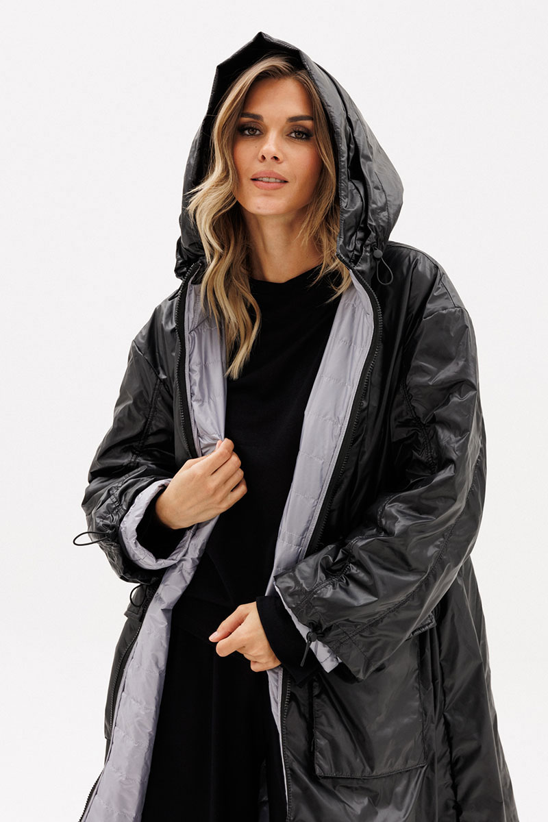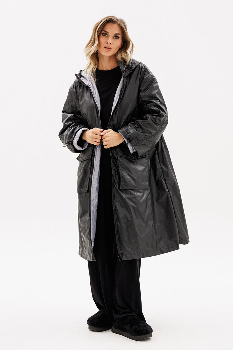 Пальто выполнено из плащевой ткани, утепленное Isosoft. Пальто Х-образного силуэта, длиной ниже линии колена. Спереди накладные карманы с клапанами и центральная застежка на молнию. Спинка цельная. По линии талии кулиса с эластичной тесьмой. Горловина округлой формы с капюшоном. Плечевой шов удлинен. Рукав рубашечного покроя, трехшовный. По низу рукава и краю капюшона эластичная тесьма с фиксаторами. Пальто на отлетной по низу подкладке из основной ткани стеганой с утеплителем.