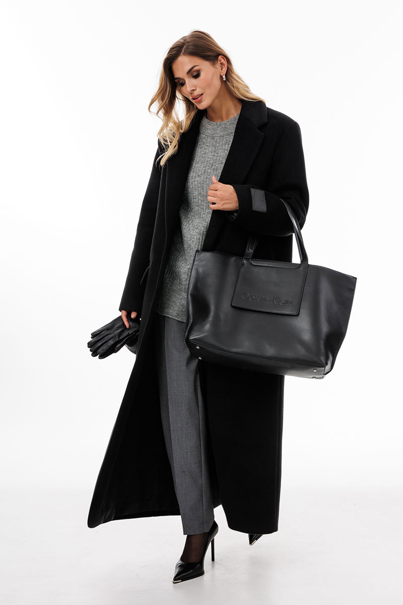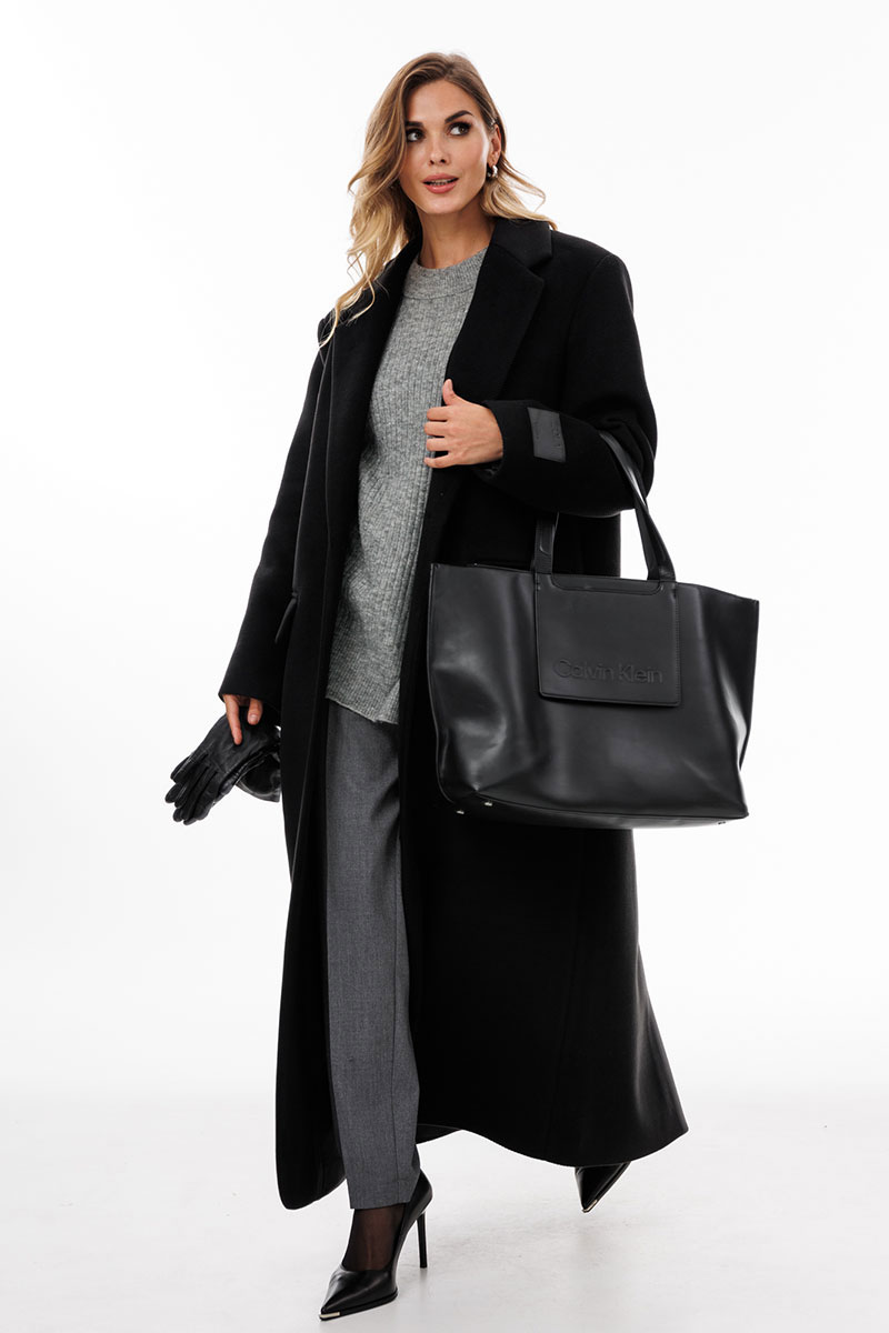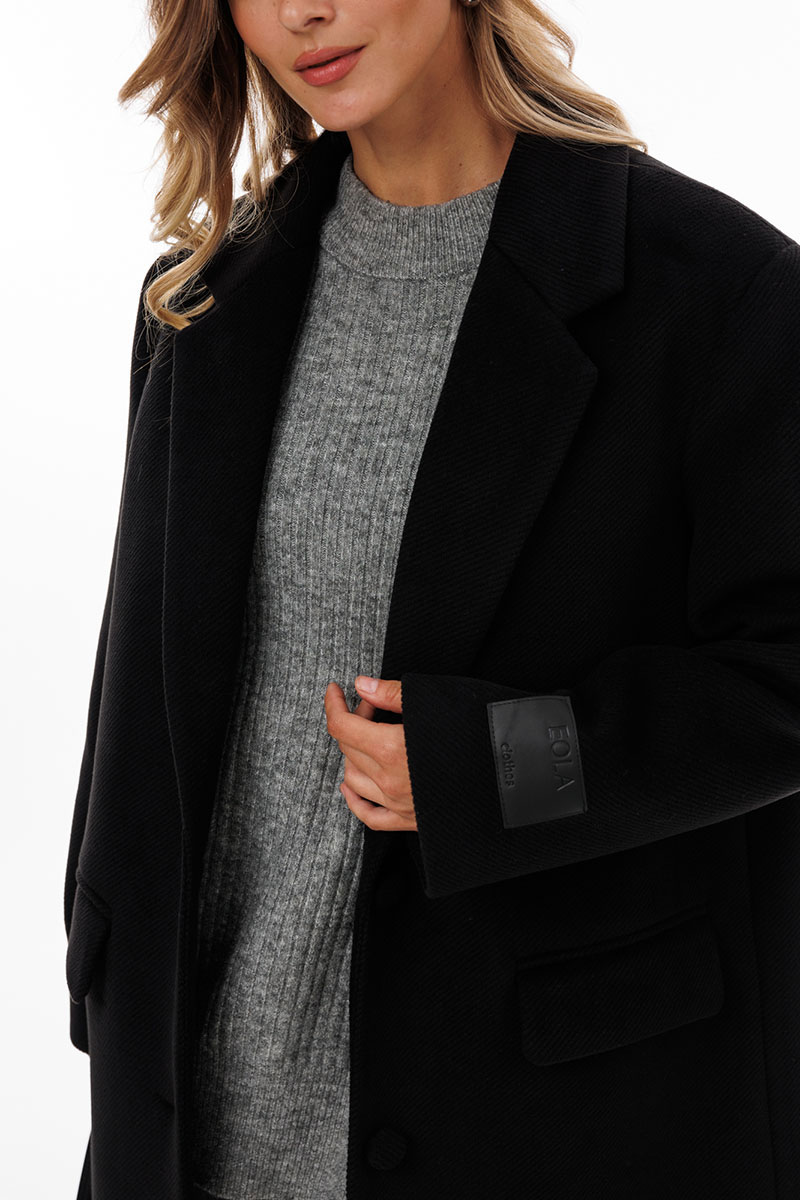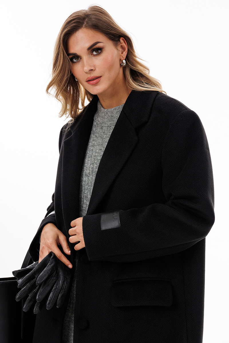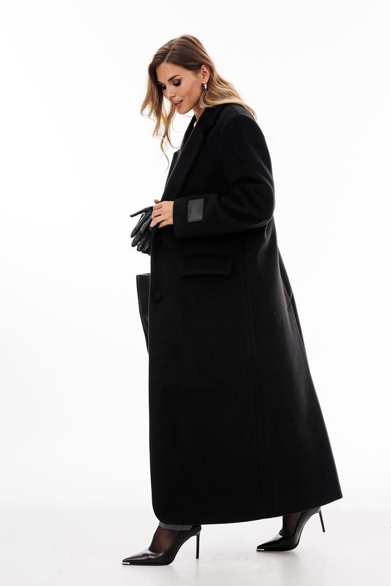 Пальто выполнено из пальтовой ткани в рубчик. Пальто прямого силуэта, длиной до линии щиколотки. Спереди застежка на две пуговицы, горизонтальные прорезные карманы. Спинка со средним швом со шлицей по низу. Воротник пиджачного типа. Плечевой шов удлинен. Рукав втачной, двухшовный. Пальто на притачной по низу подкладке. Пальто декорировано по рукаву нашивкой из натуральной кожи.