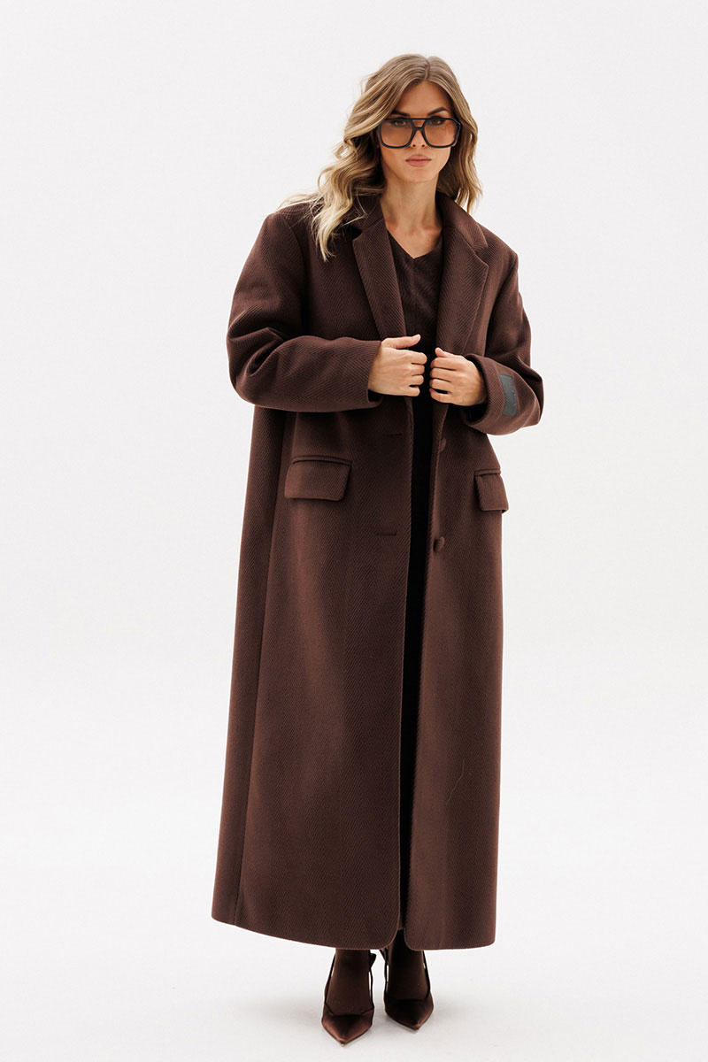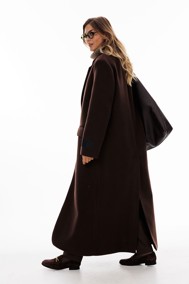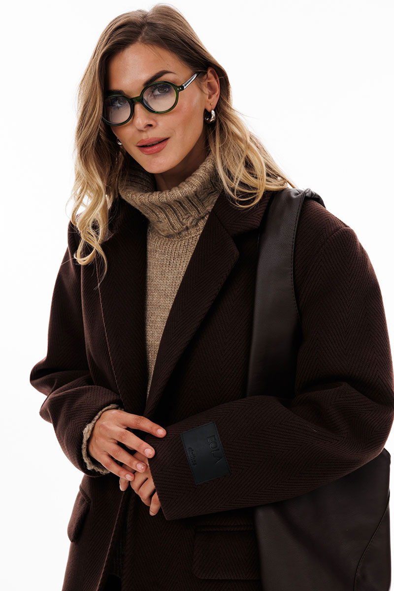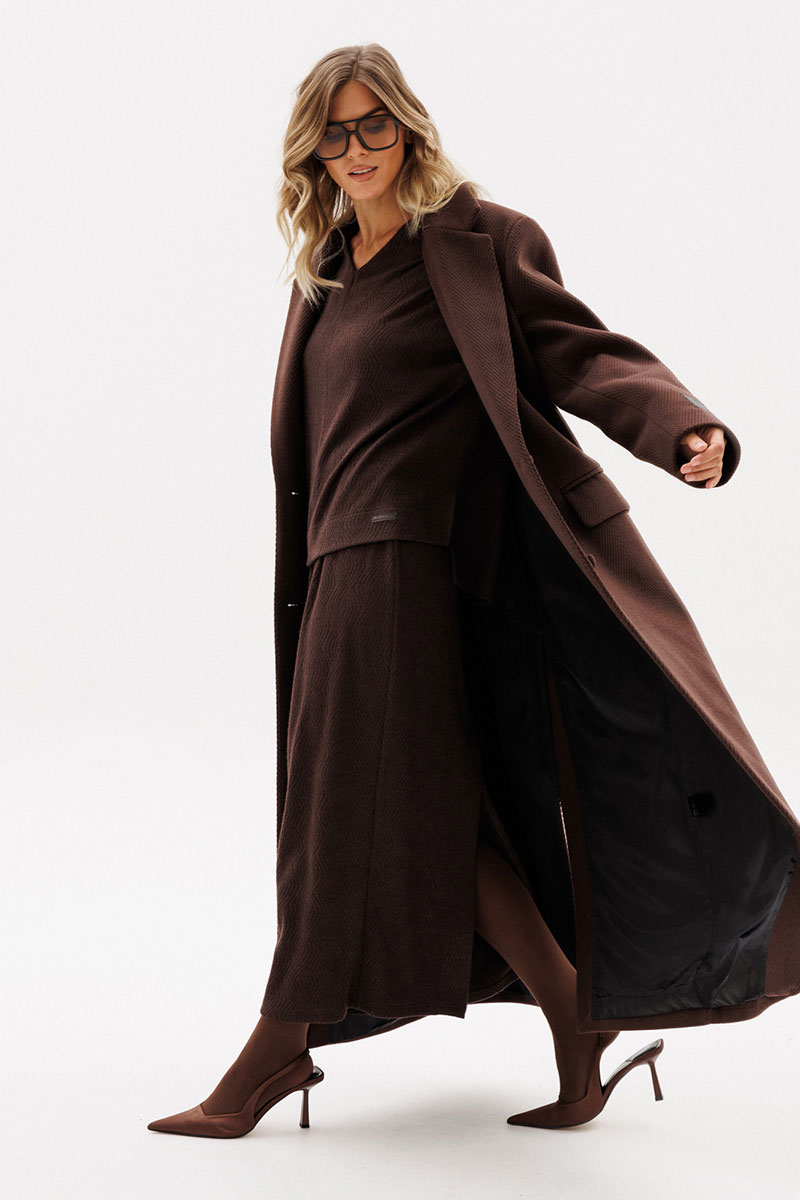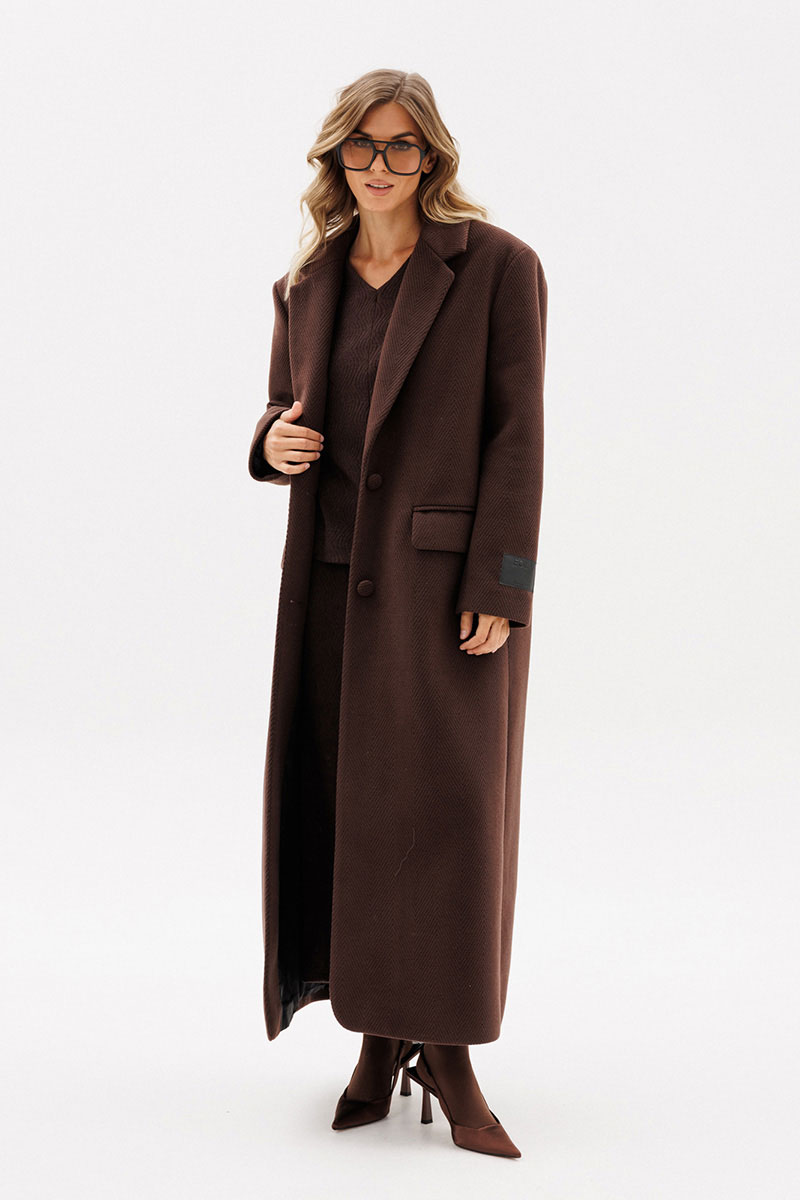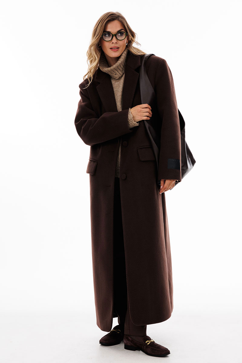 Пальто выполнено из пальтовой ткани в рубчик. Пальто прямого силуэта, длиной до линии щиколотки. Спереди застежка на две пуговицы, горизонтальные прорезные карманы. Спинка со средним швом со шлицей по низу. Воротник пиджачного типа. Плечевой шов удлинен. Рукав втачной, двухшовный. Пальто на притачной по низу подкладке. Пальто декорировано по рукаву нашивкой из натуральной кожи.