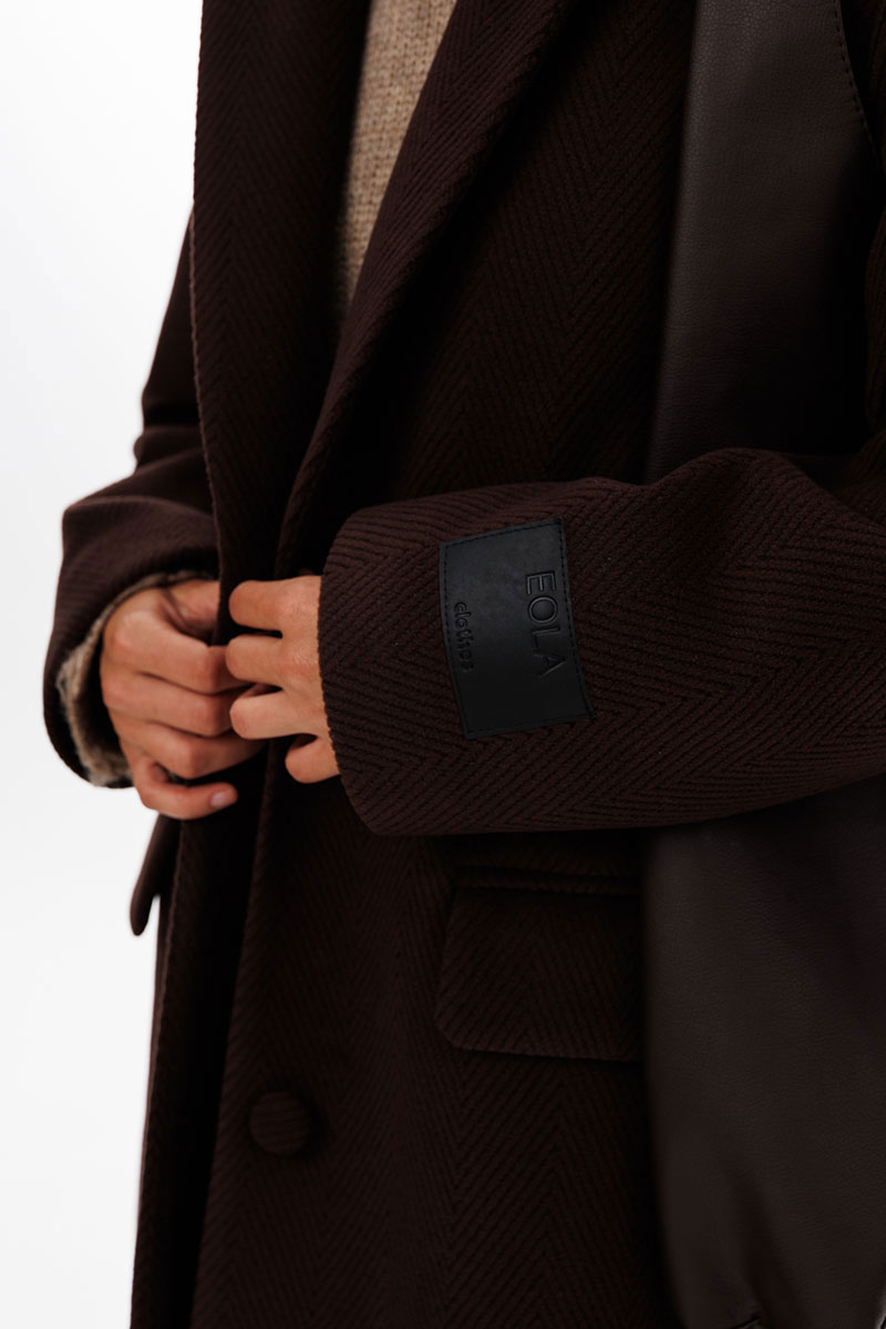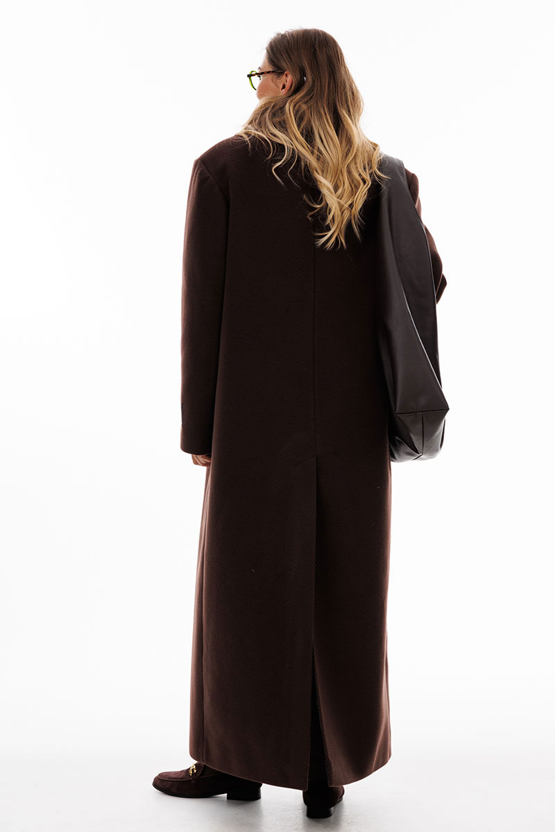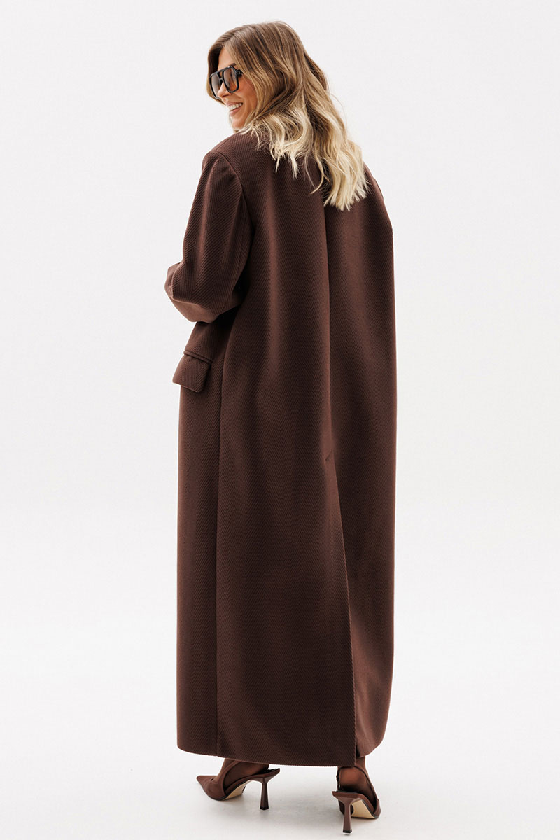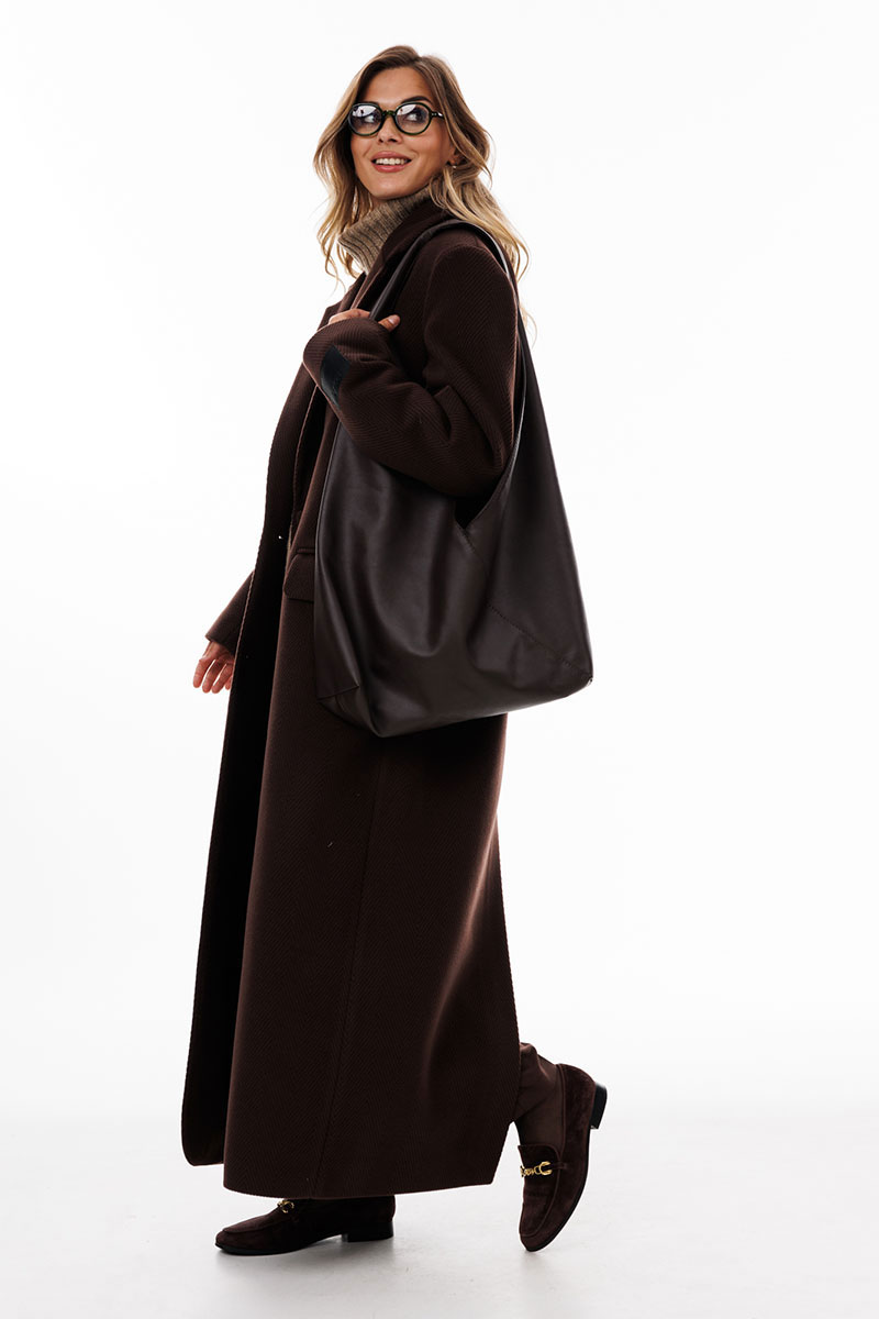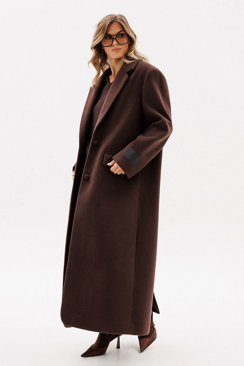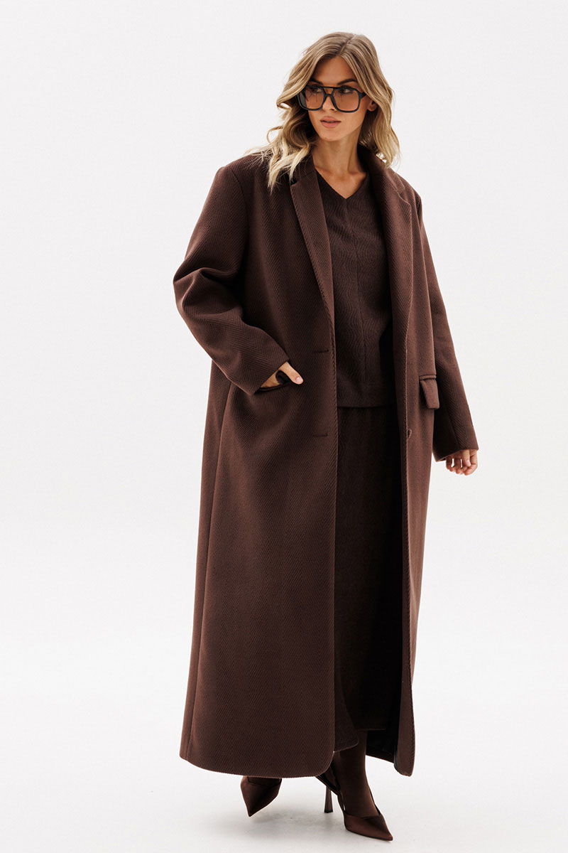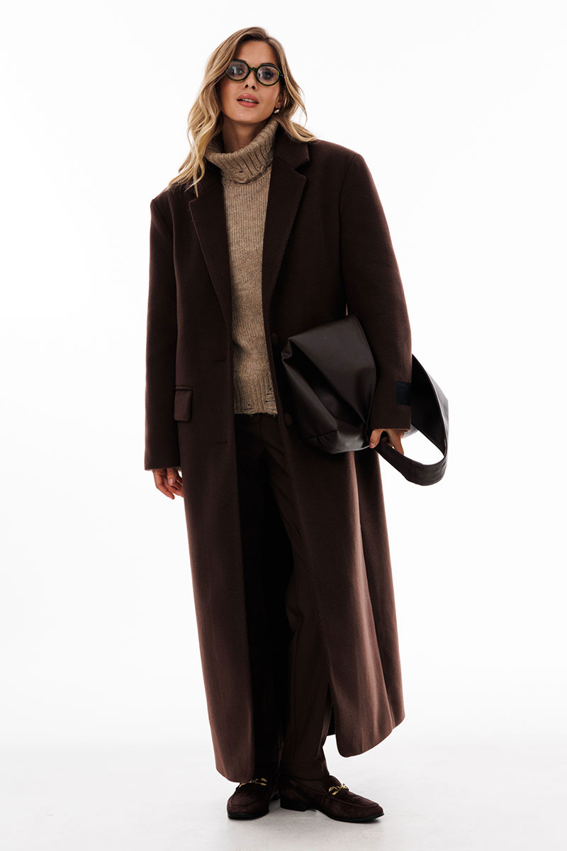 Пальто выполнено из пальтовой ткани в рубчик. Пальто прямого силуэта, длиной до линии щиколотки. Спереди застежка на две пуговицы, горизонтальные прорезные карманы. Спинка со средним швом со шлицей по низу. Воротник пиджачного типа. Плечевой шов удлинен. Рукав втачной, двухшовный. Пальто на притачной по низу подкладке. Пальто декорировано по рукаву нашивкой из натуральной кожи.