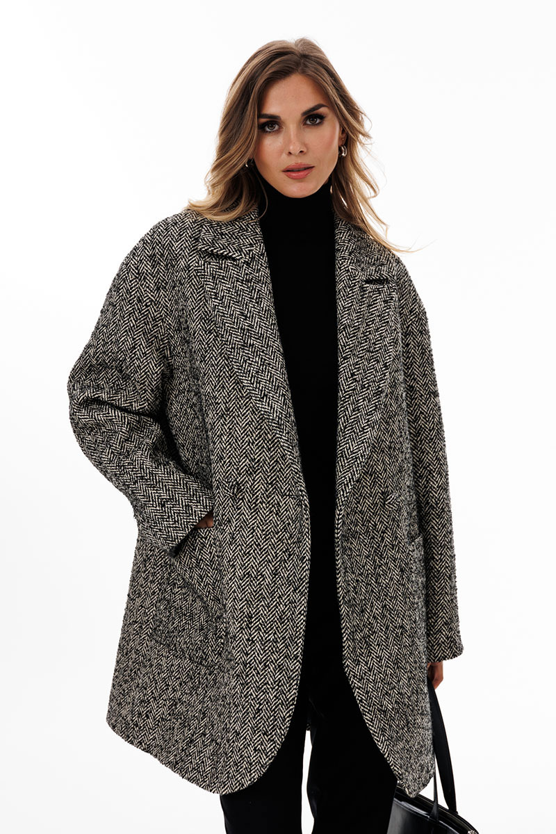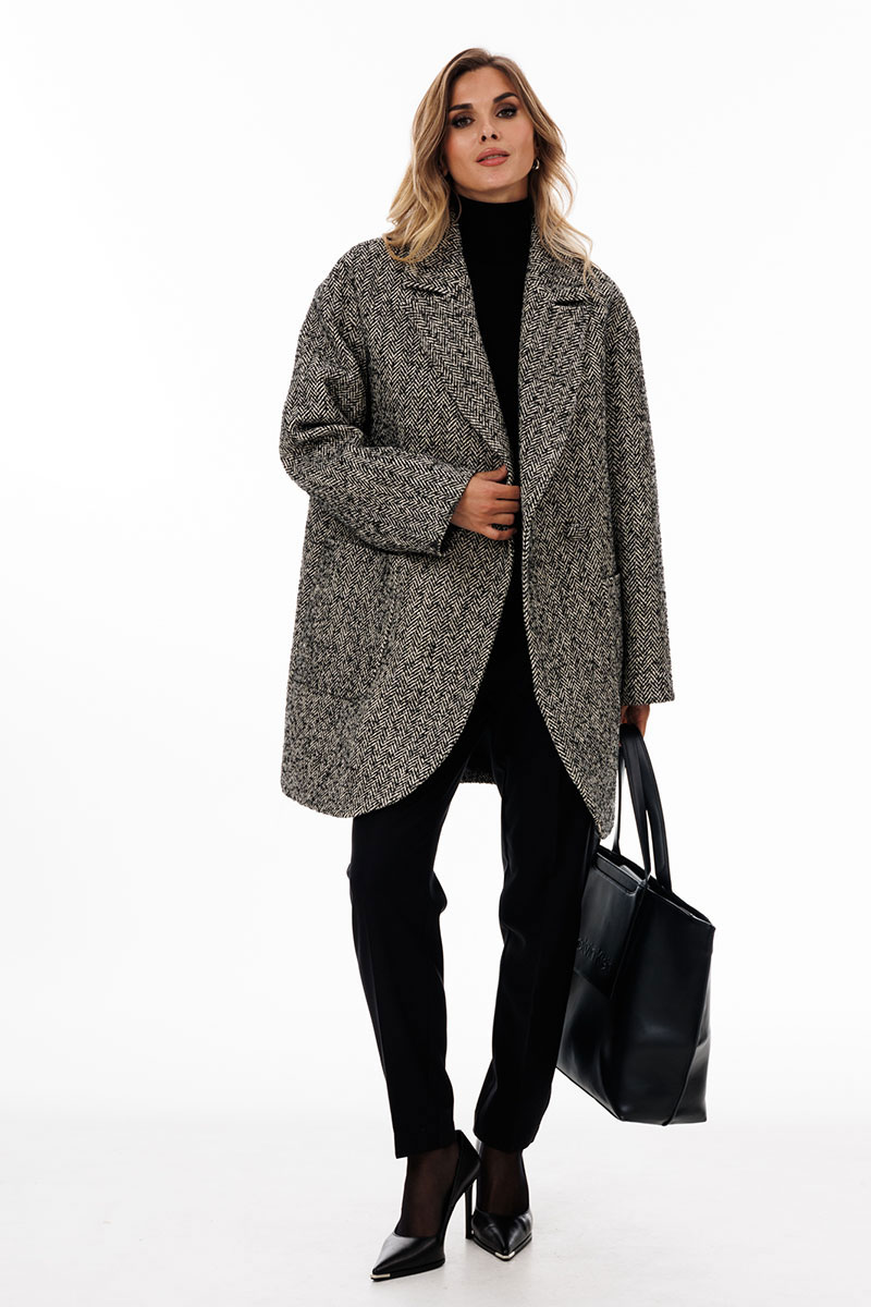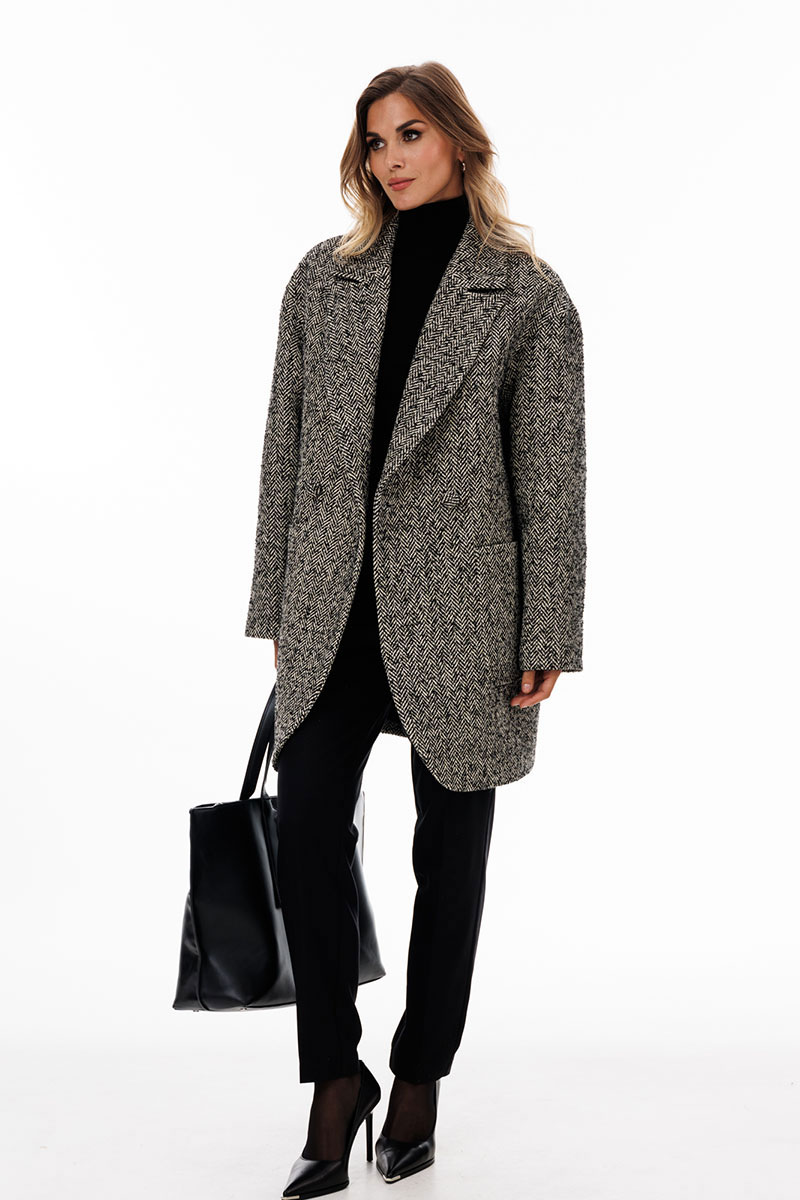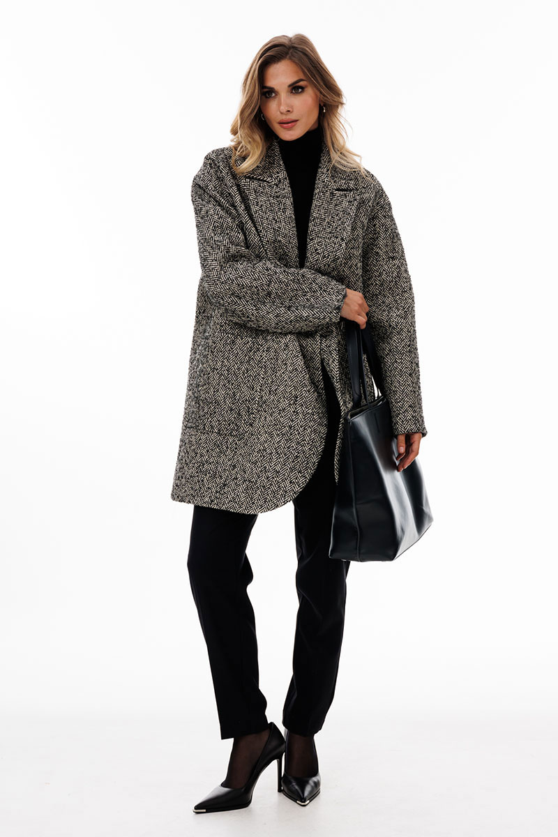 Полупальто выполнено из пальтовой ткани, меланж с рисунком "елочка". Спереди накладные карманы, двубортная застежка. На спинке средний шов. Воротник пиджачного типа. Плечевой шов удлинен. Рукав рубашечного покроя, одношовный с локтевой вытачкой. Полупальто на притачной по низу подкладке.