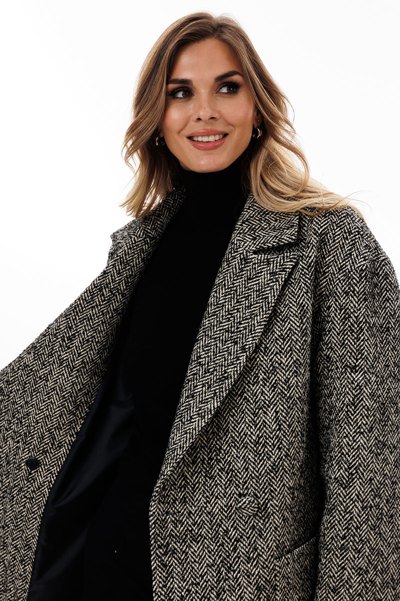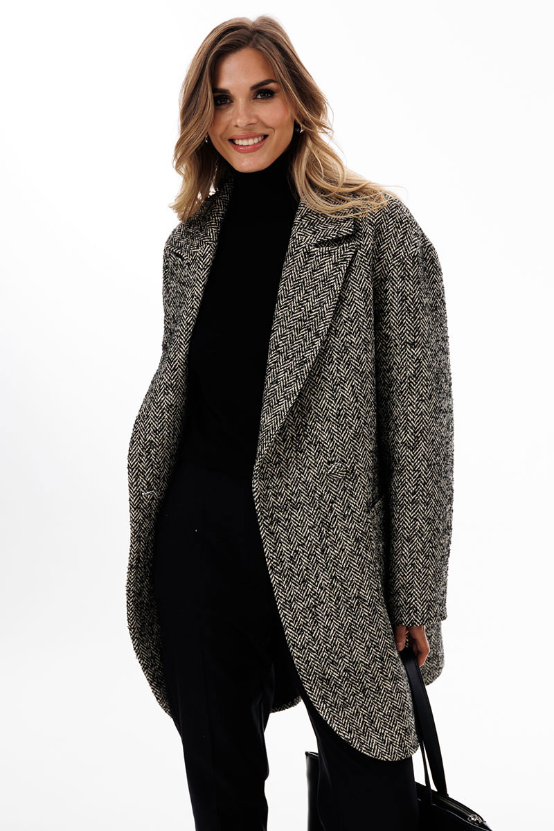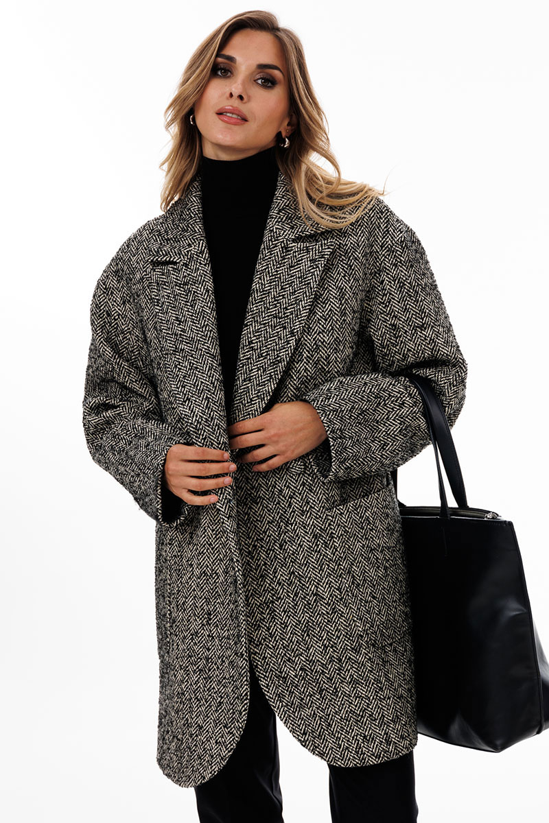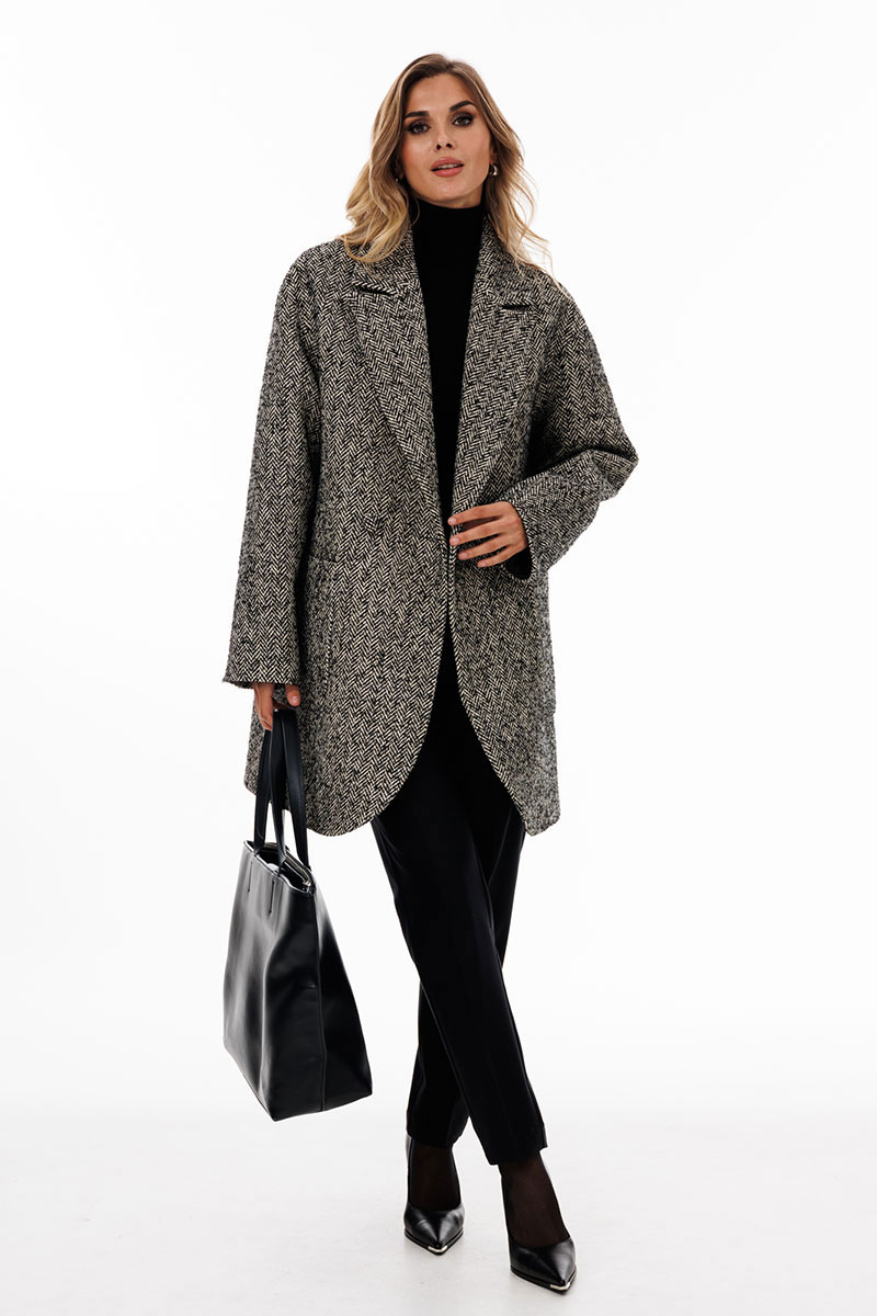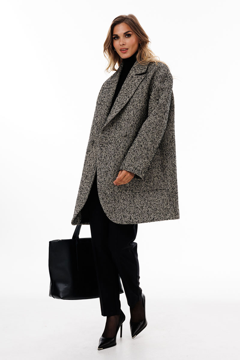 Полупальто выполнено из пальтовой ткани, меланж с рисунком "елочка". Спереди накладные карманы, двубортная застежка. На спинке средний шов. Воротник пиджачного типа. Плечевой шов удлинен. Рукав рубашечного покроя, одношовный с локтевой вытачкой. Полупальто на притачной по низу подкладке.