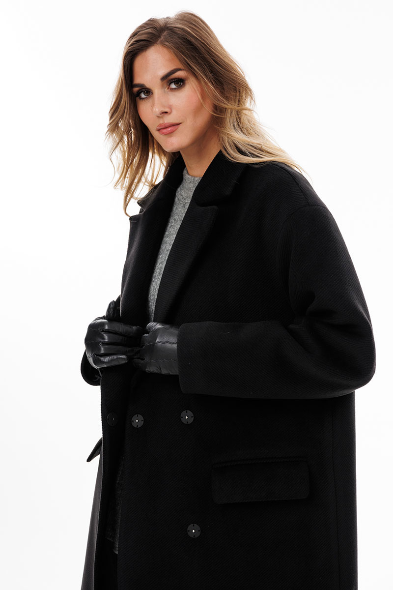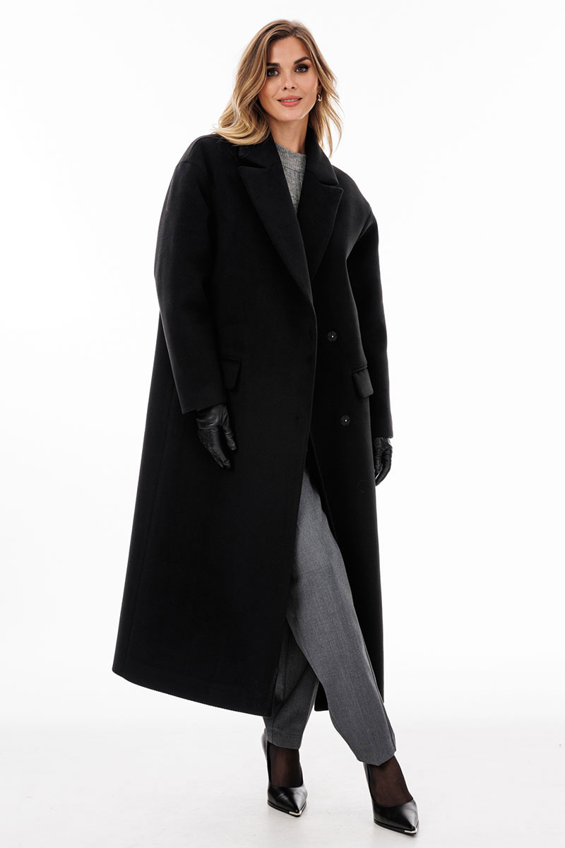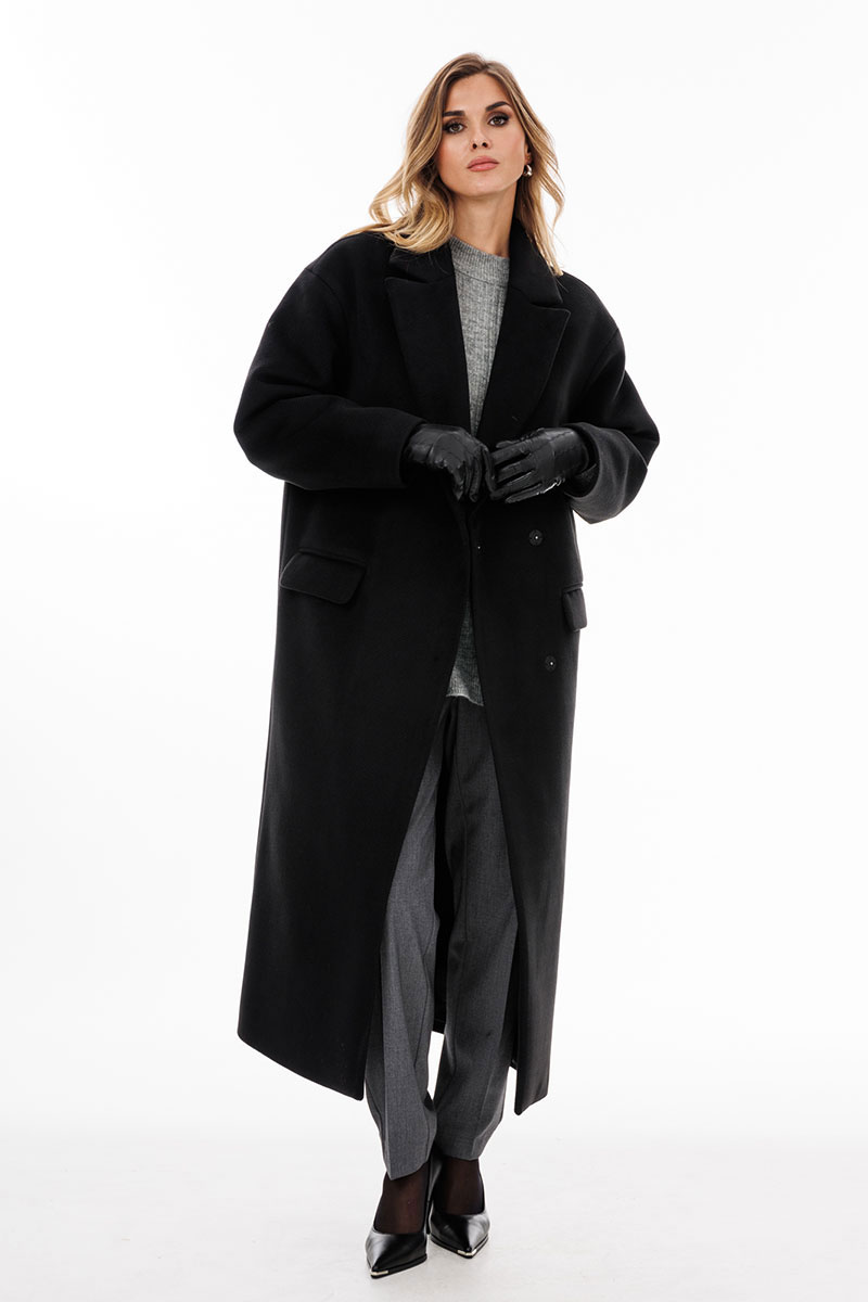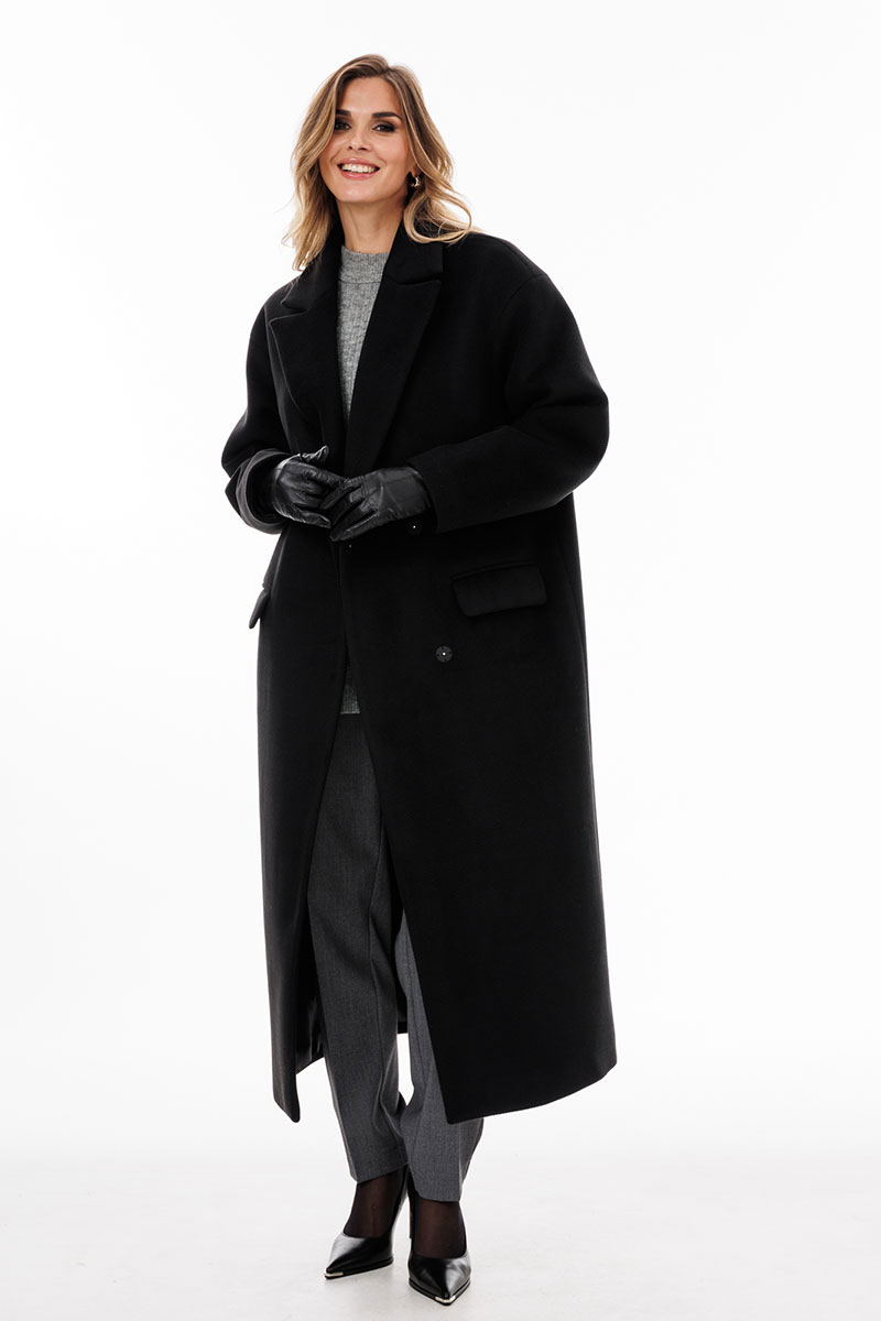 Пальто выполнено из пальтовой ткани в рубчик. Пальто прямого силуэта, длиной до середины икры. Спереди застежка двубортная на пришивные кнопки, горизонтальные прорезные карманы. Спинка со средним швом со шлицей по низу. Воротник пиджачного типа. Плечевой шов спущен. Рукав одношовный. Пальто на притачной по низу подкладке.